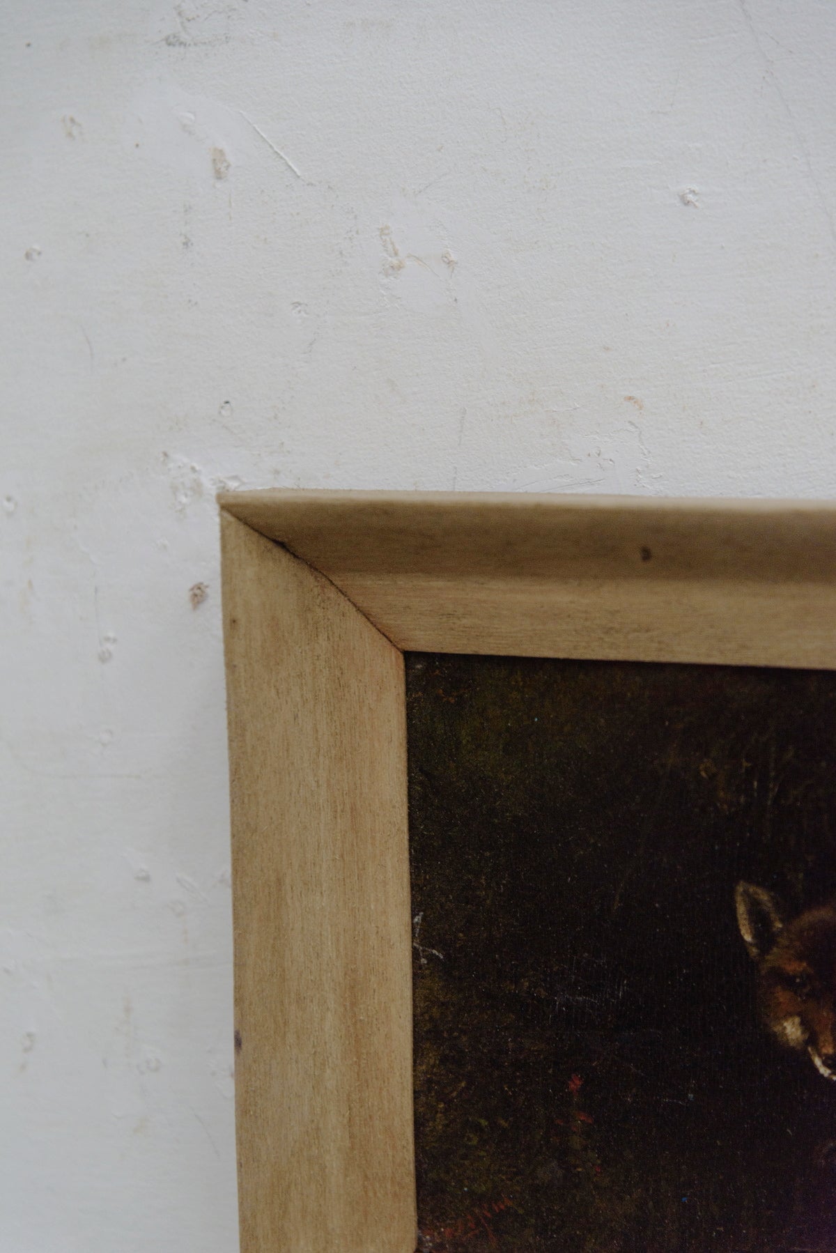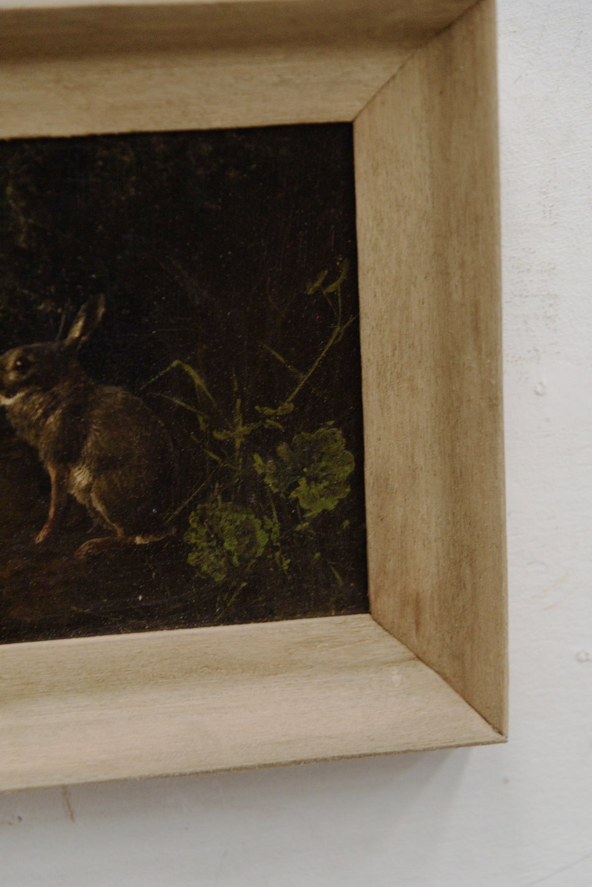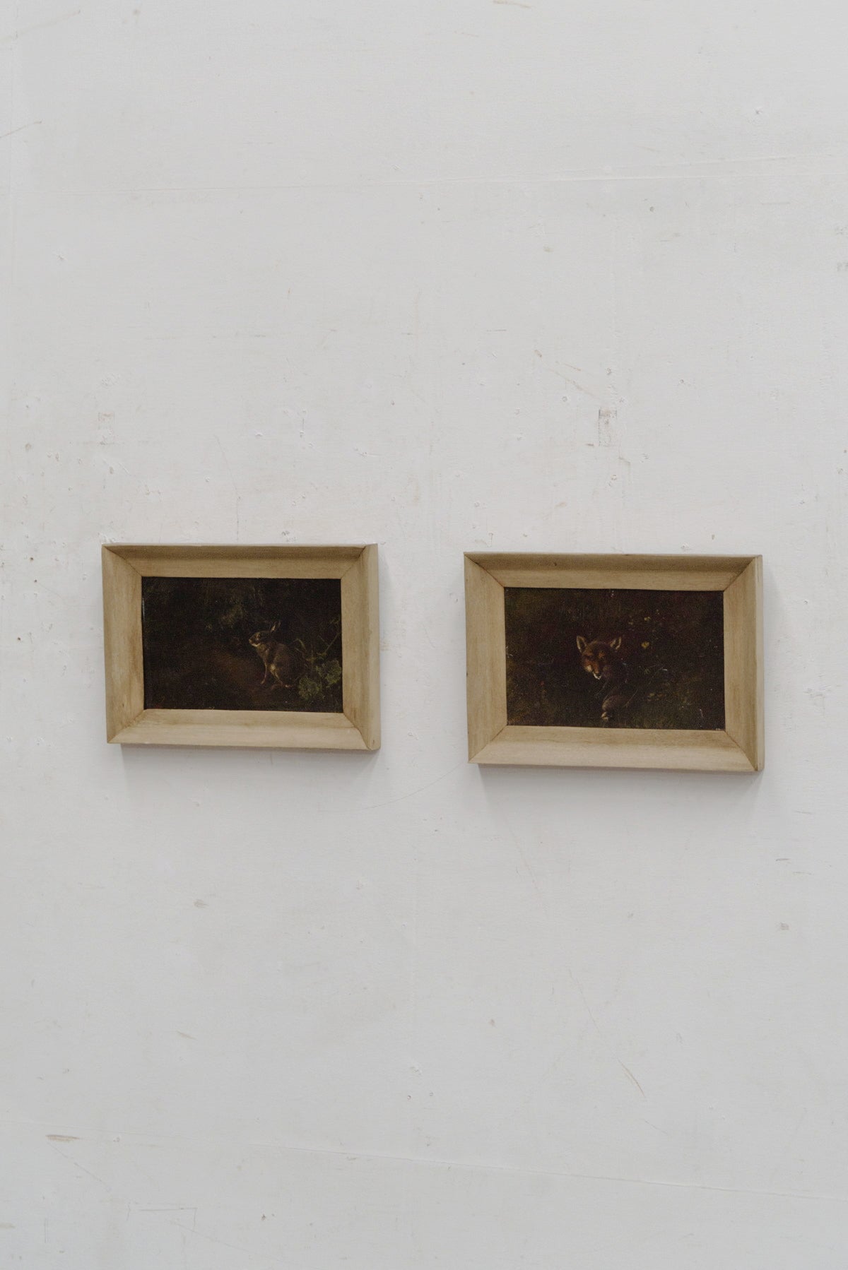 標本画以外では、動物だけが描かれている絵画はアンティークではめったに出ません。こちらは森の暗がりから姿を見せたキツネとウサギの絵。自然の中の動物の静けさと生き生きした表情が描かれています。