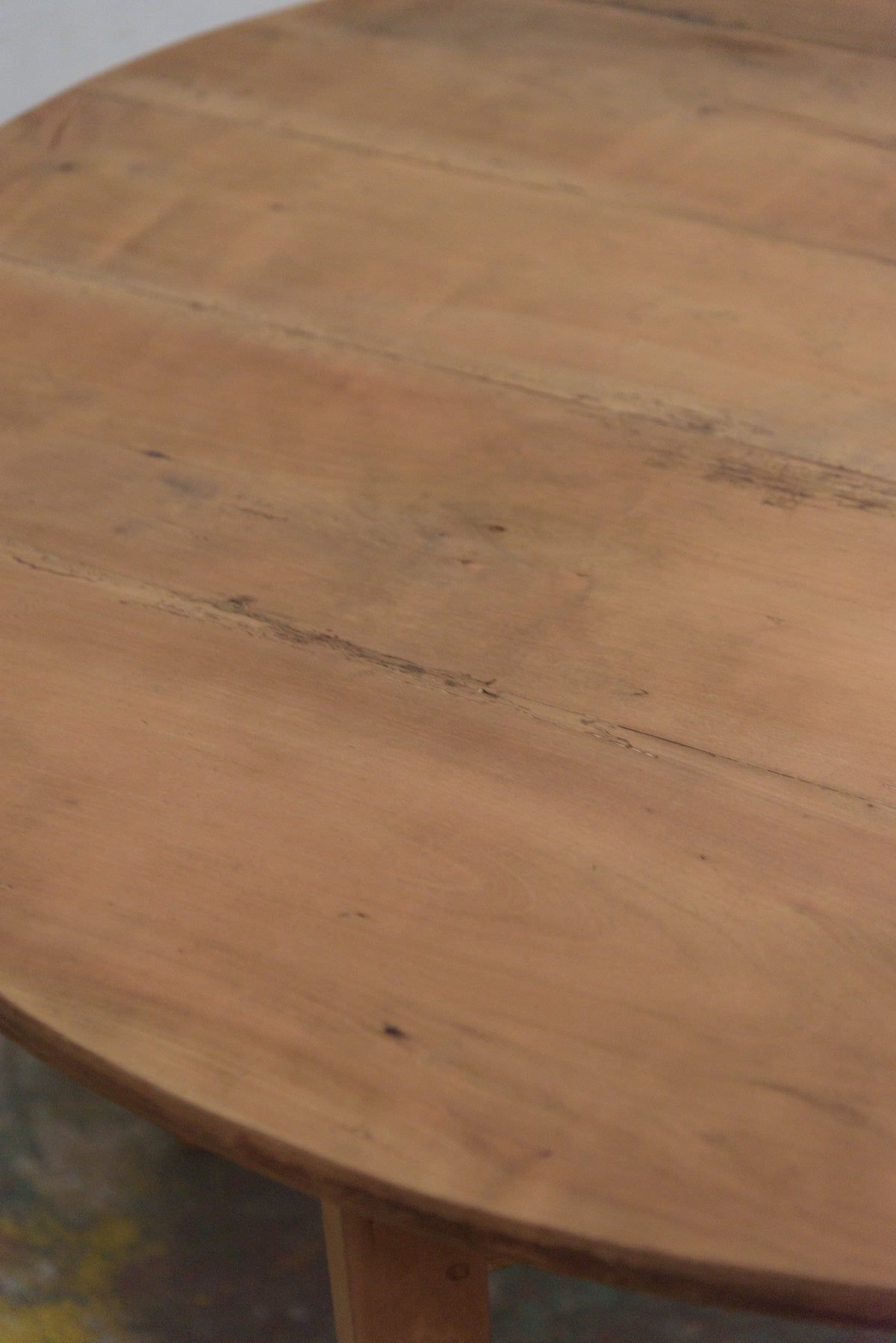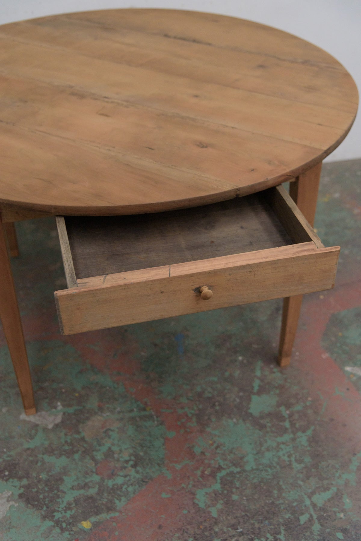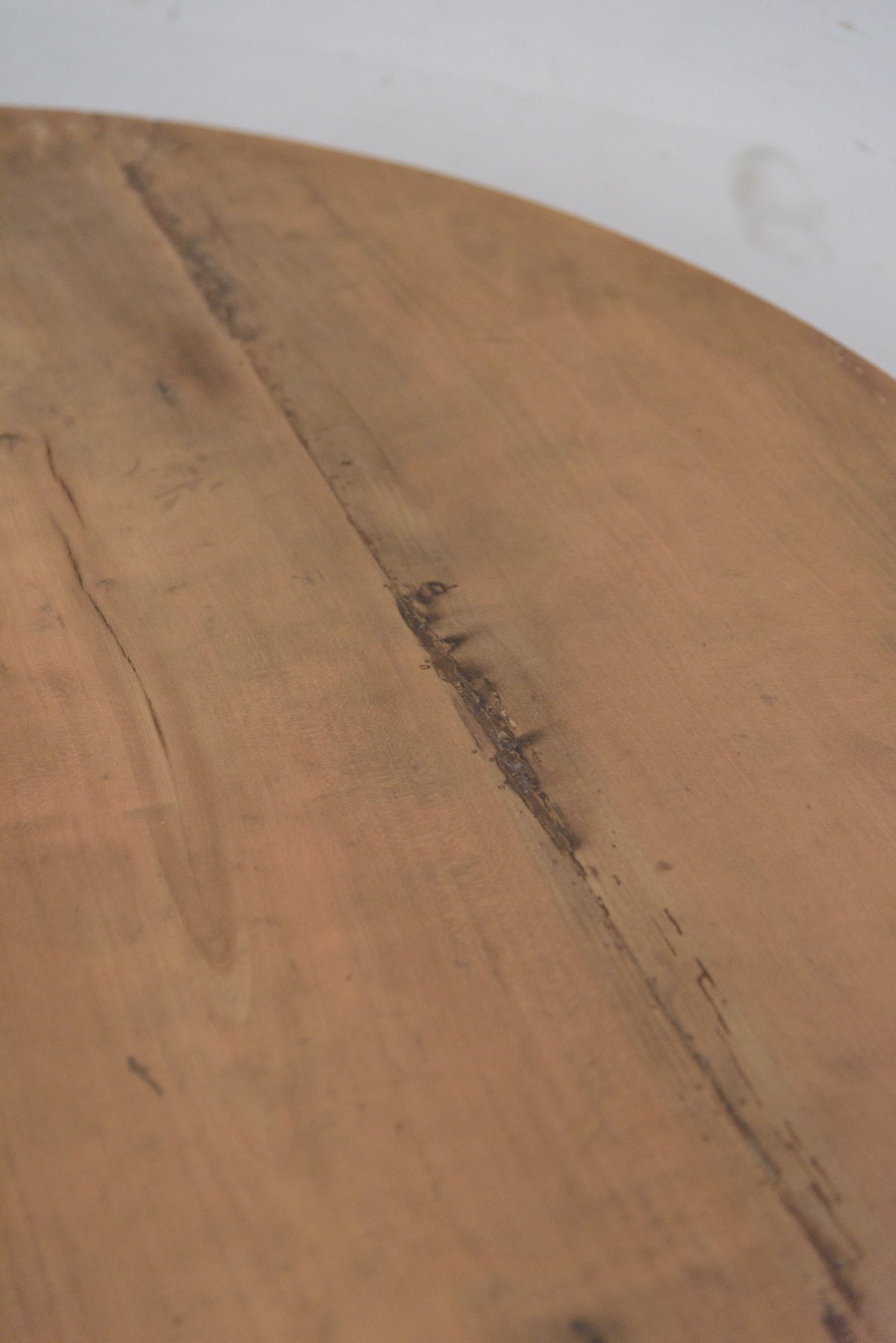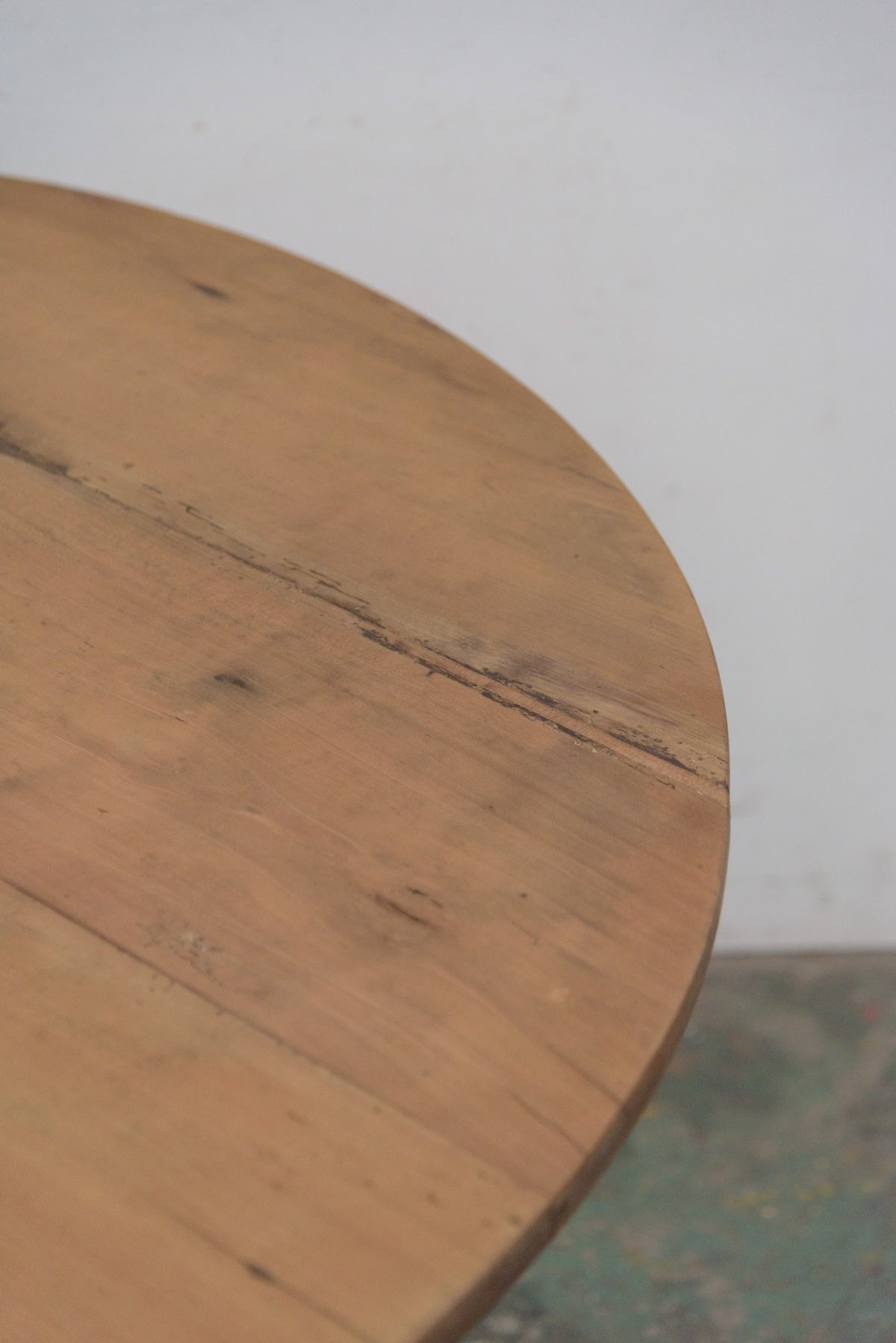 19世紀前半の古いラウンドテーブルでシンプルな脚のものは比較的少なく、こちらは特に綺麗な細い脚のたたずまいの良いテーブルです。材質はチェリー、虫食い跡がありますがパテ埋めされています。