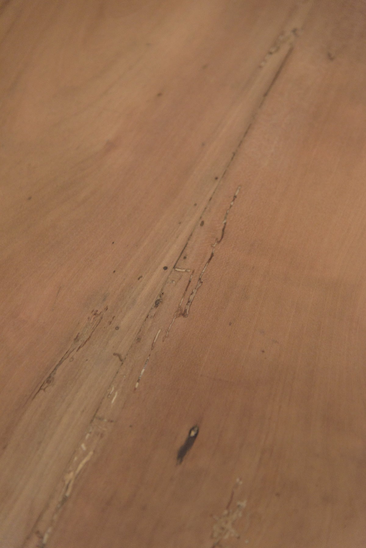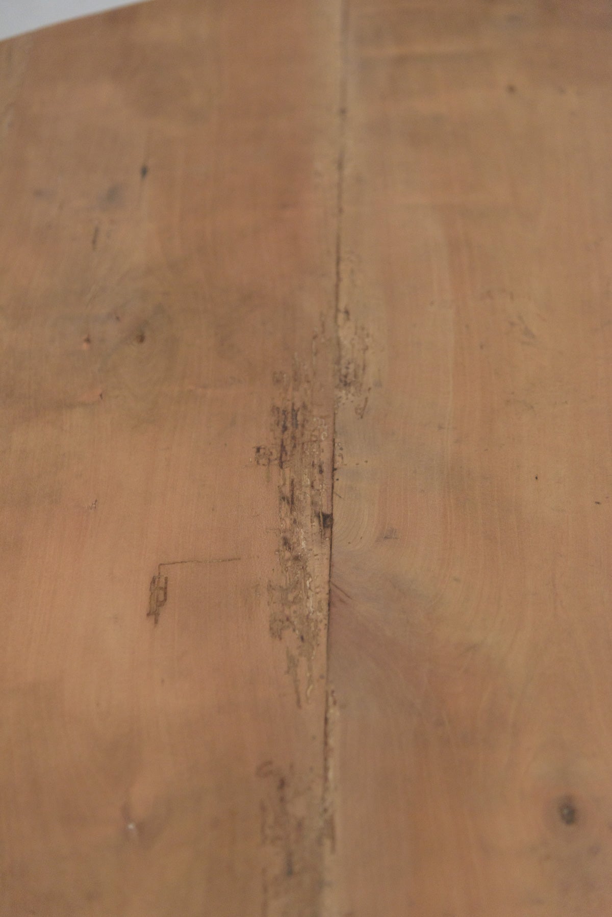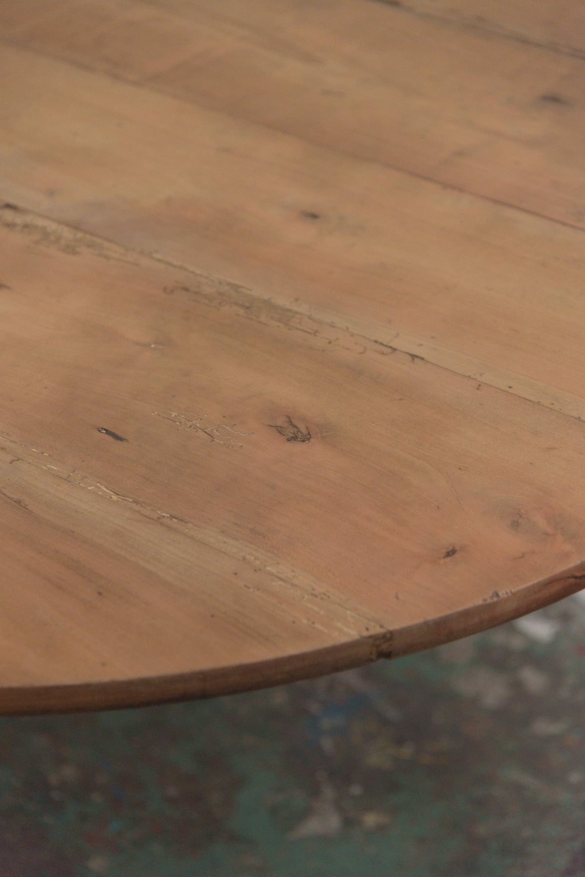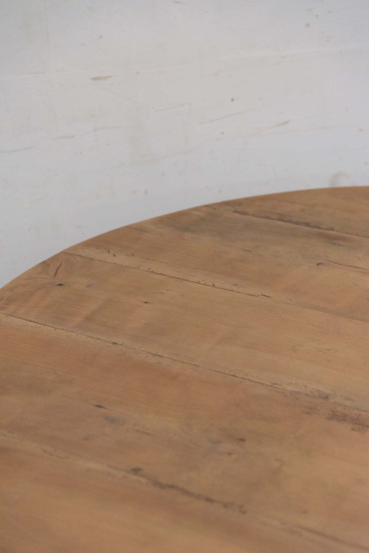 19世紀前半の古いラウンドテーブルでシンプルな脚のものは比較的少なく、こちらは特に綺麗な細い脚のたたずまいの良いテーブルです。材質はチェリー、虫食い跡がありますがパテ埋めされています。