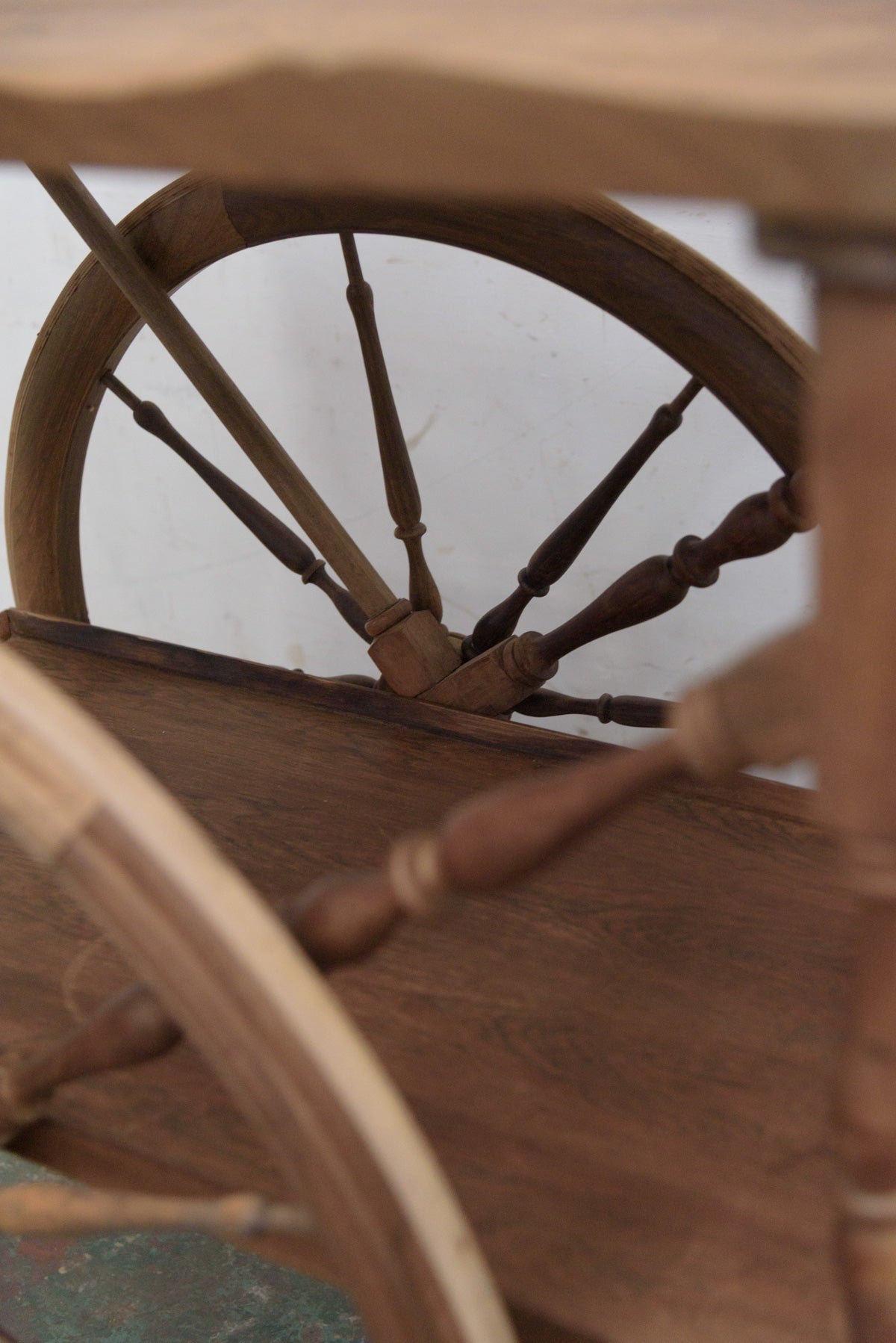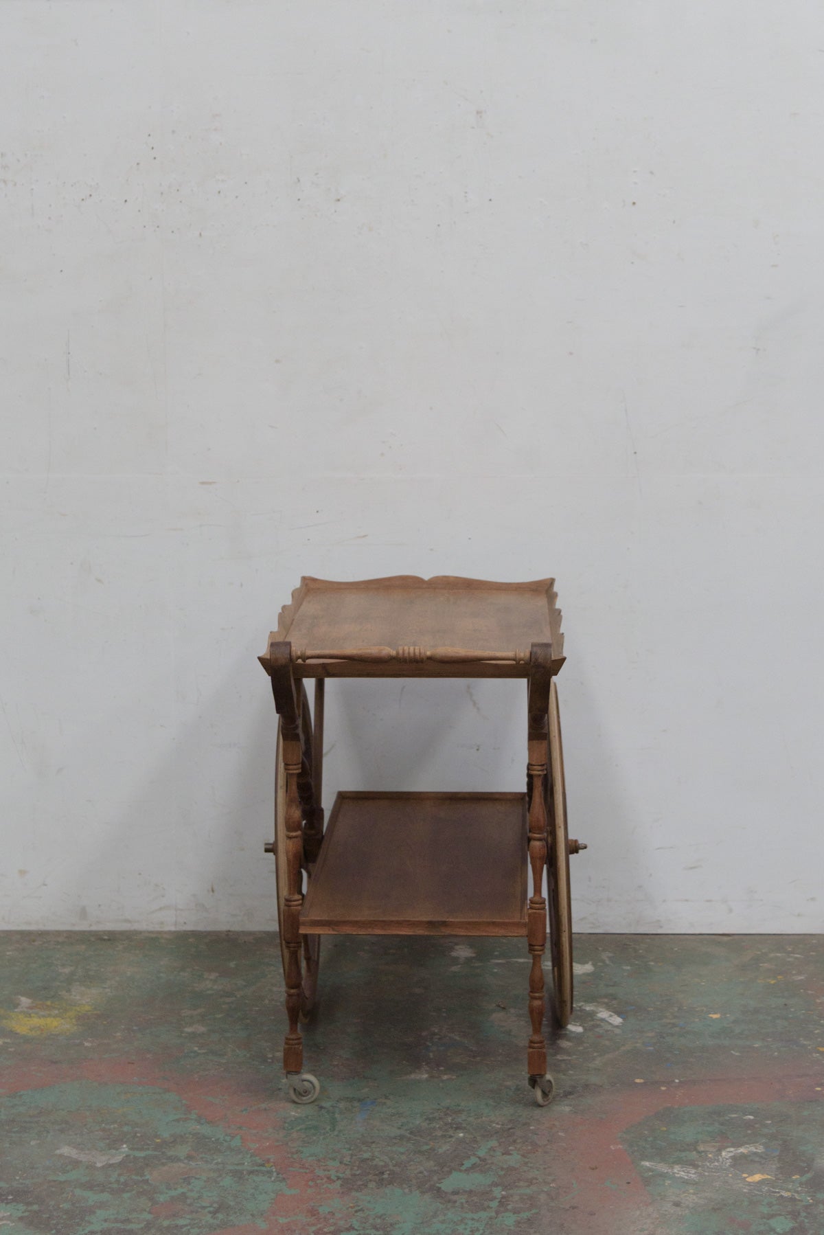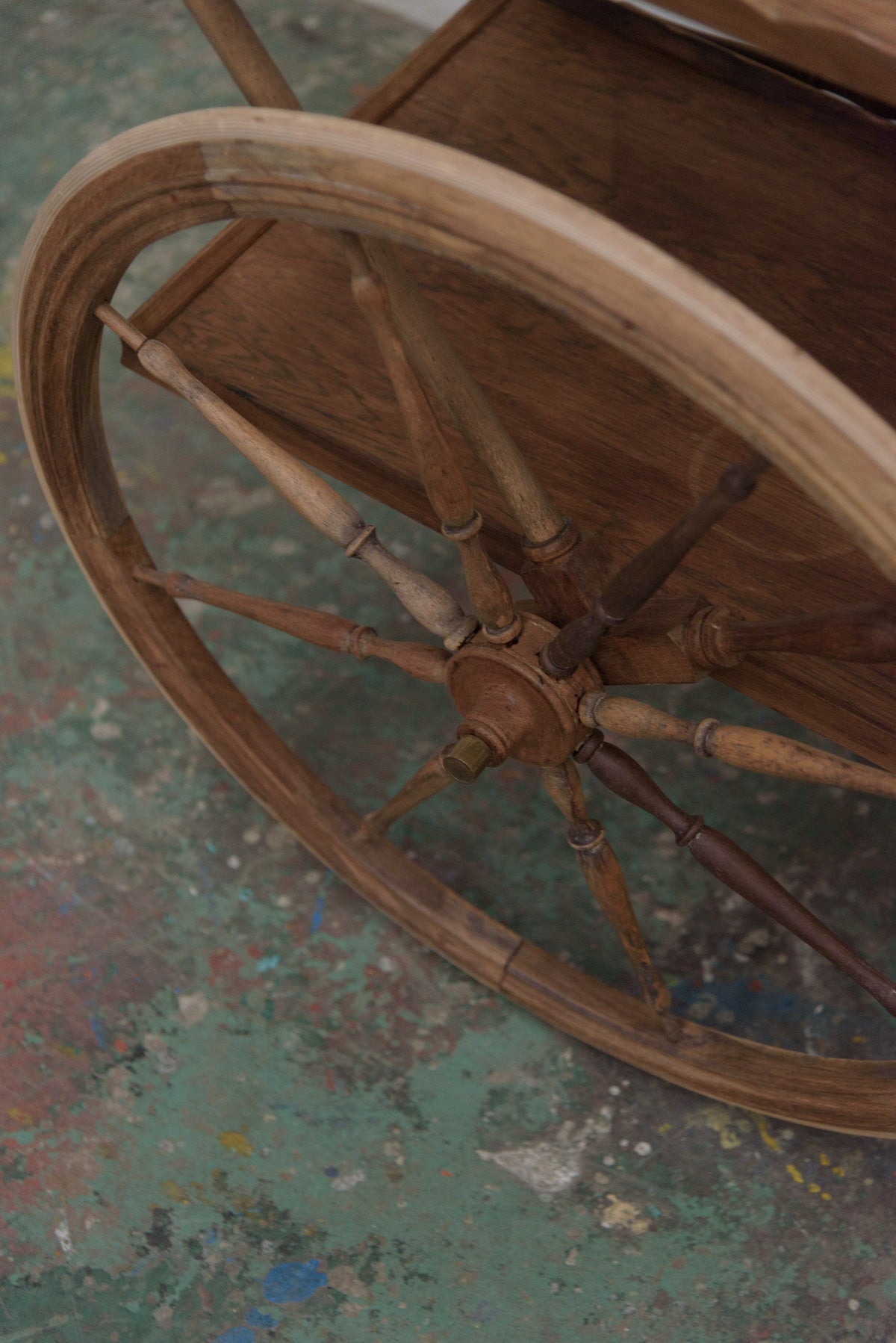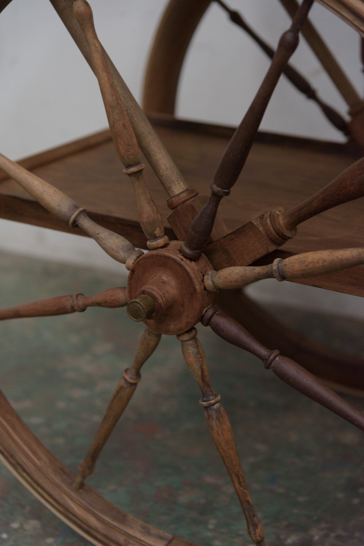 めずらしい大きな木製の車輪、全体的にシャープな印象のオブジェのような存在感のワゴンです。