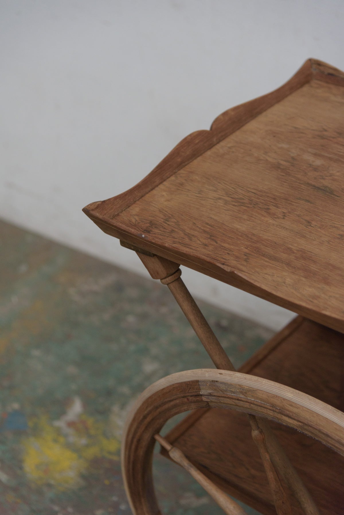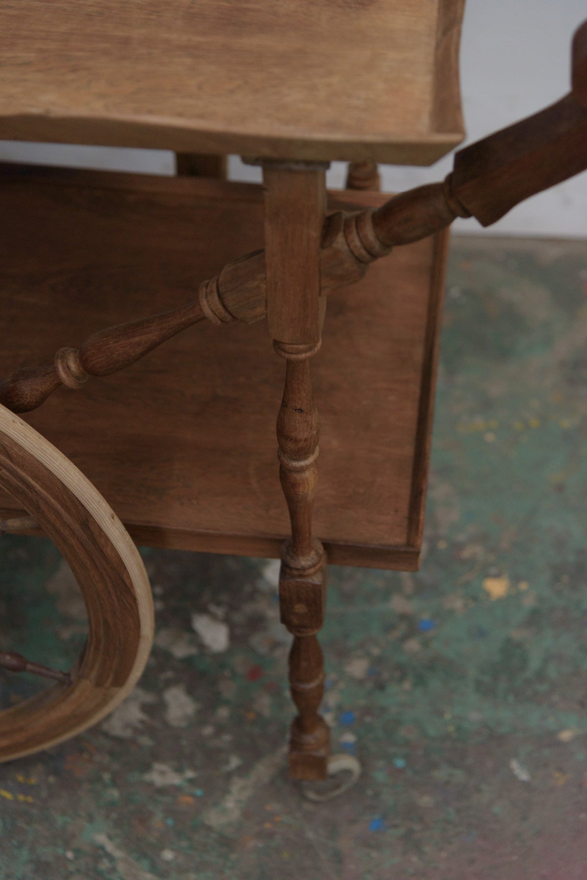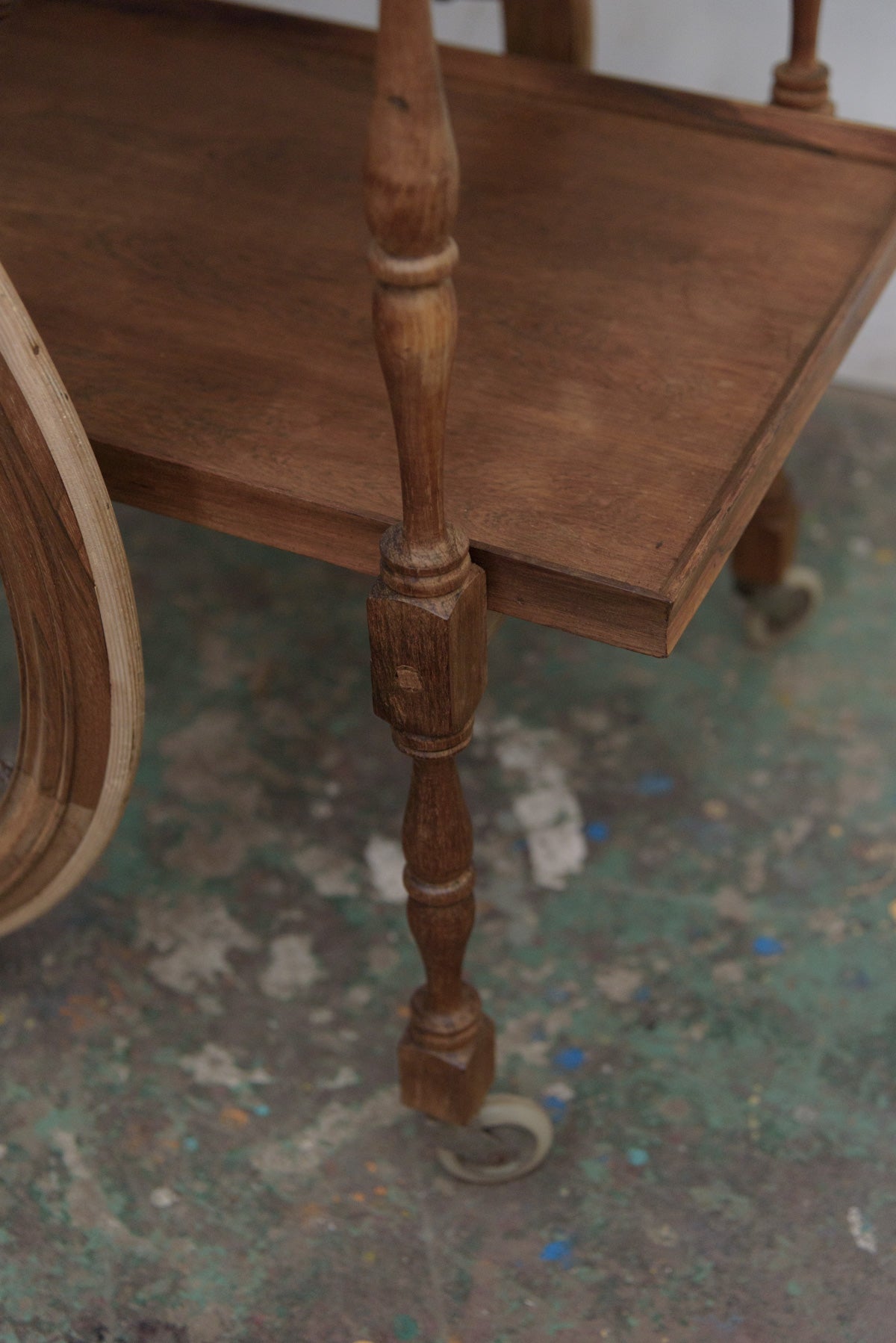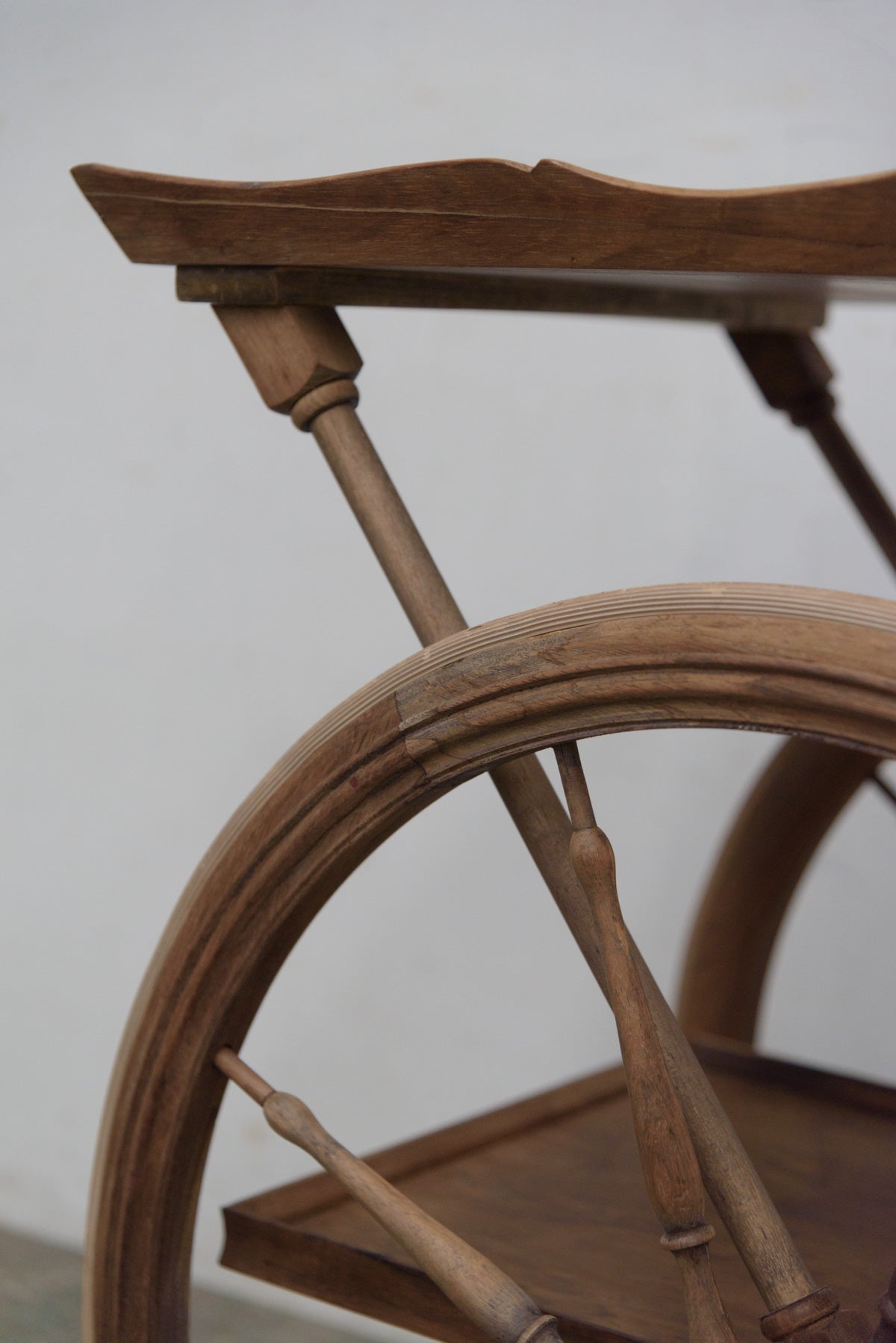 めずらしい大きな木製の車輪、全体的にシャープな印象のオブジェのような存在感のワゴンです。