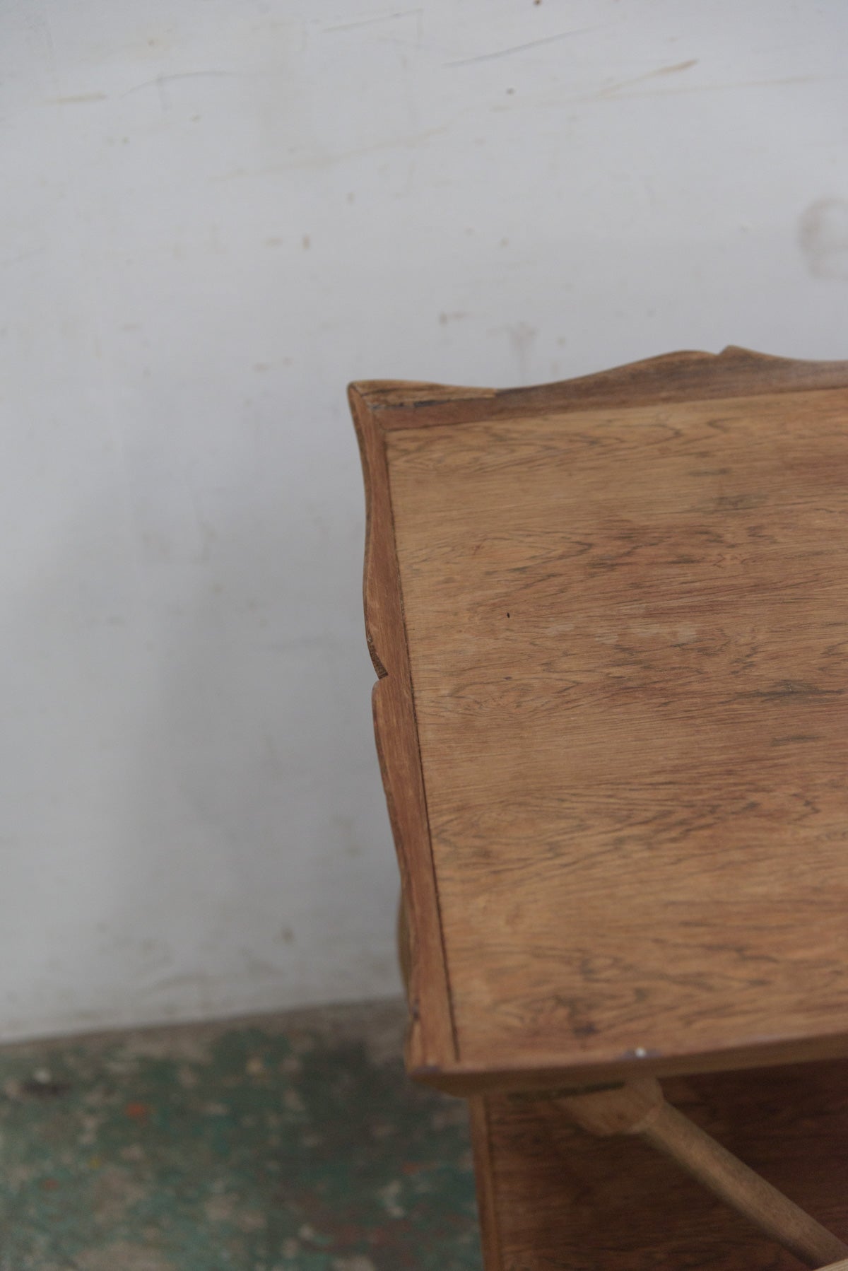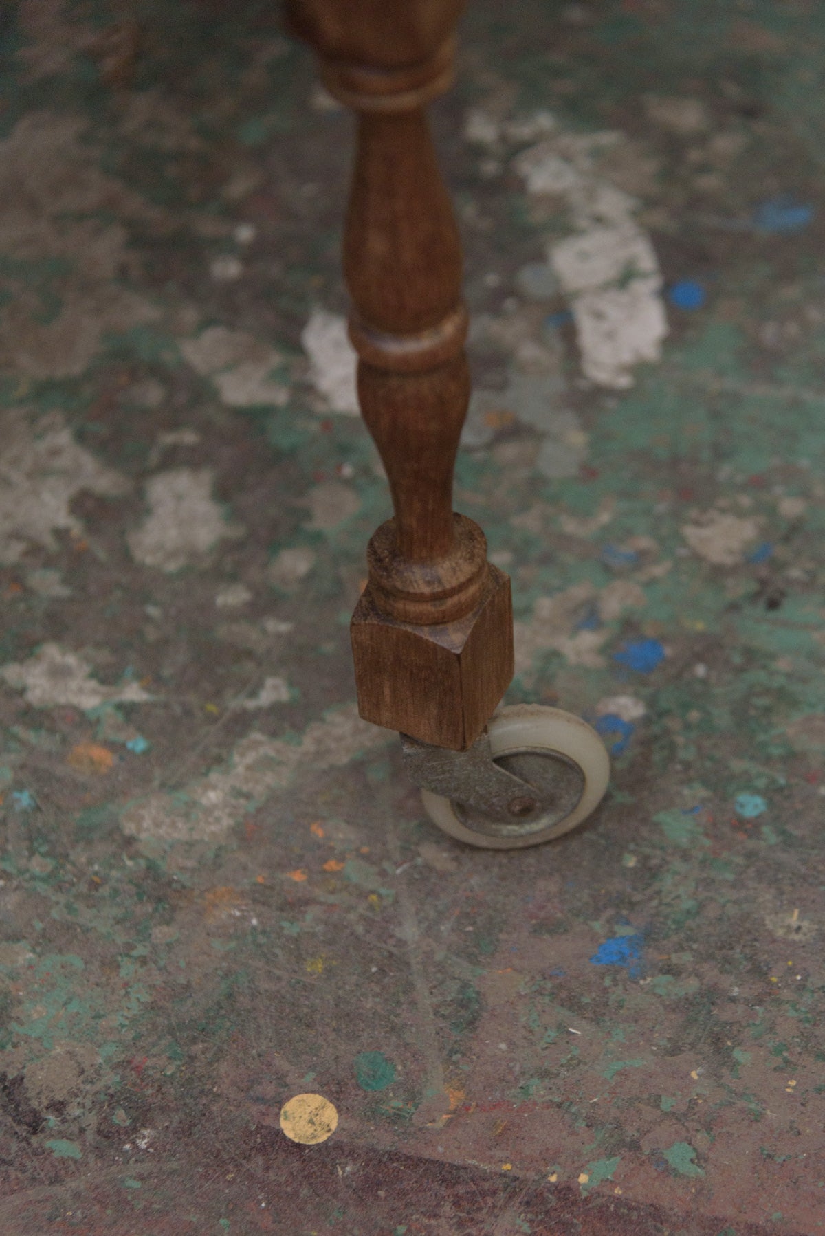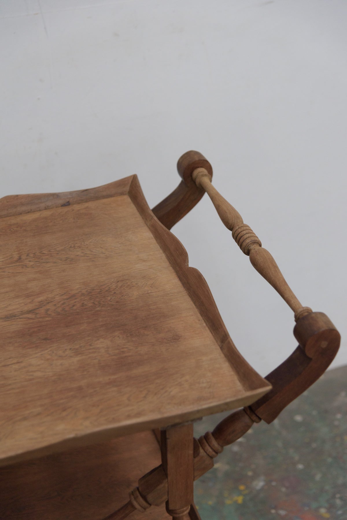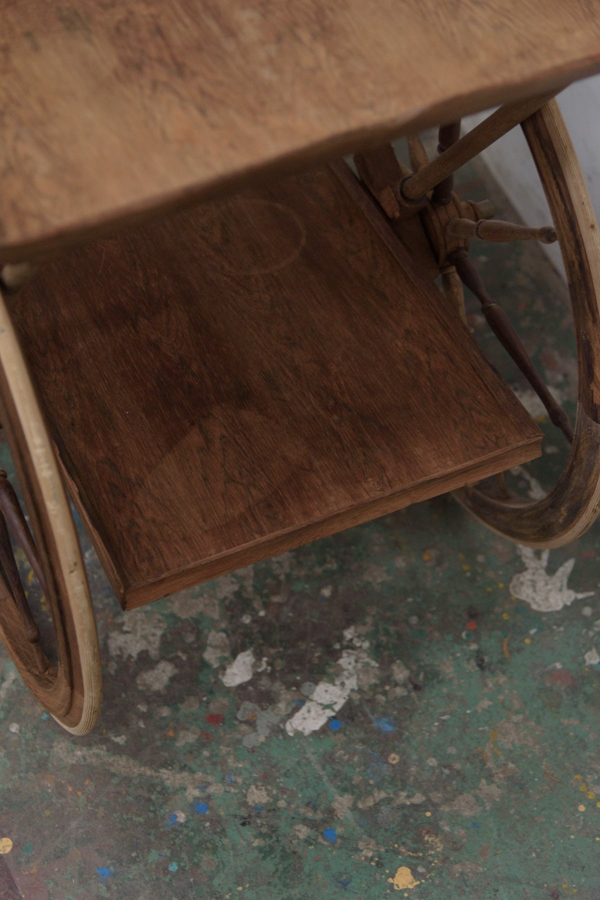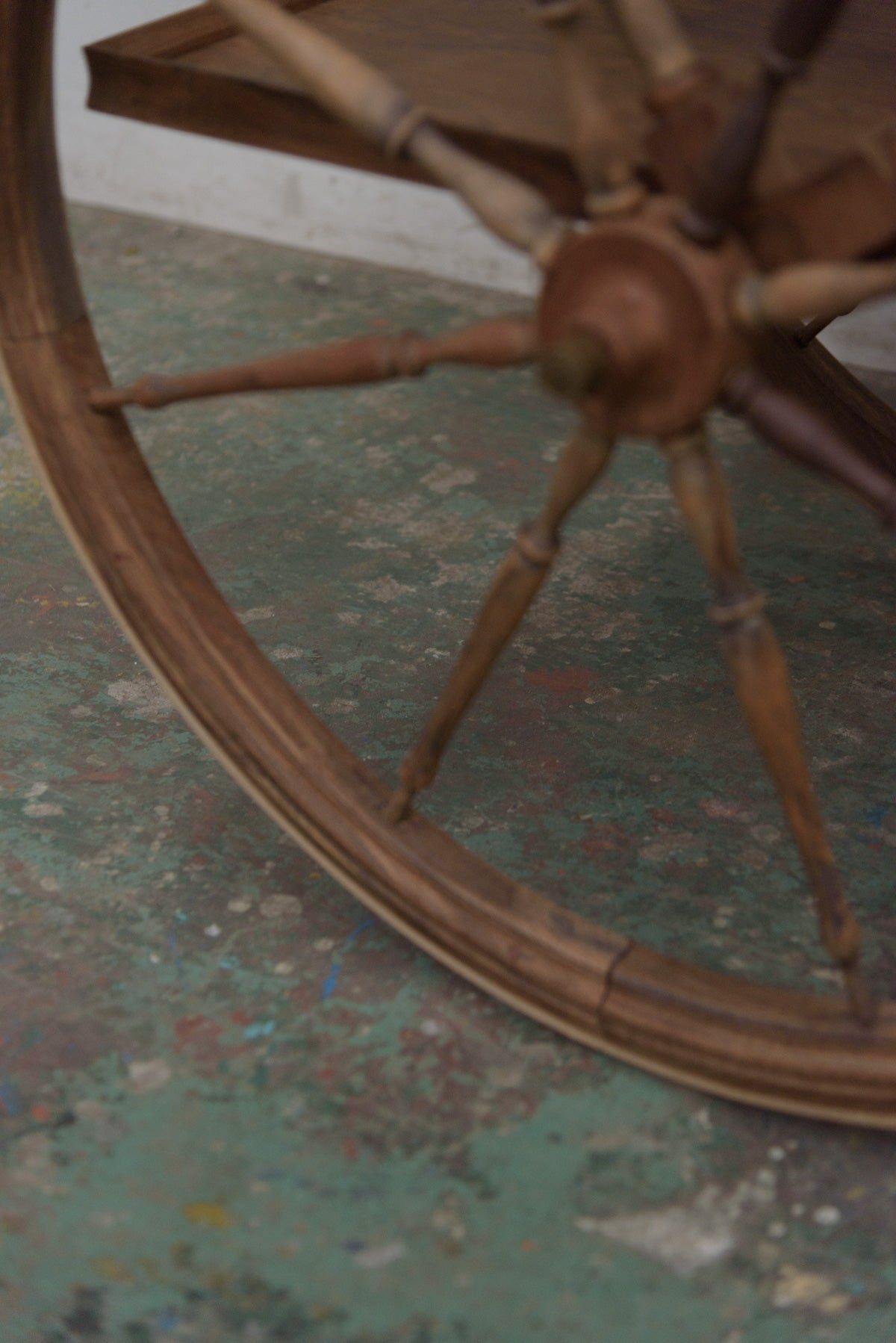 めずらしい大きな木製の車輪、全体的にシャープな印象のオブジェのような存在感のワゴンです。