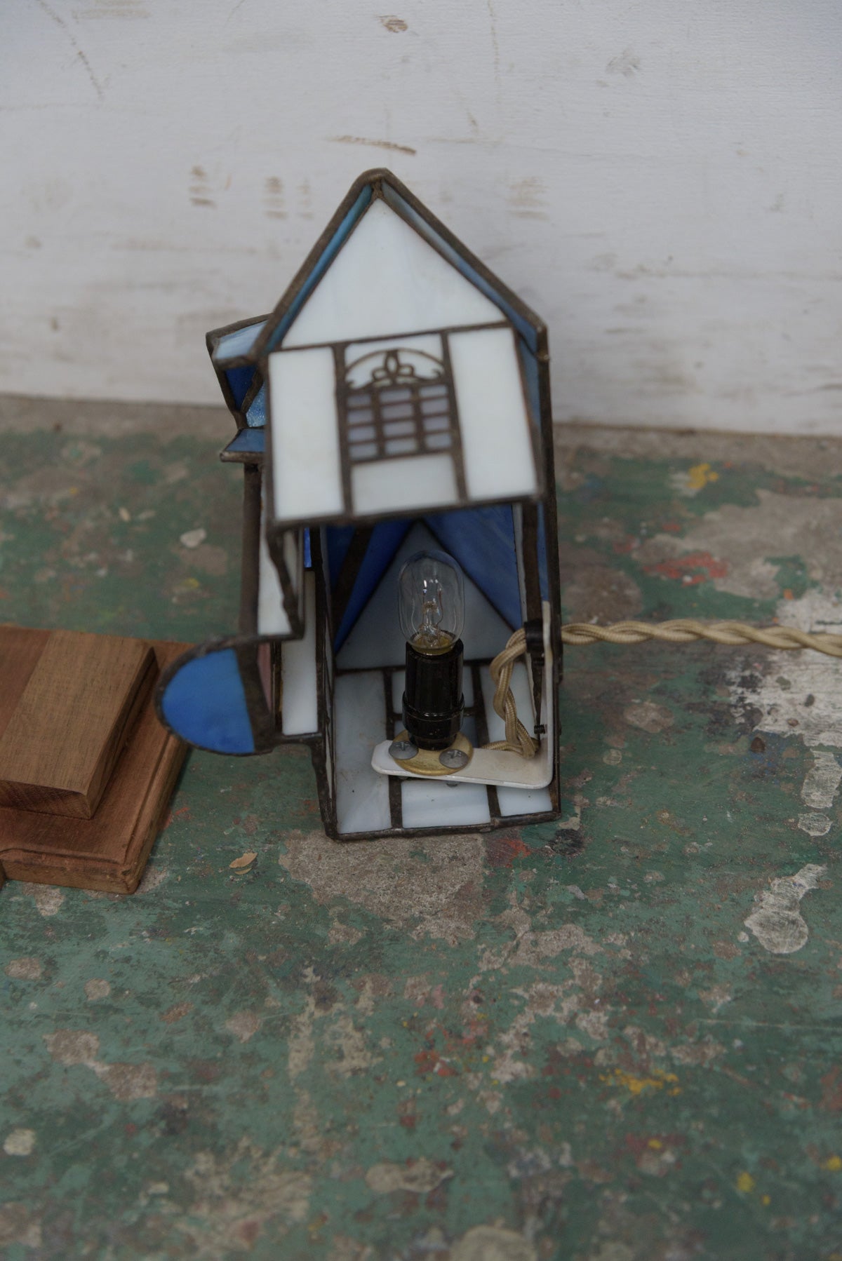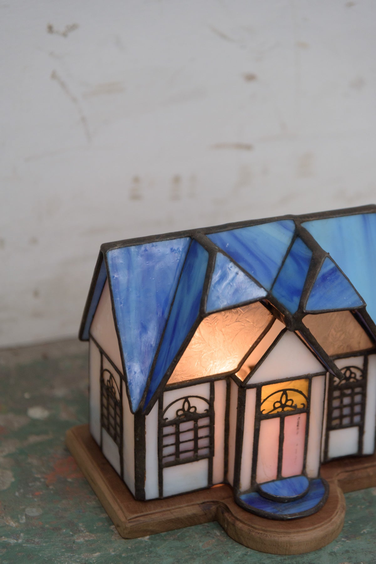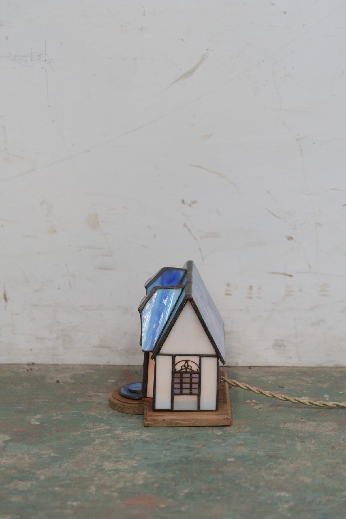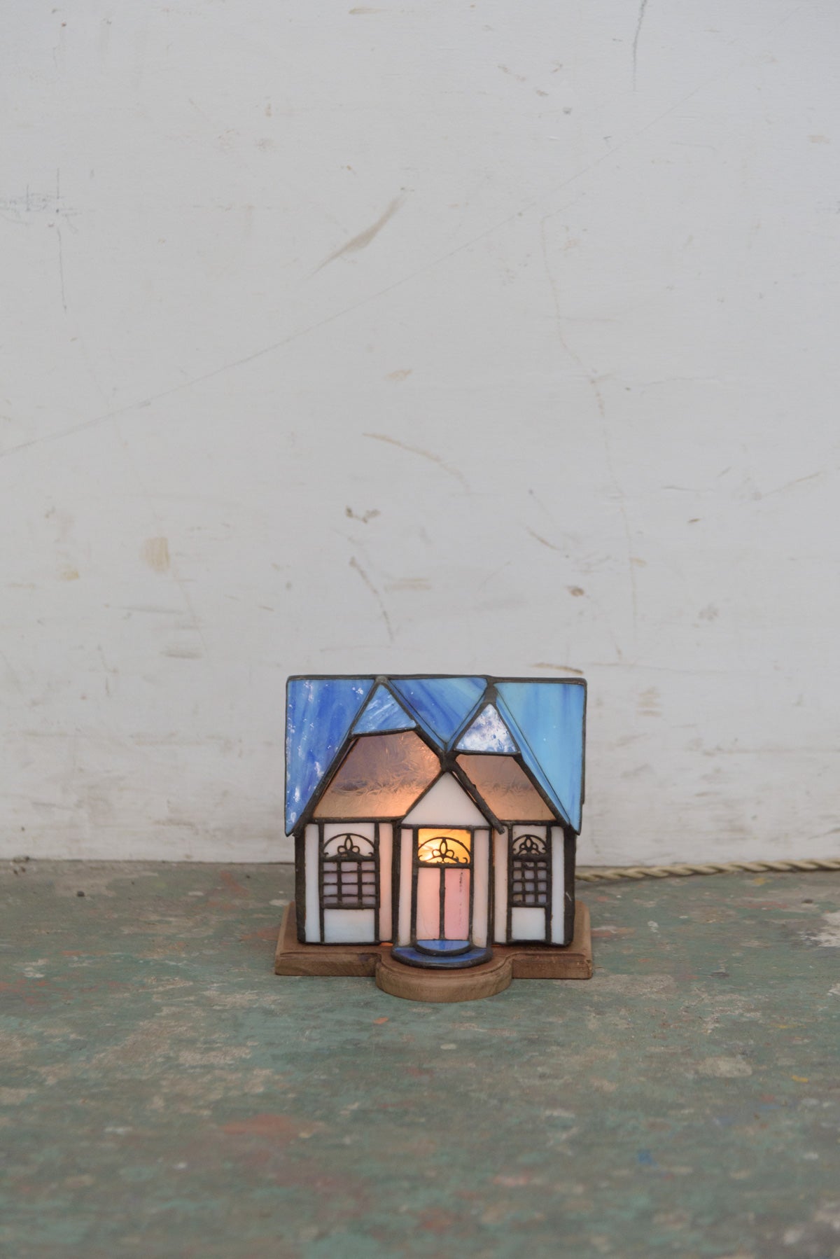 1960〜80年代頃のヴィンテージアイテムと考えられ、実用照明というよりは空間に温度を添える装飾灯。青い屋根と乳白色の壁、やわらかな灯りがともる玄関部分が印象的で、どこか物語性を感じさせる佇まいです。木製のベースは当方で製作、電気部品は日本の新しいものに交換しいてます。口金はE12、コードの長さは約2.5mでコンセントプラグ仕様。コンセントから30cm程度の位置にスイッチ付き。