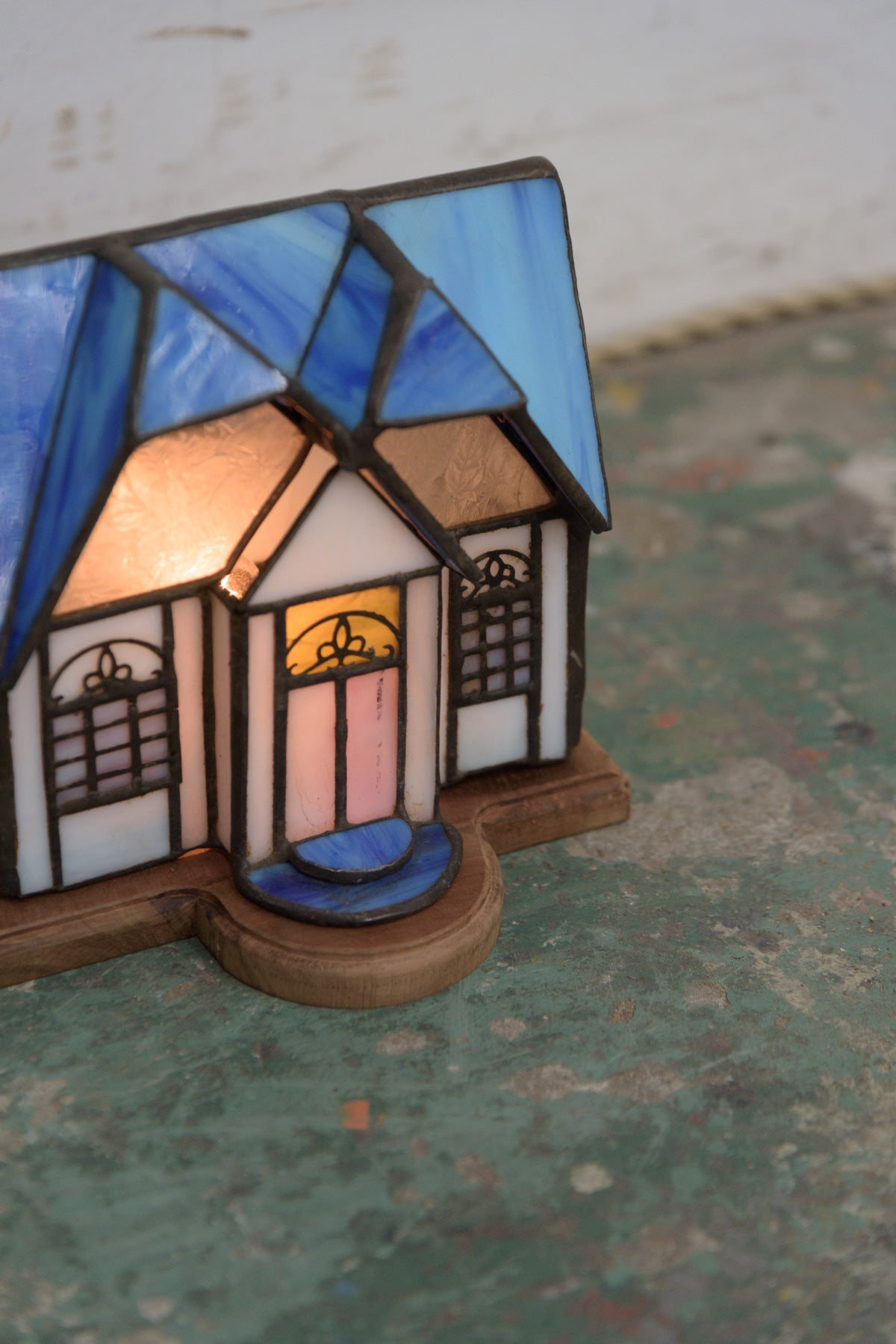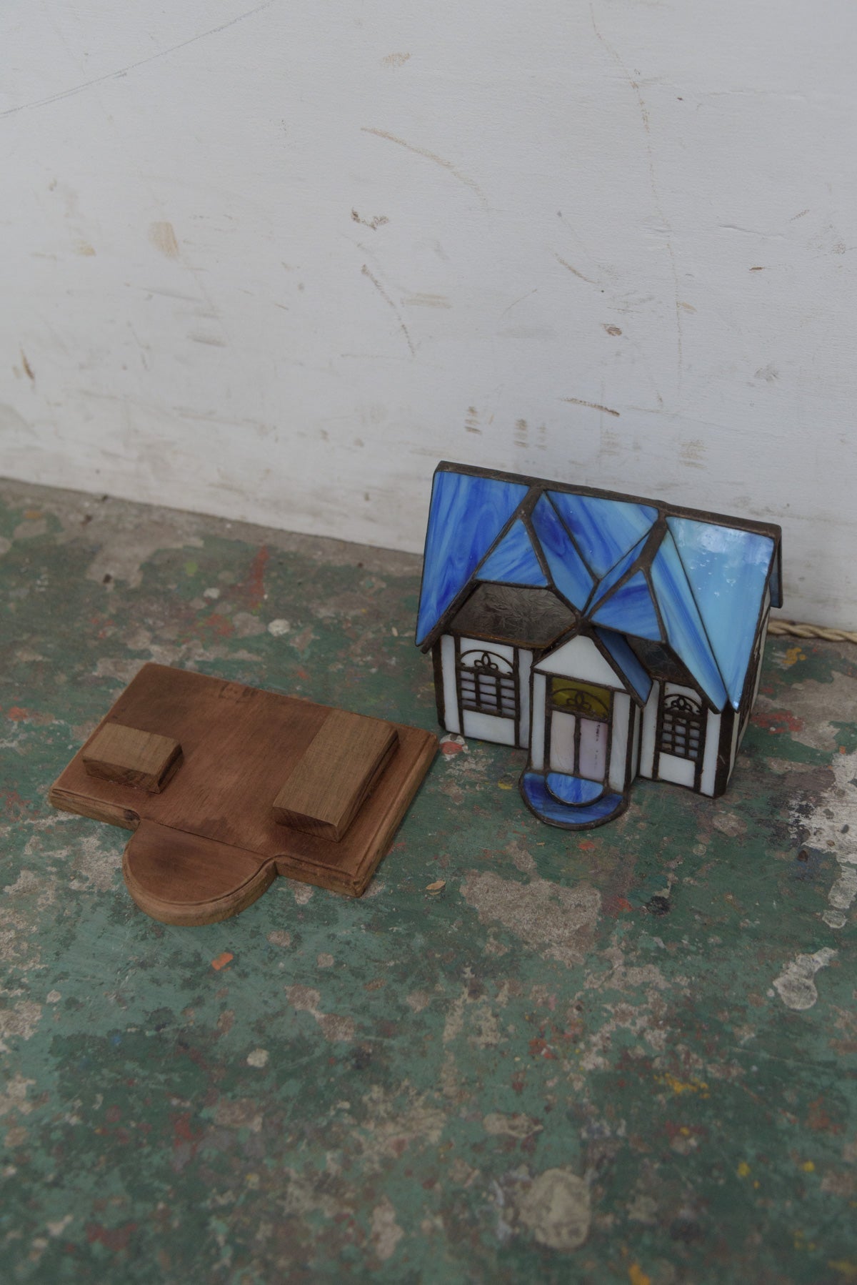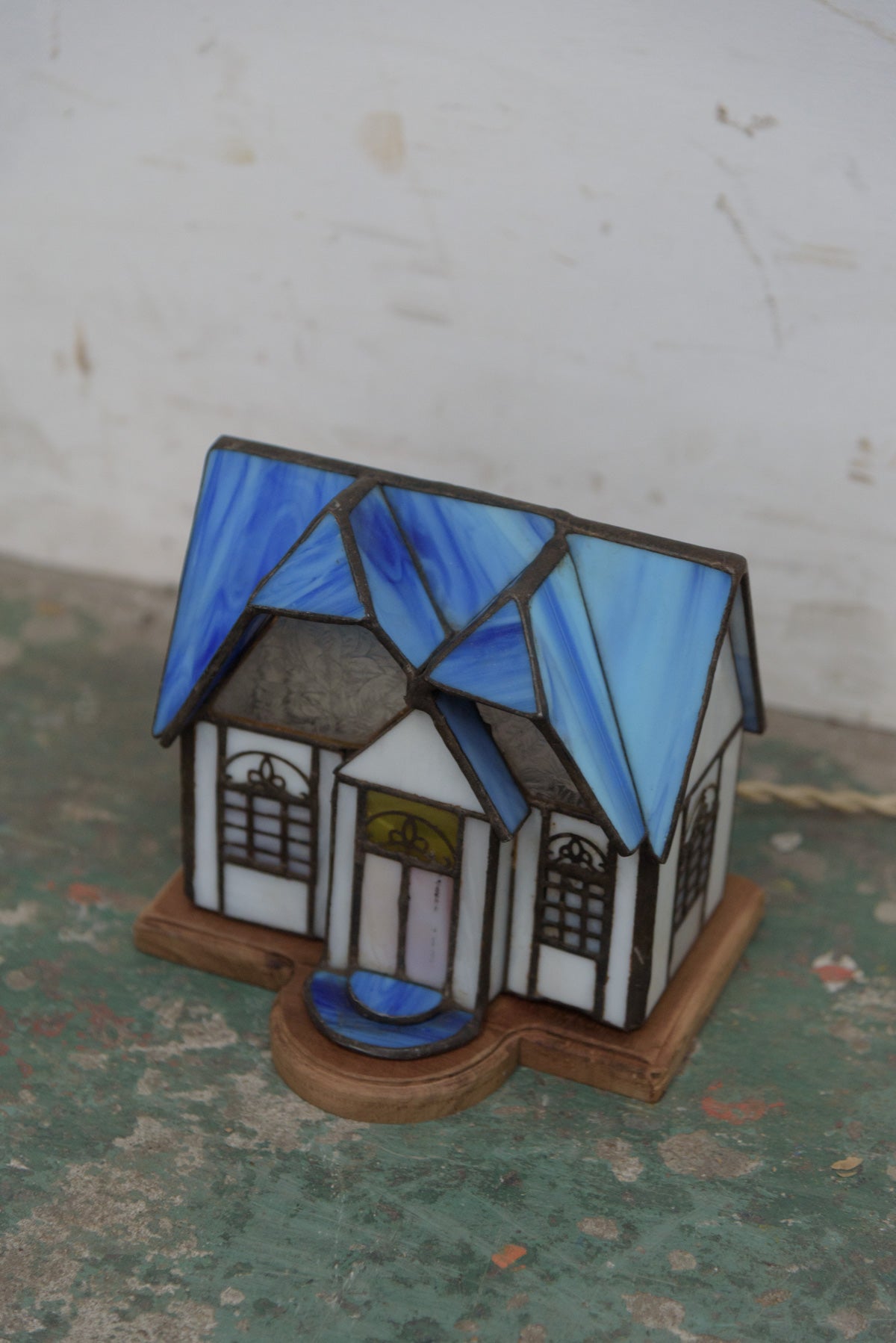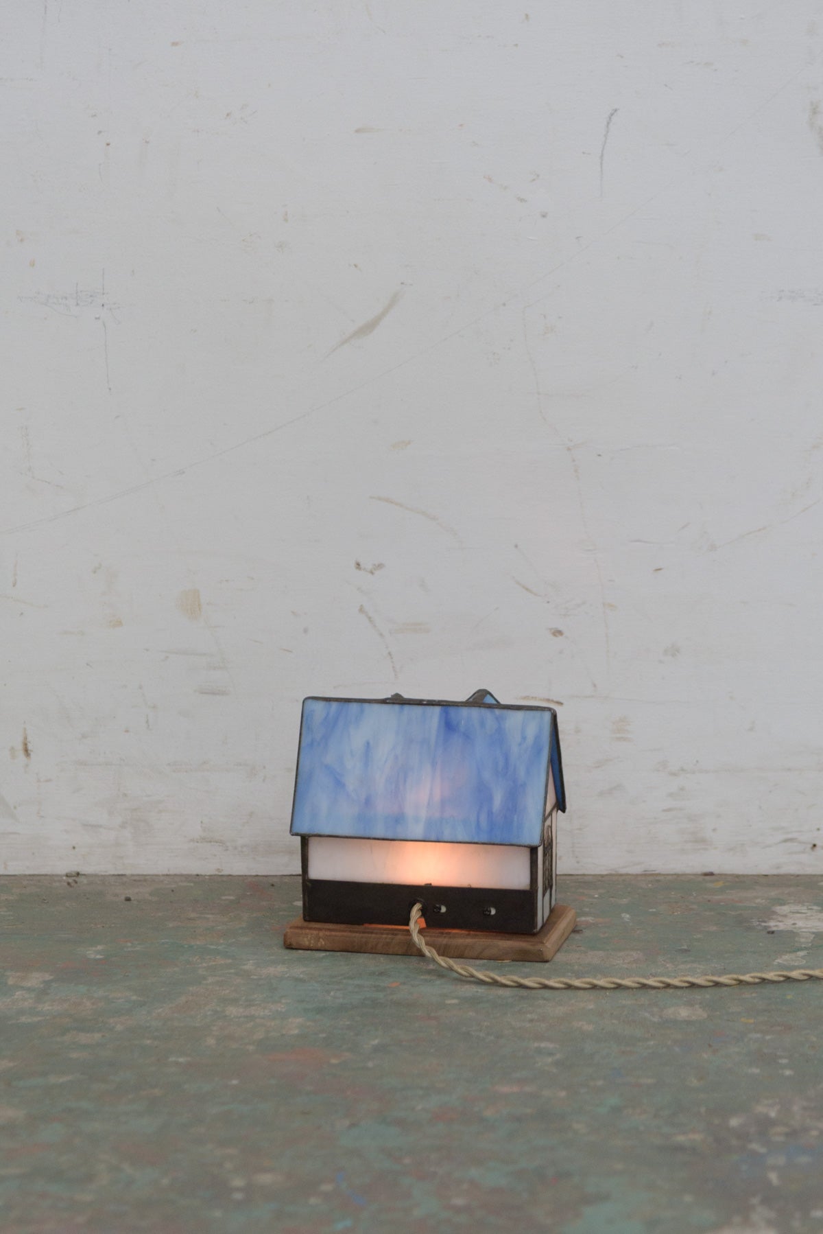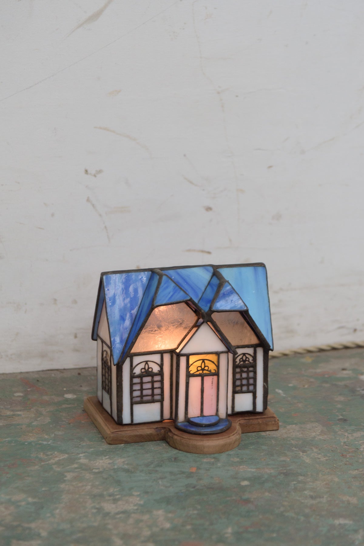1960〜80年代頃のヴィンテージアイテムと考えられ、実用照明というよりは空間に温度を添える装飾灯。青い屋根と乳白色の壁、やわらかな灯りがともる玄関部分が印象的で、どこか物語性を感じさせる佇まいです。木製のベースは当方で製作、電気部品は日本の新しいものに交換しいてます。口金はE12、コードの長さは約2.5mでコンセントプラグ仕様。コンセントから30cm程度の位置にスイッチ付き。