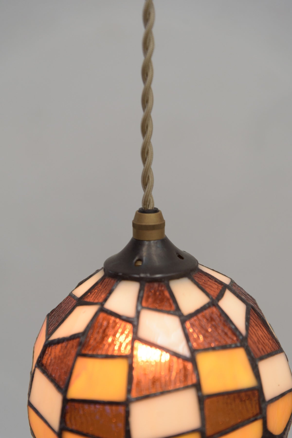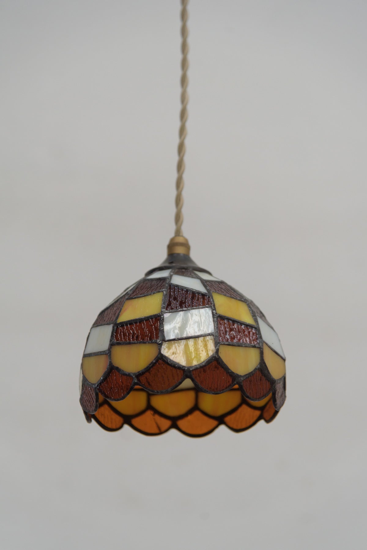 ブラウン系のモザイクステンドグラスの小さなシェードです。電気部品は日本の新しいものに交換しています。口金はE17で引っ掛けシーリング仕様。コードの長さは約2mです。