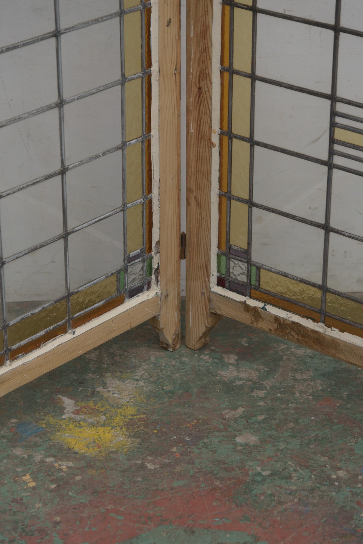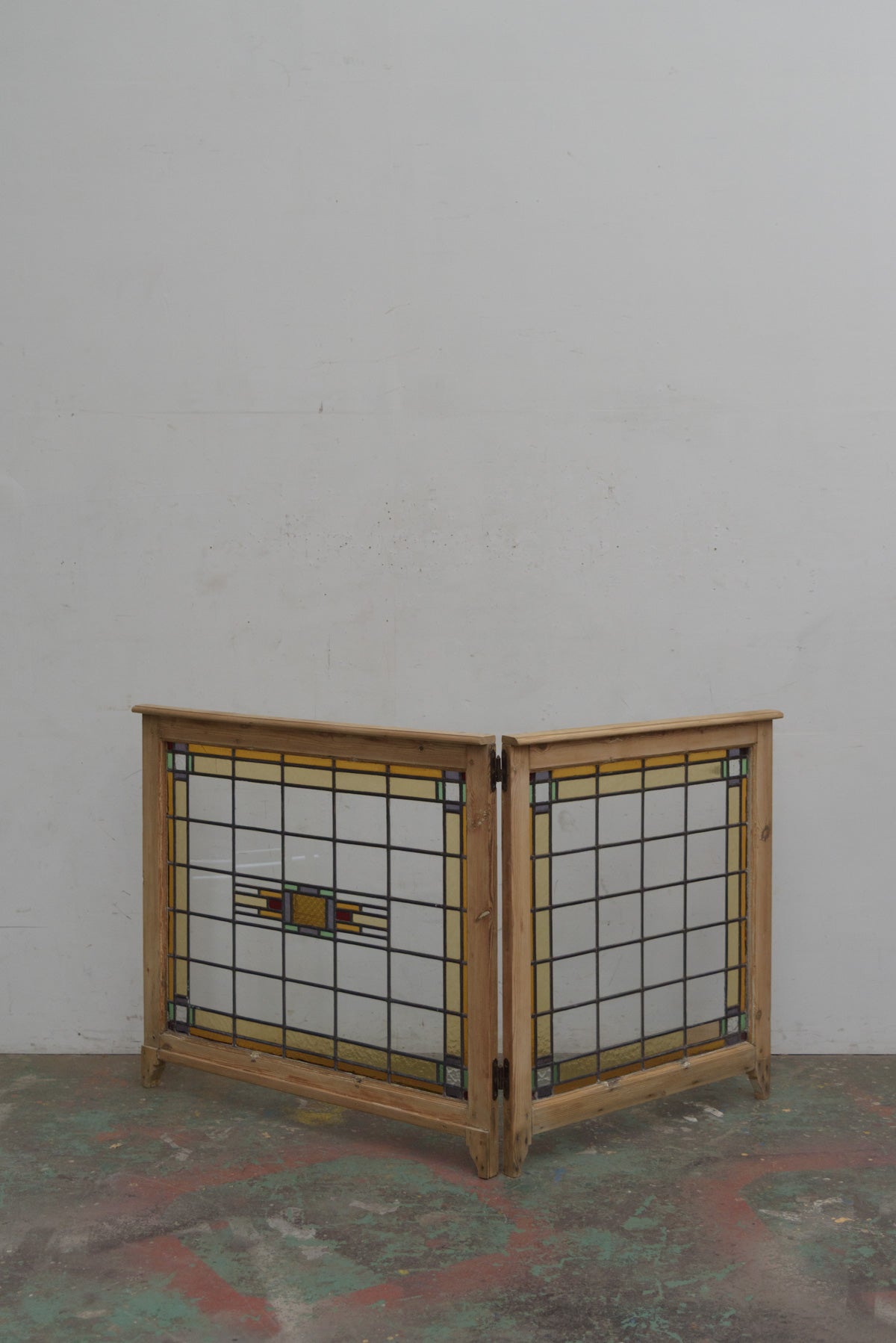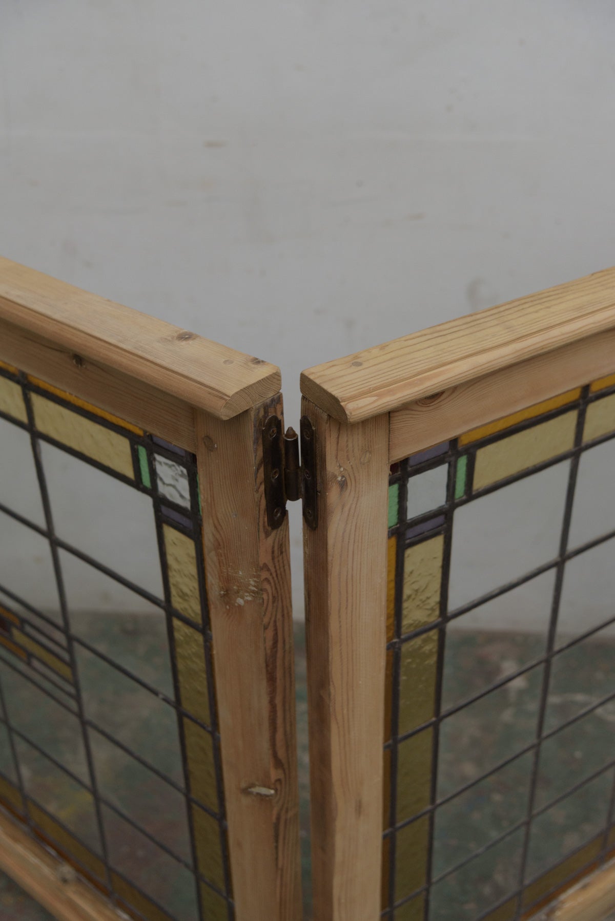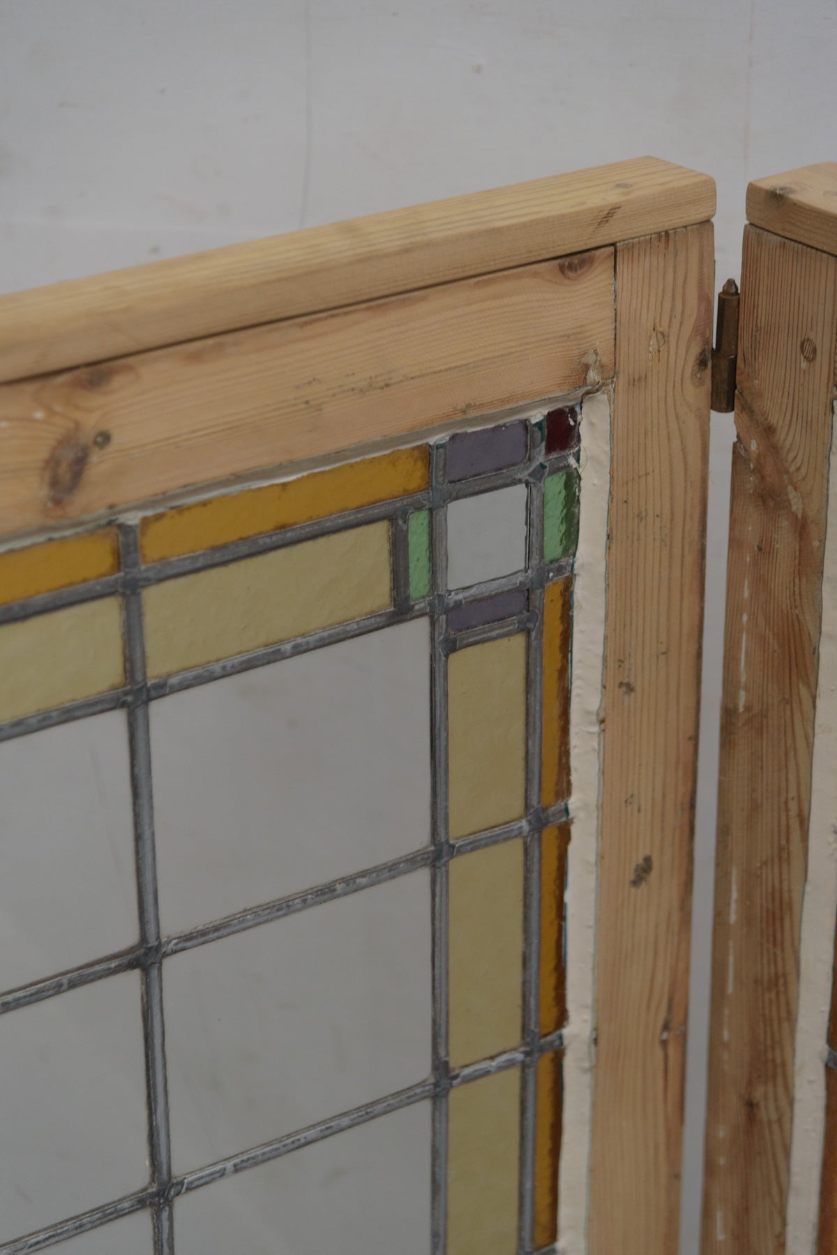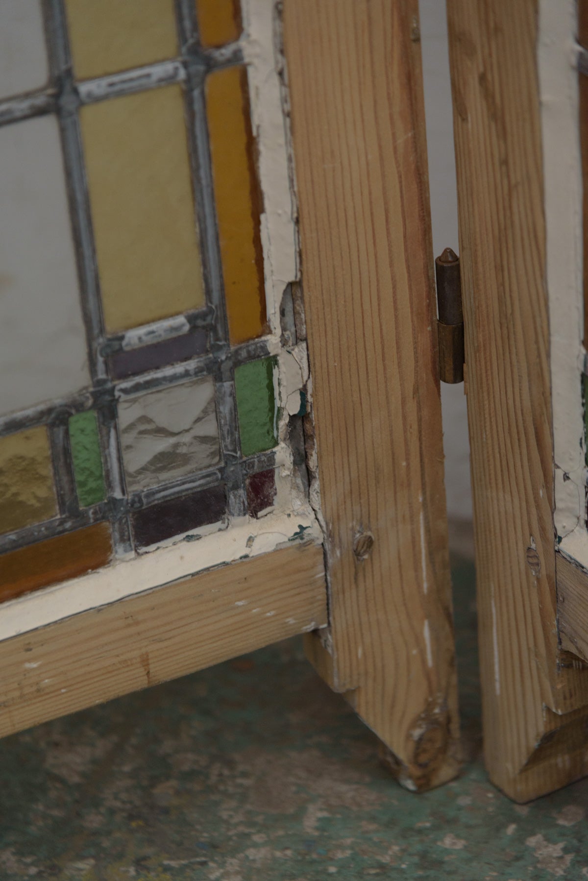 2枚を丁番でつなげていますので、開くと自立します。数か所小さな割れがありますが、派手すぎないアンティークのステンドグラスが魅力的で、間仕切りや目隠し等、実用性も兼ね備えています。丁番は差し込むだけの作りですので、上下にずらすと2枚に分割もできます。