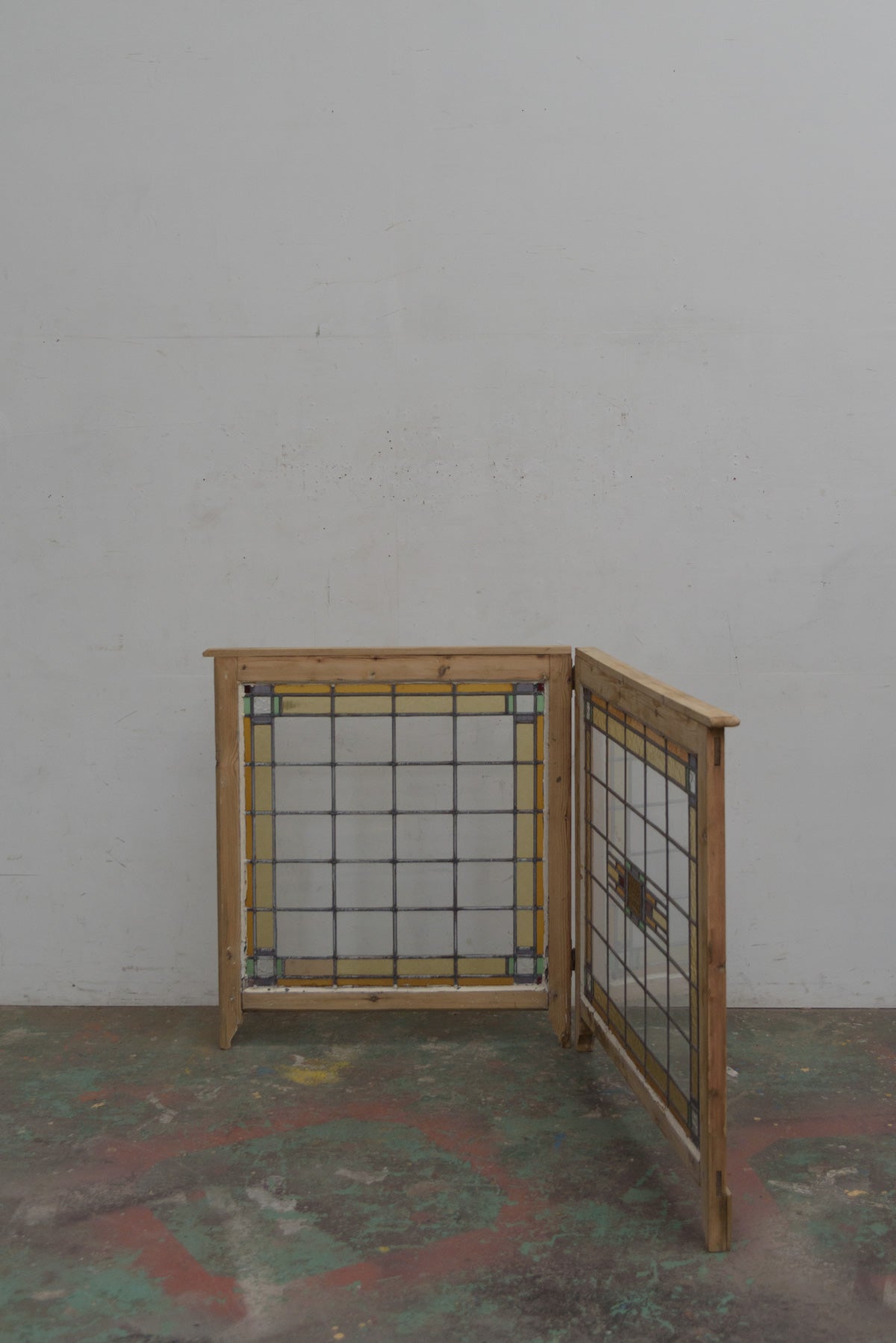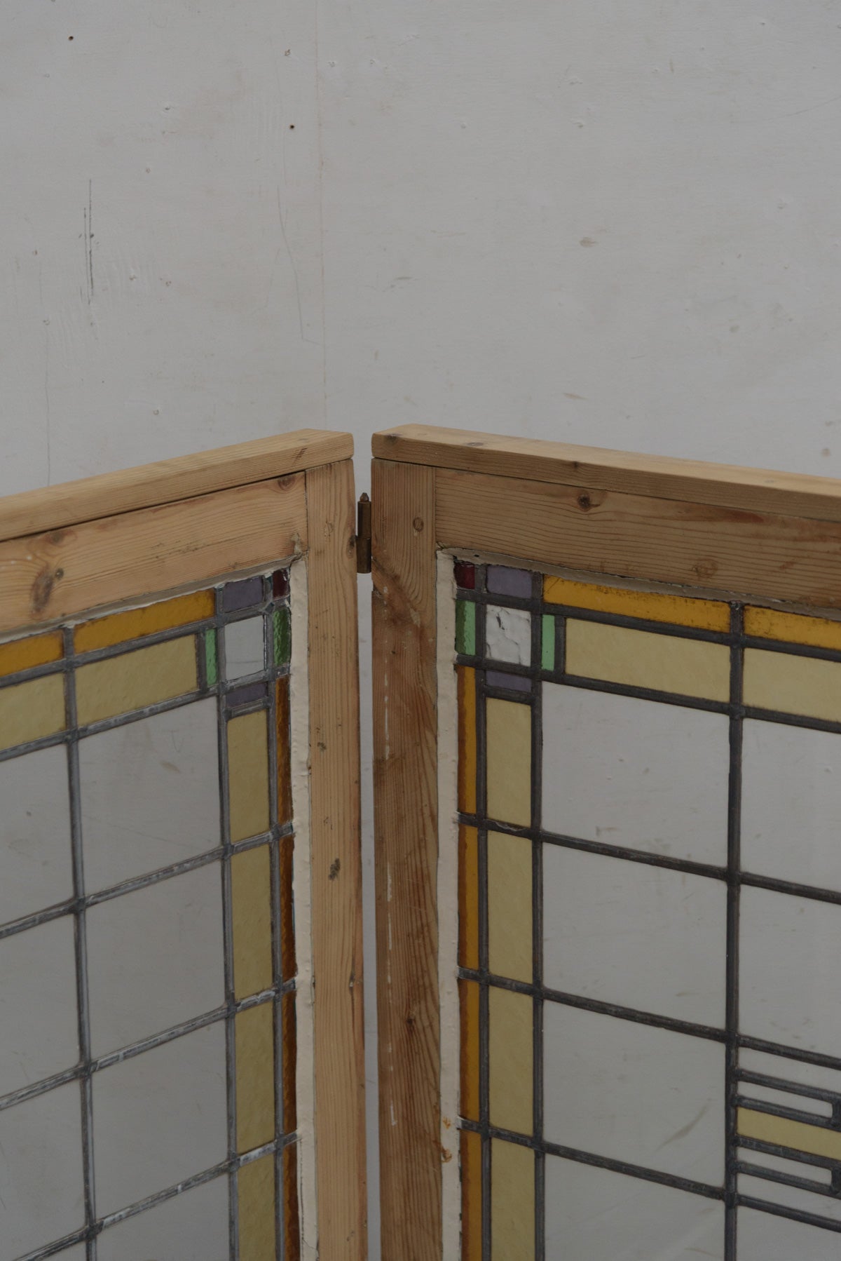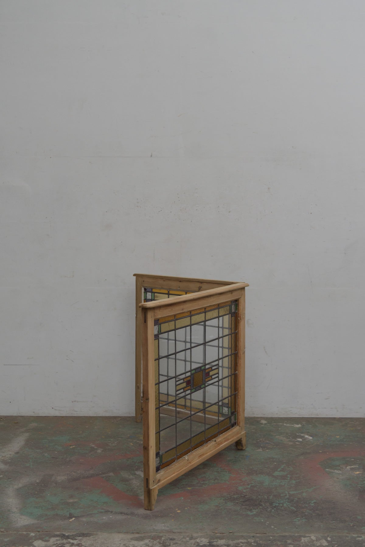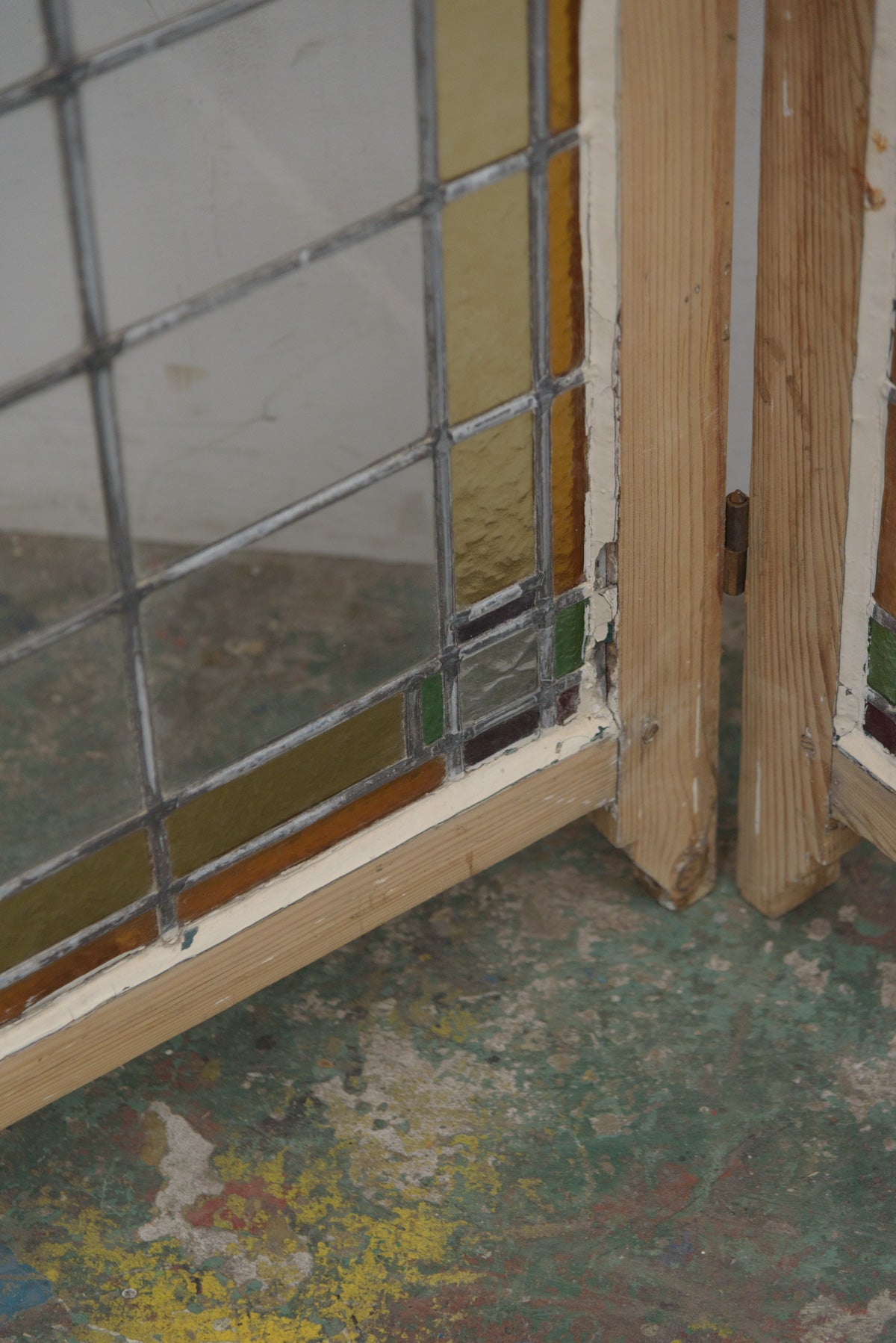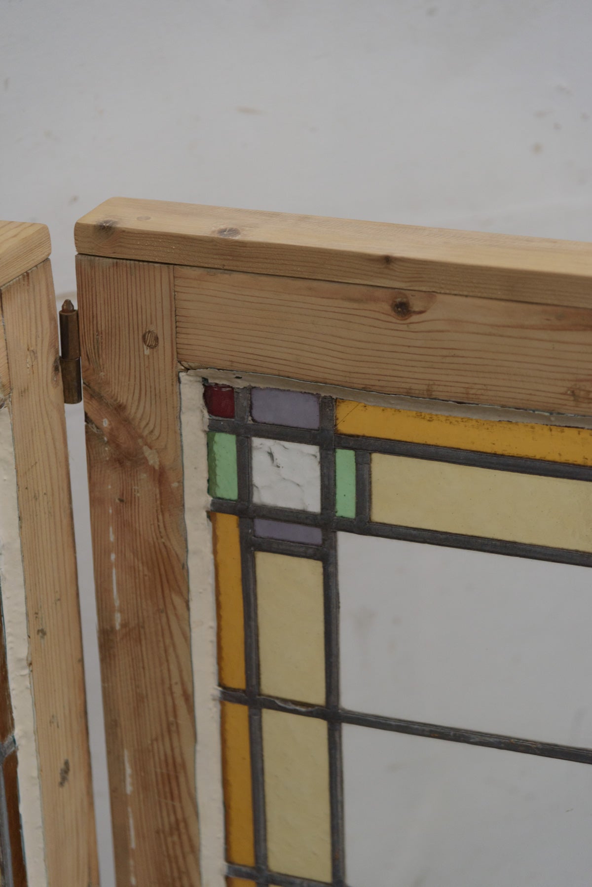 2枚を丁番でつなげていますので、開くと自立します。数か所小さな割れがありますが、派手すぎないアンティークのステンドグラスが魅力的で、間仕切りや目隠し等、実用性も兼ね備えています。丁番は差し込むだけの作りですので、上下にずらすと2枚に分割もできます。