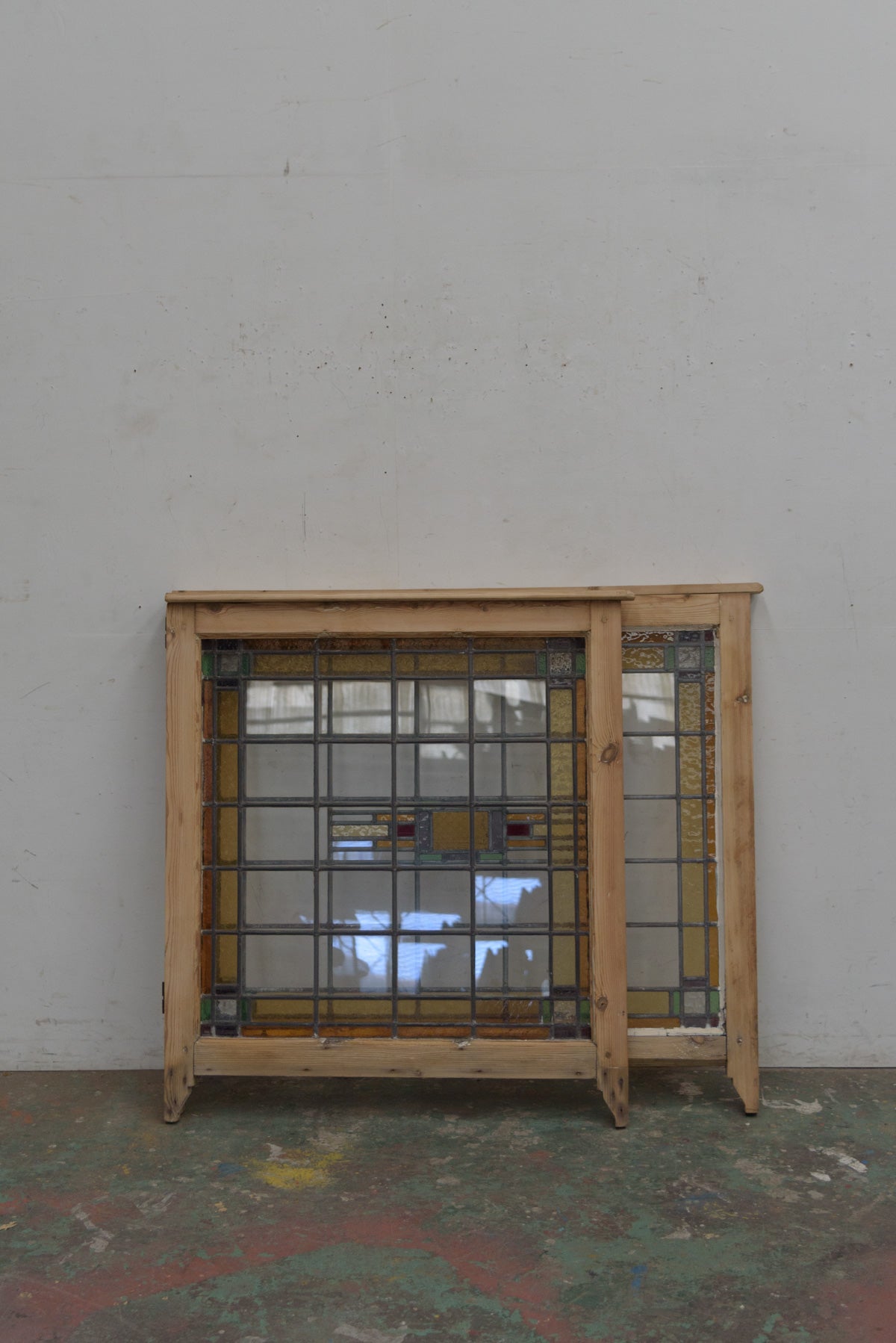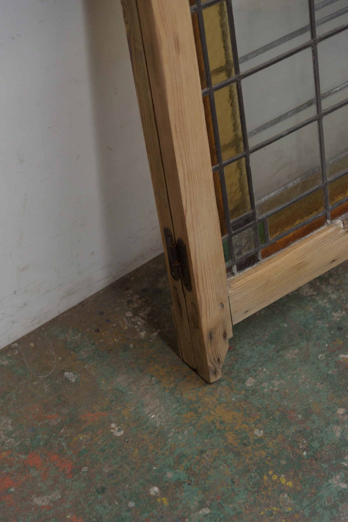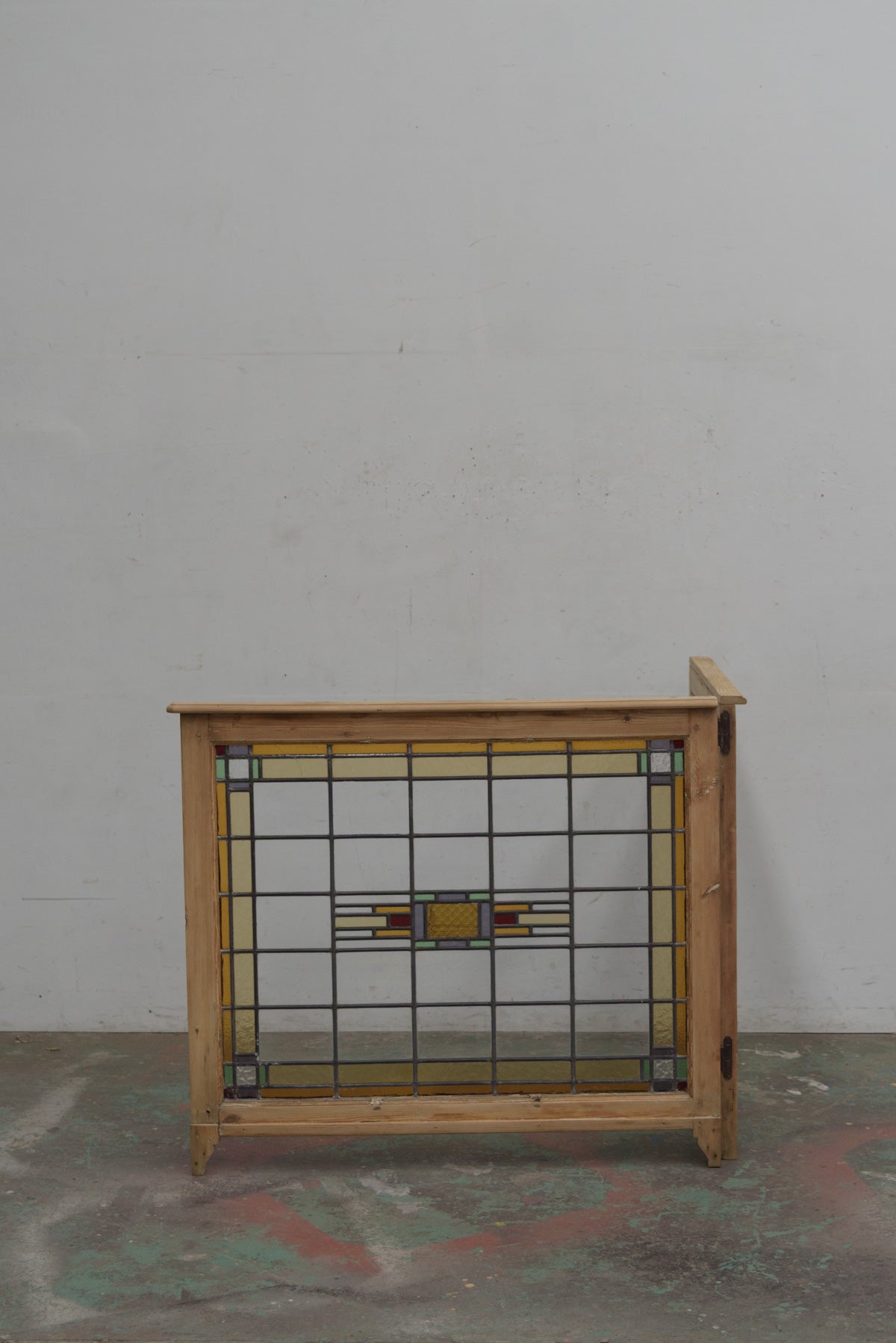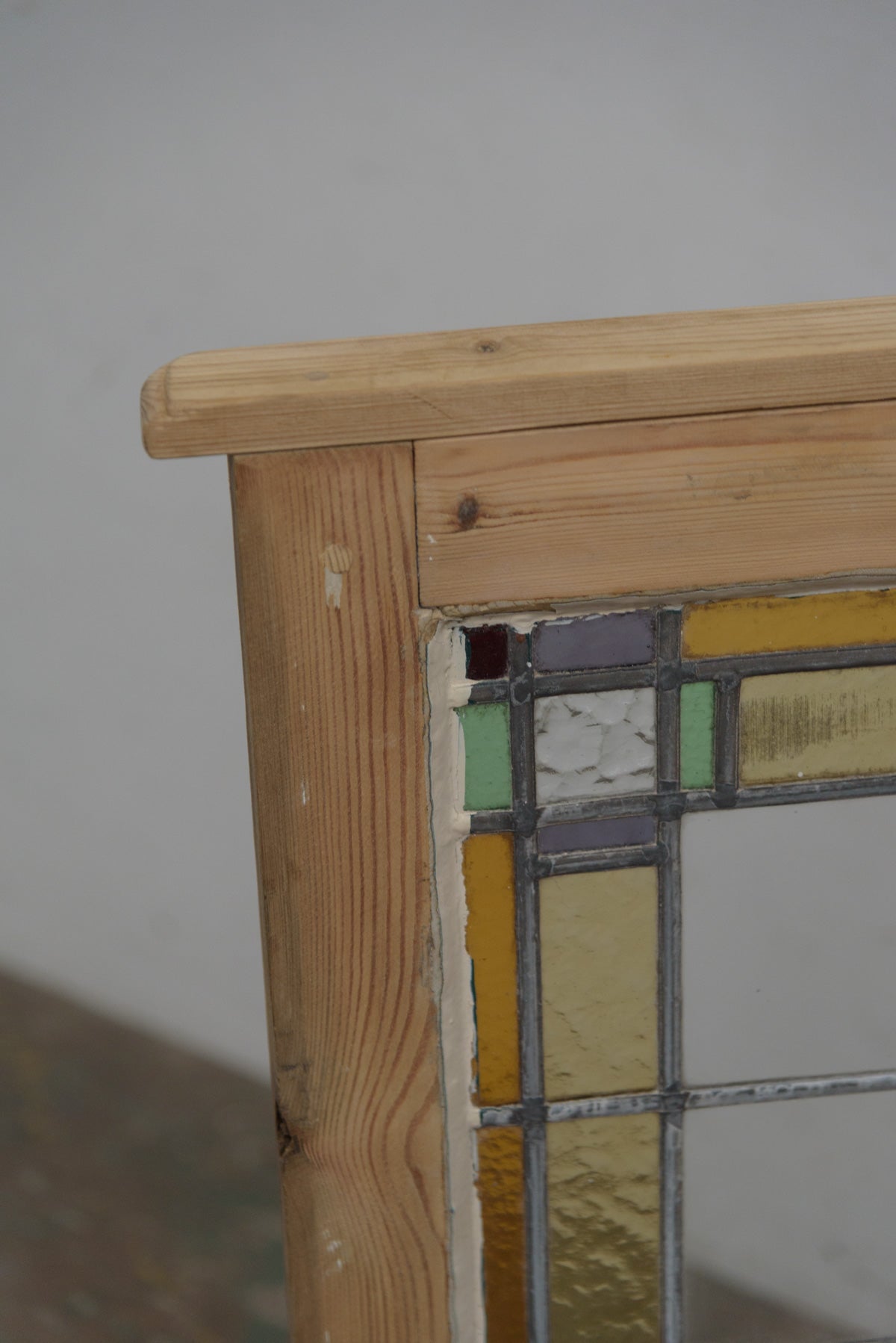 2枚を丁番でつなげていますので、開くと自立します。数か所小さな割れがありますが、派手すぎないアンティークのステンドグラスが魅力的で、間仕切りや目隠し等、実用性も兼ね備えています。丁番は差し込むだけの作りですので、上下にずらすと2枚に分割もできます。