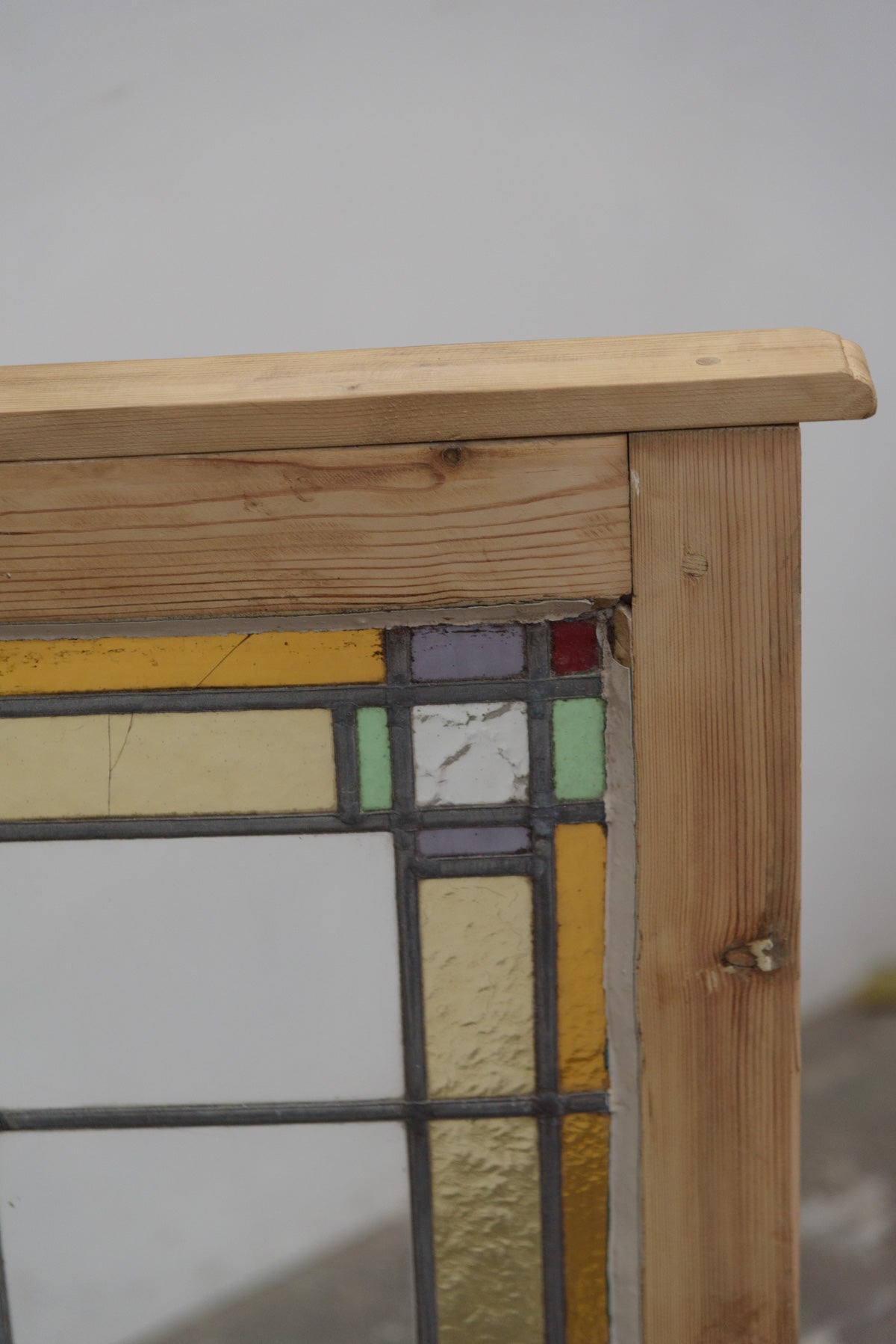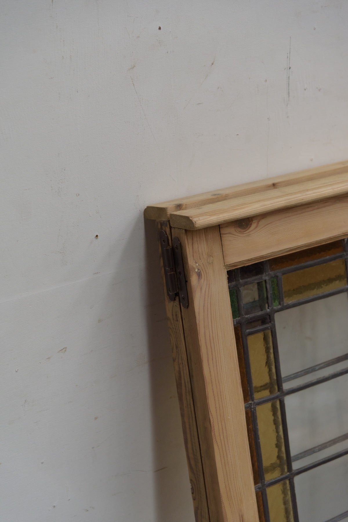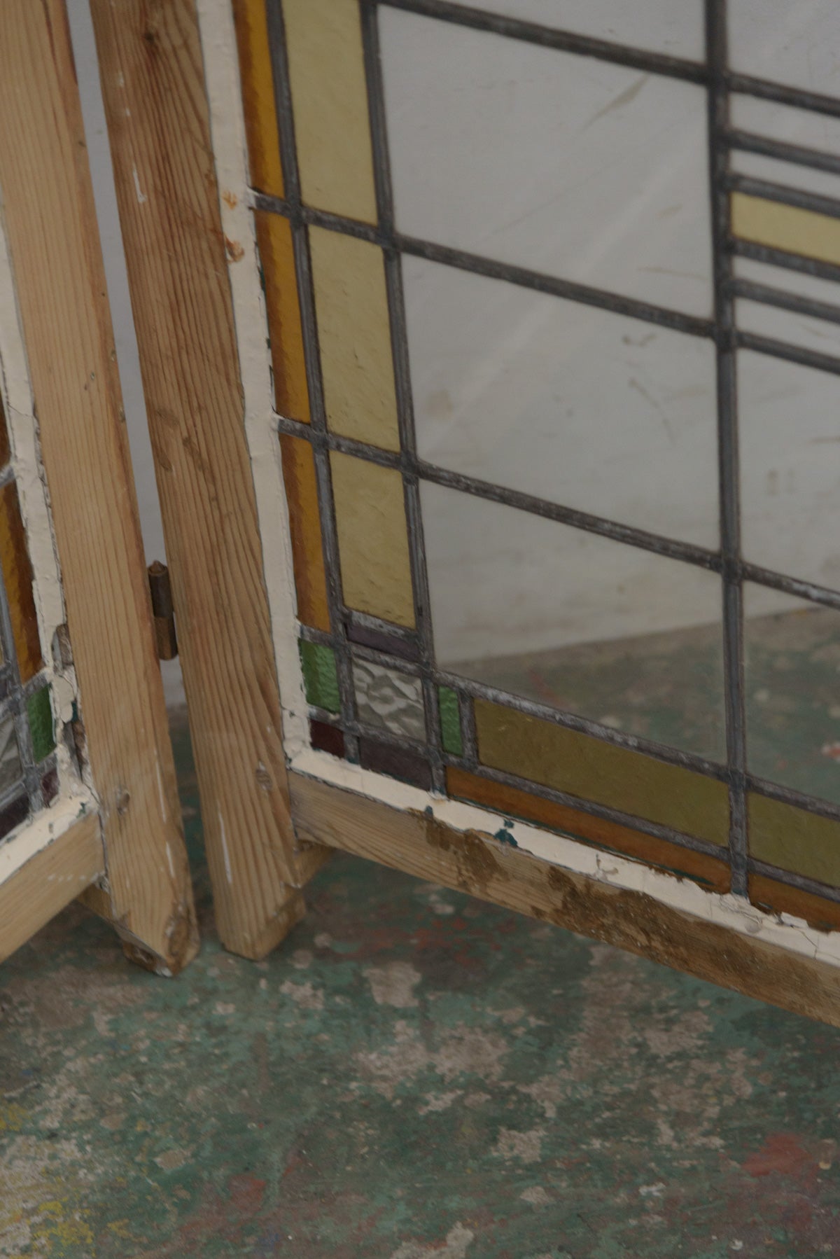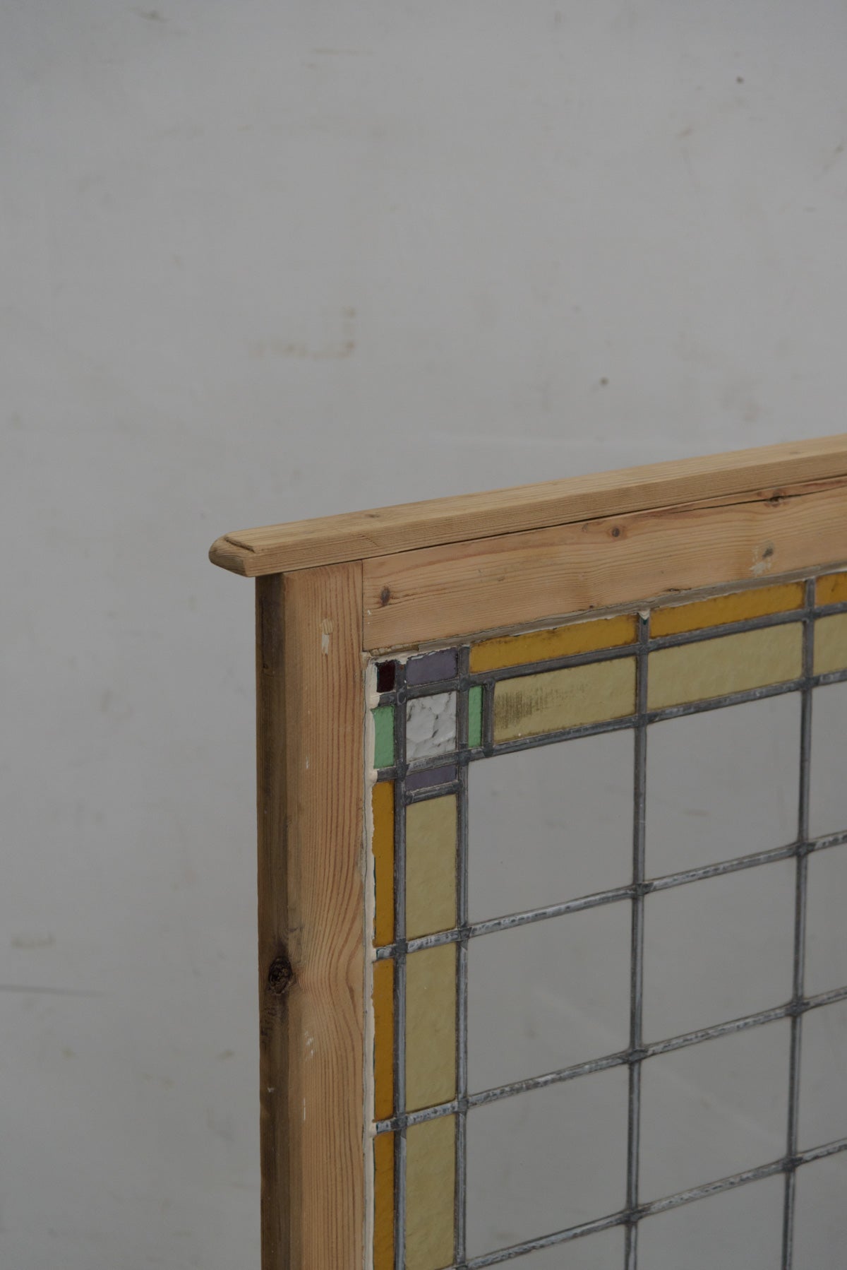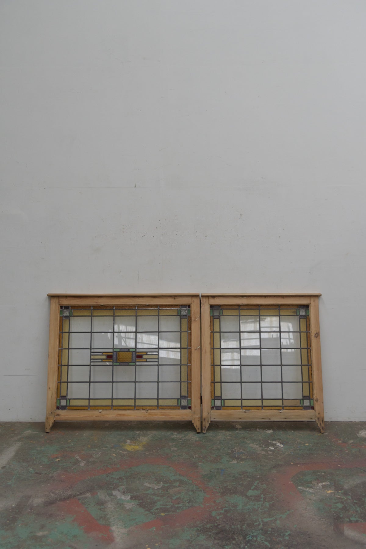 2枚を丁番でつなげていますので、開くと自立します。数か所小さな割れがありますが、派手すぎないアンティークのステンドグラスが魅力的で、間仕切りや目隠し等、実用性も兼ね備えています。丁番は差し込むだけの作りですので、上下にずらすと2枚に分割もできます。