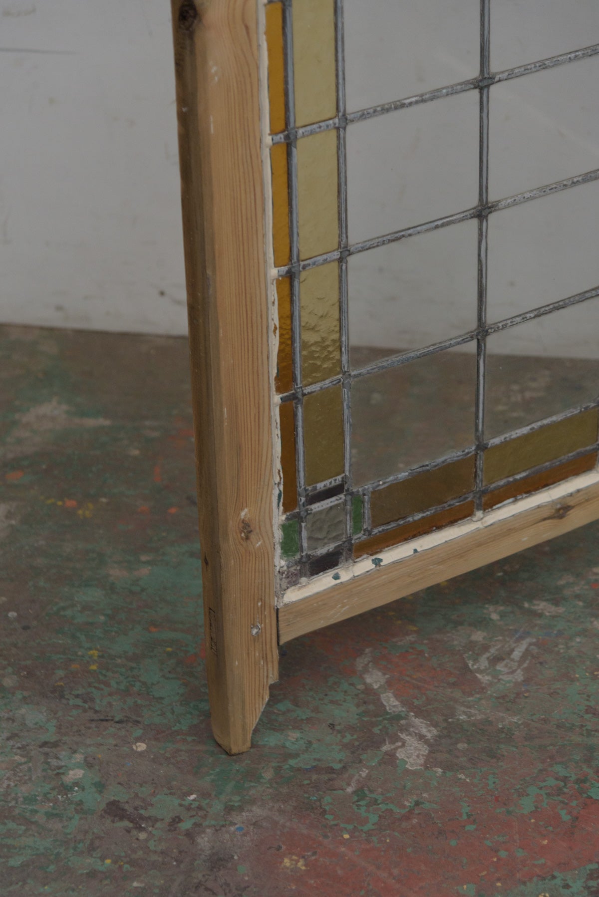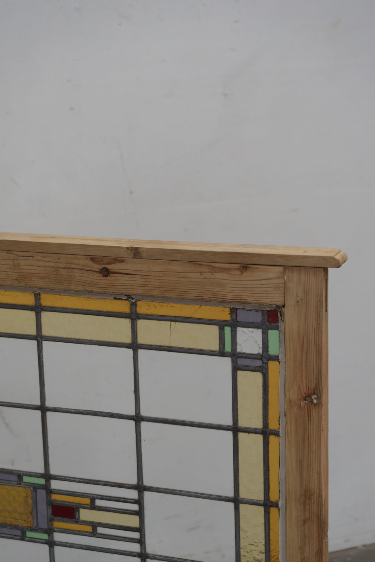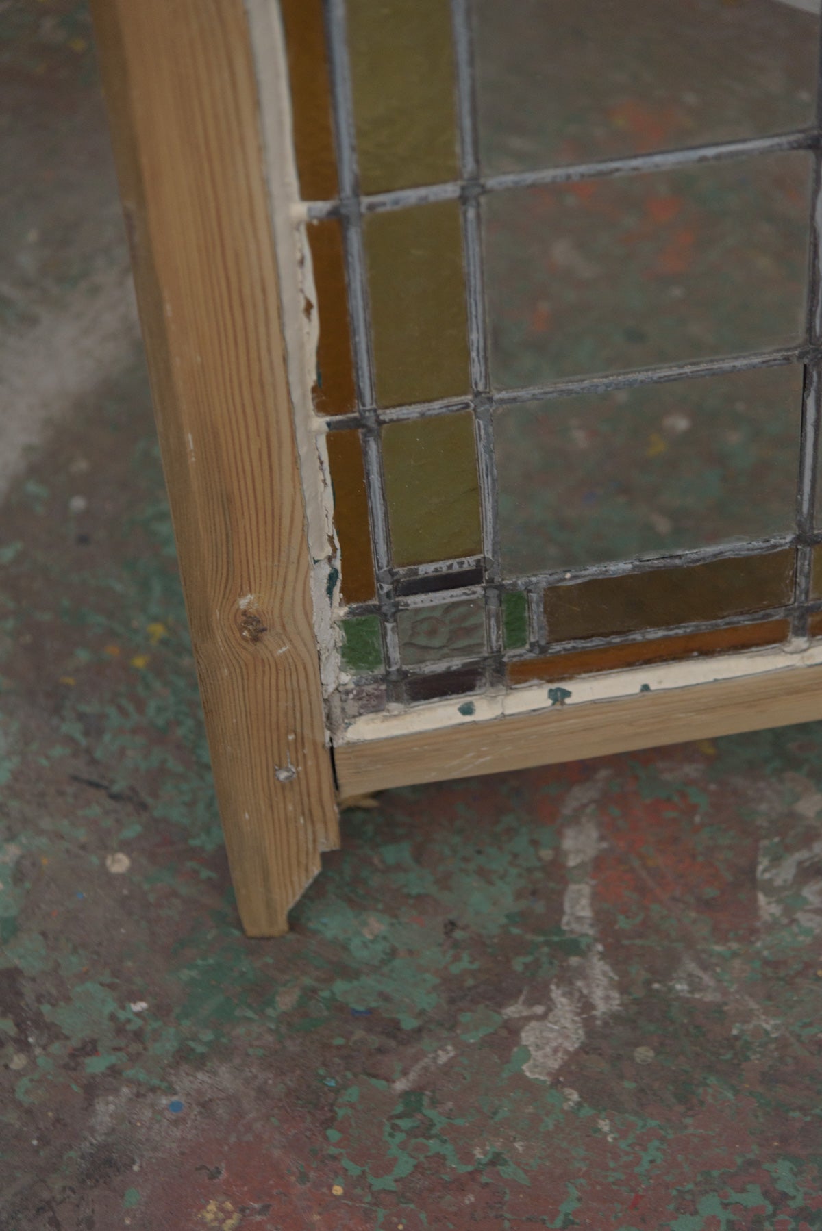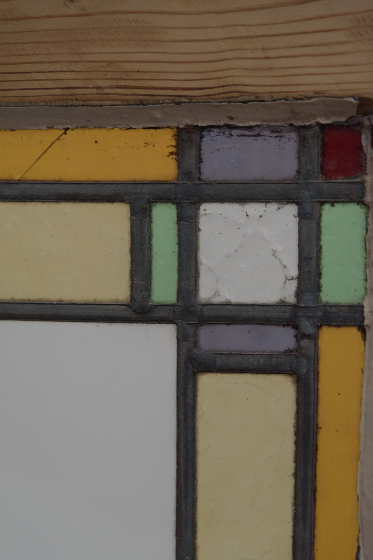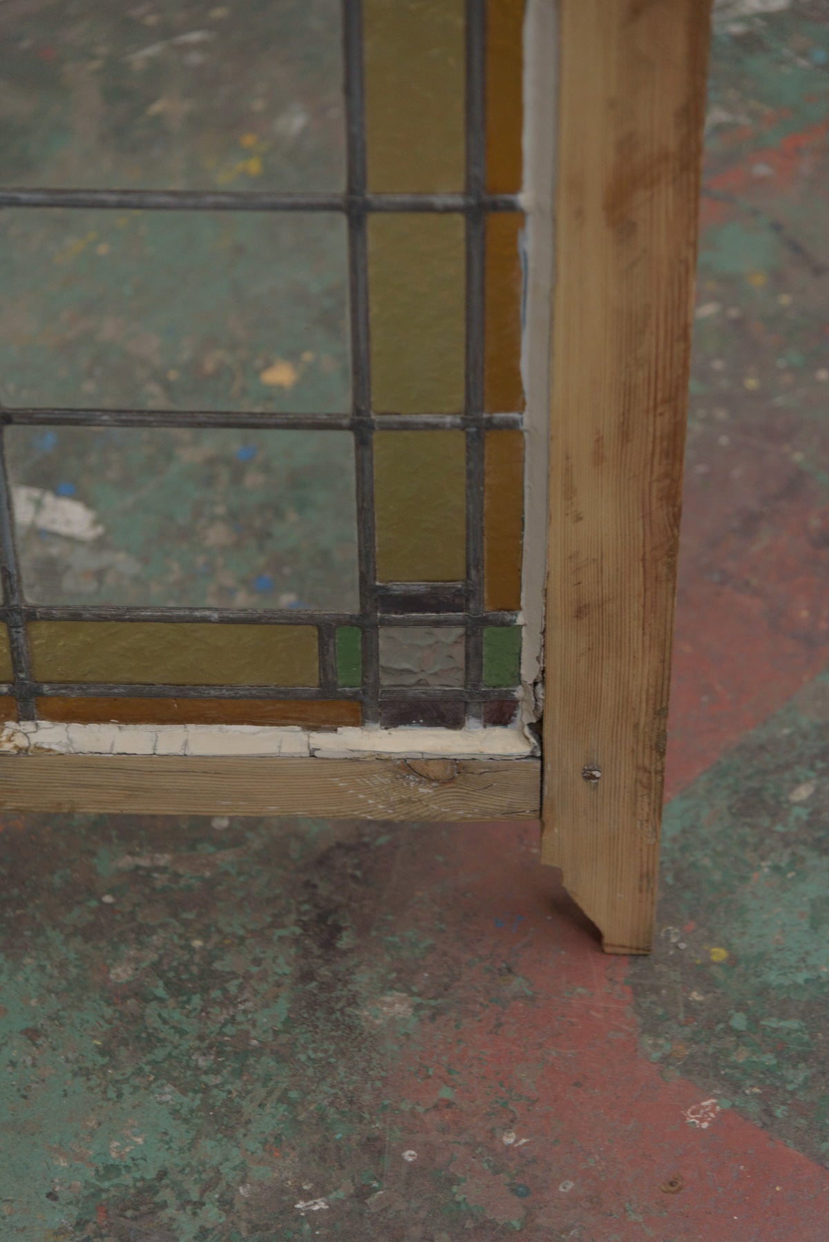 2枚を丁番でつなげていますので、開くと自立します。数か所小さな割れがありますが、派手すぎないアンティークのステンドグラスが魅力的で、間仕切りや目隠し等、実用性も兼ね備えています。丁番は差し込むだけの作りですので、上下にずらすと2枚に分割もできます。