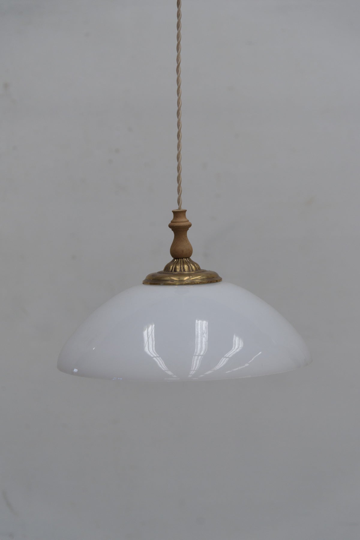 ミルクガラスのシンプルで大きなシェード、木製パーツは古いものを取り付けています。電気部品は日本の新しいものに交換しています。口金はE17で引っ掛けシーリング仕様。コードの長さは約2mです。