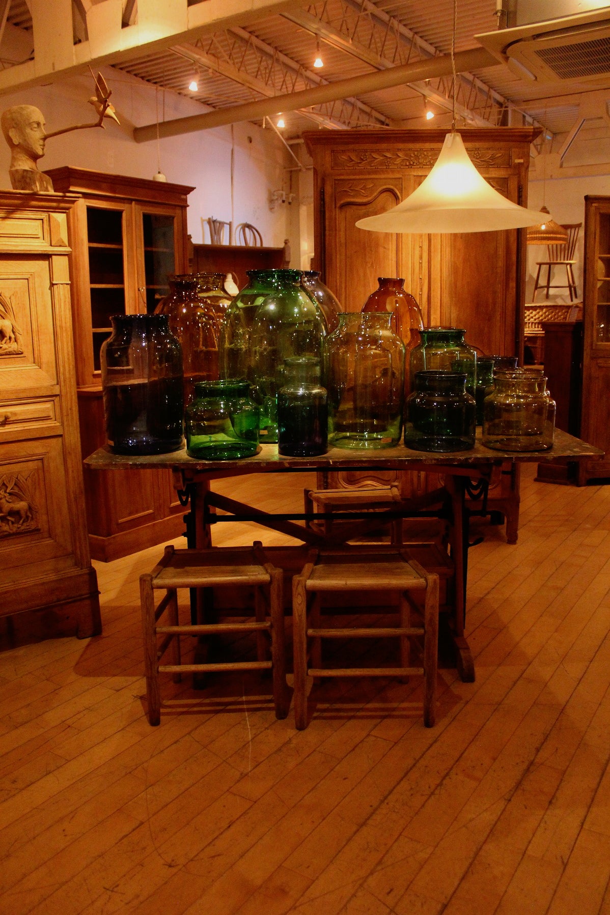 1960ー70年ごろ。サイズや色、デザインもそれぞれ個性的なガラスボトルです。