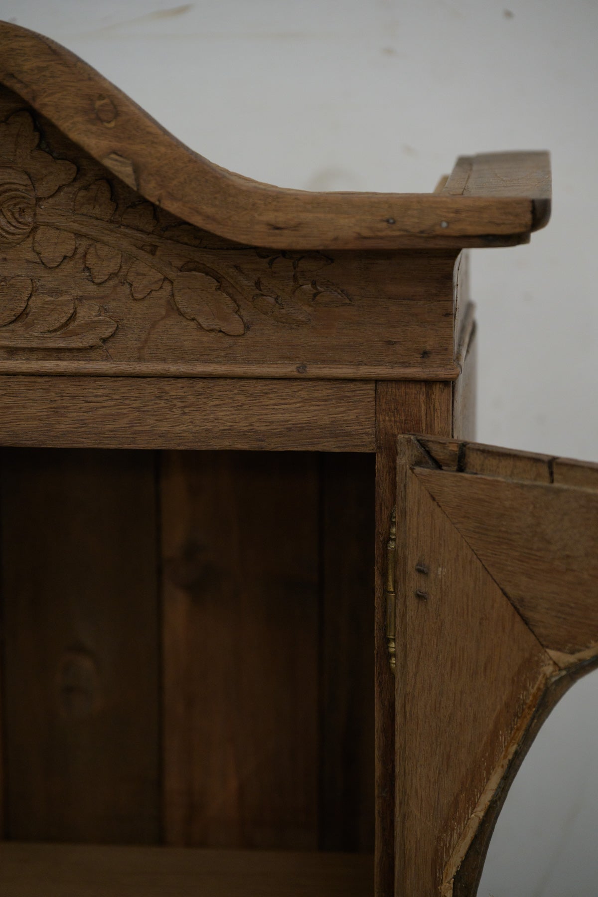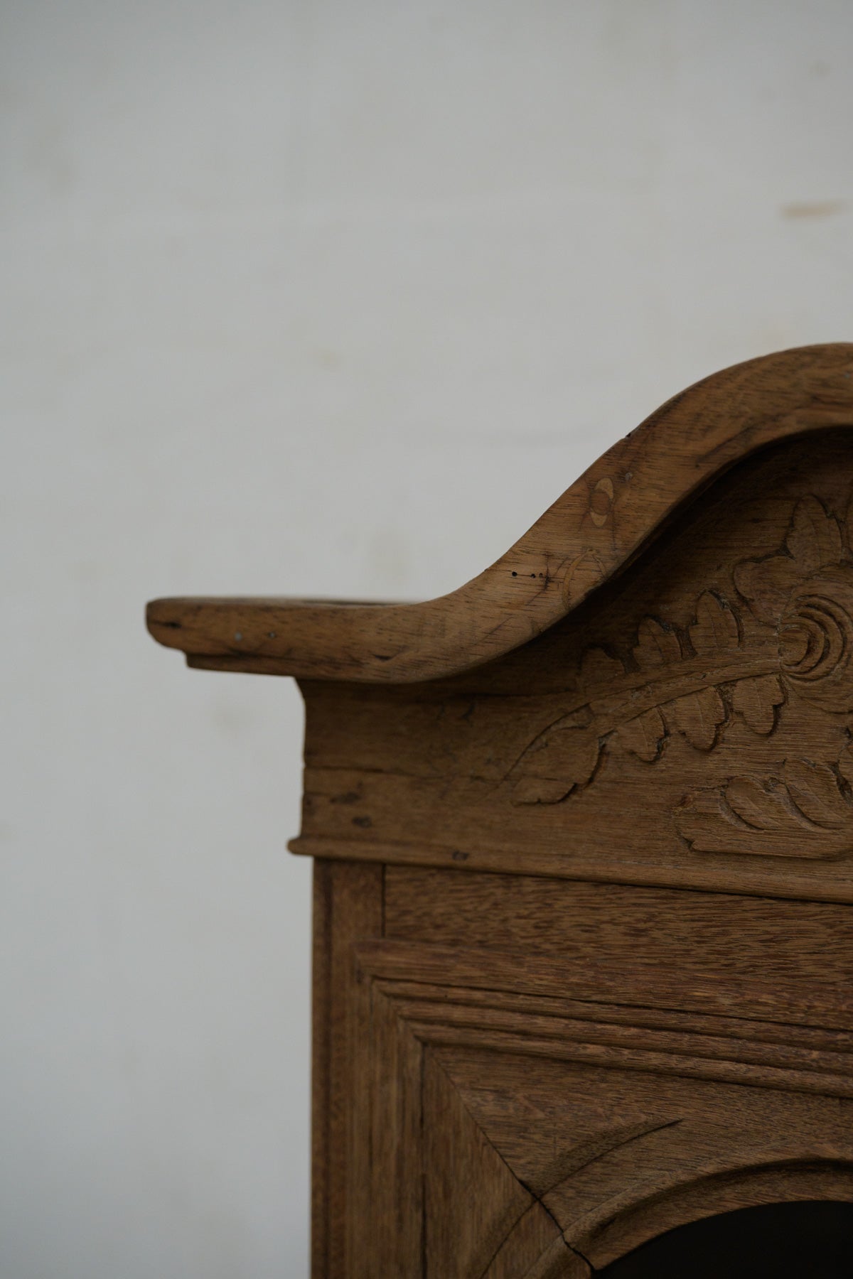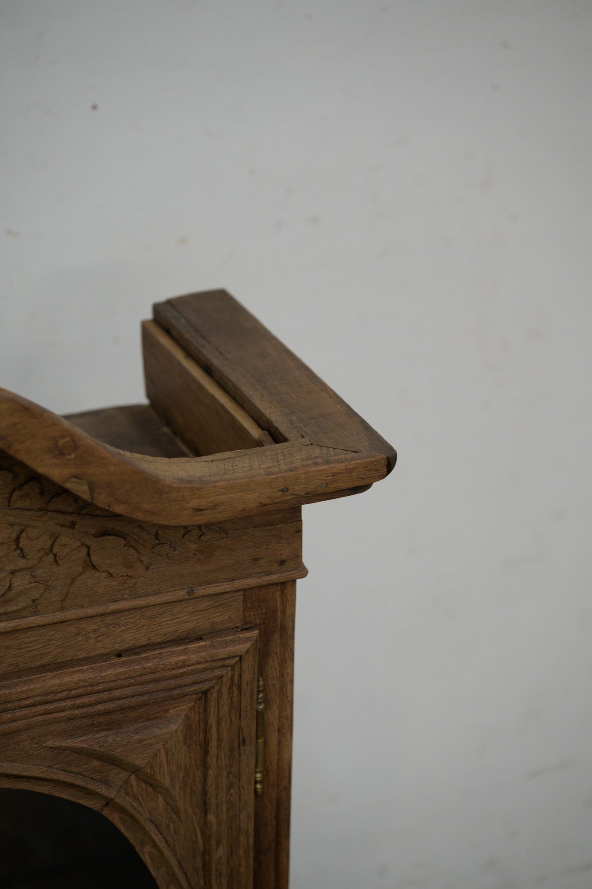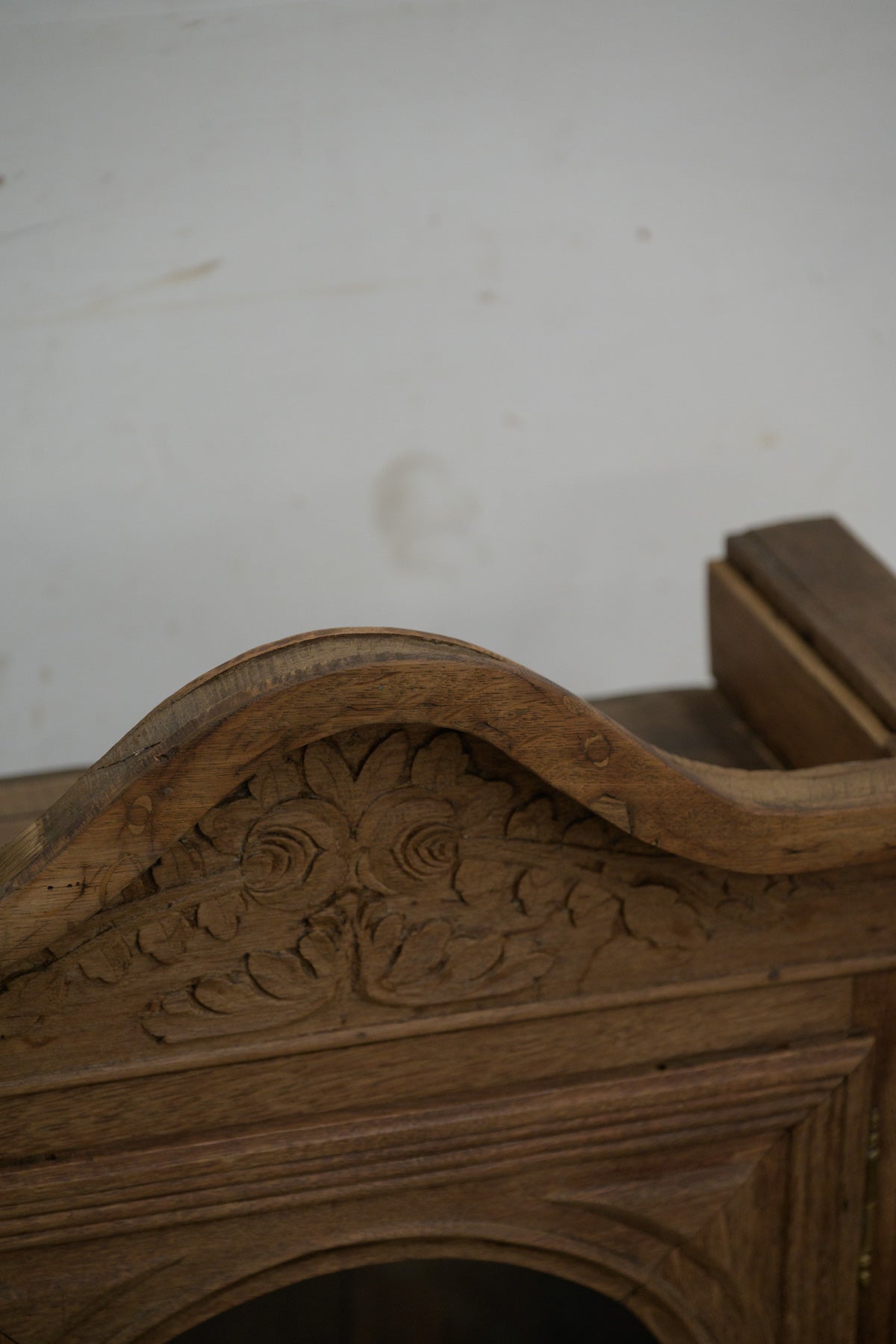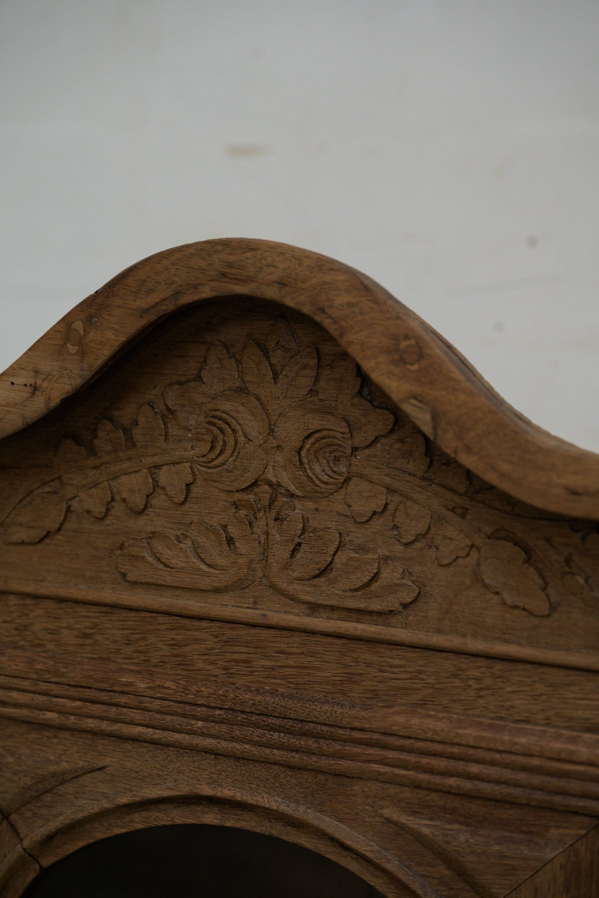 古いオーク材の質感、アーチ状の天飾りにオーバルのガラス窓など、フランスらしい色気のあるディテールのアンティークキャビネットです。棚板は取り外せます。