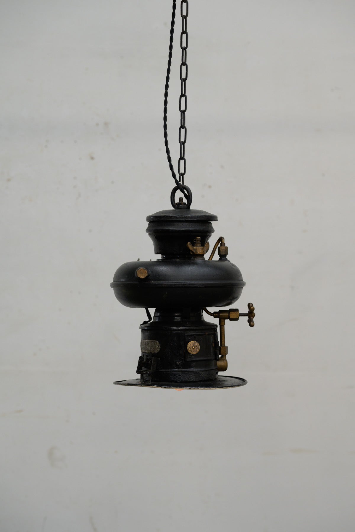 もともとは船舶用の加圧式オイルランプだと思われます。メーターや真鍮製のバルブなど、見どころの多いオブジェのような存在感のあるランプです。電気部品は日本の新しいものに交換しています。口金はE17で引っ掛けシーリング仕様。コードの長さは約2mです。チェーンはオリジナルのものが45㎝ついていますが、長くされたい場合はご相談ください。