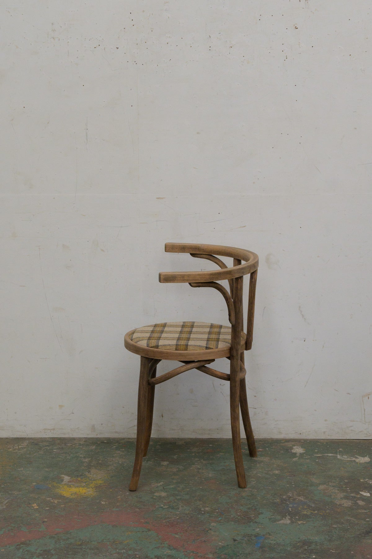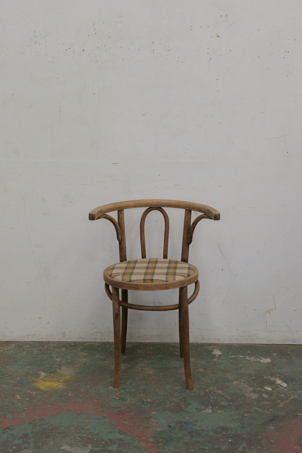 アームチェアにしては小ぶりで、古いトーネットスタイルのシンプルで無駄のないデザイン。座面は当店にてクッション入りの布座面に張り替えています。生地はイギリスのデッドストックのものを使用。ぐらつきもなく、しっかり実用できます。