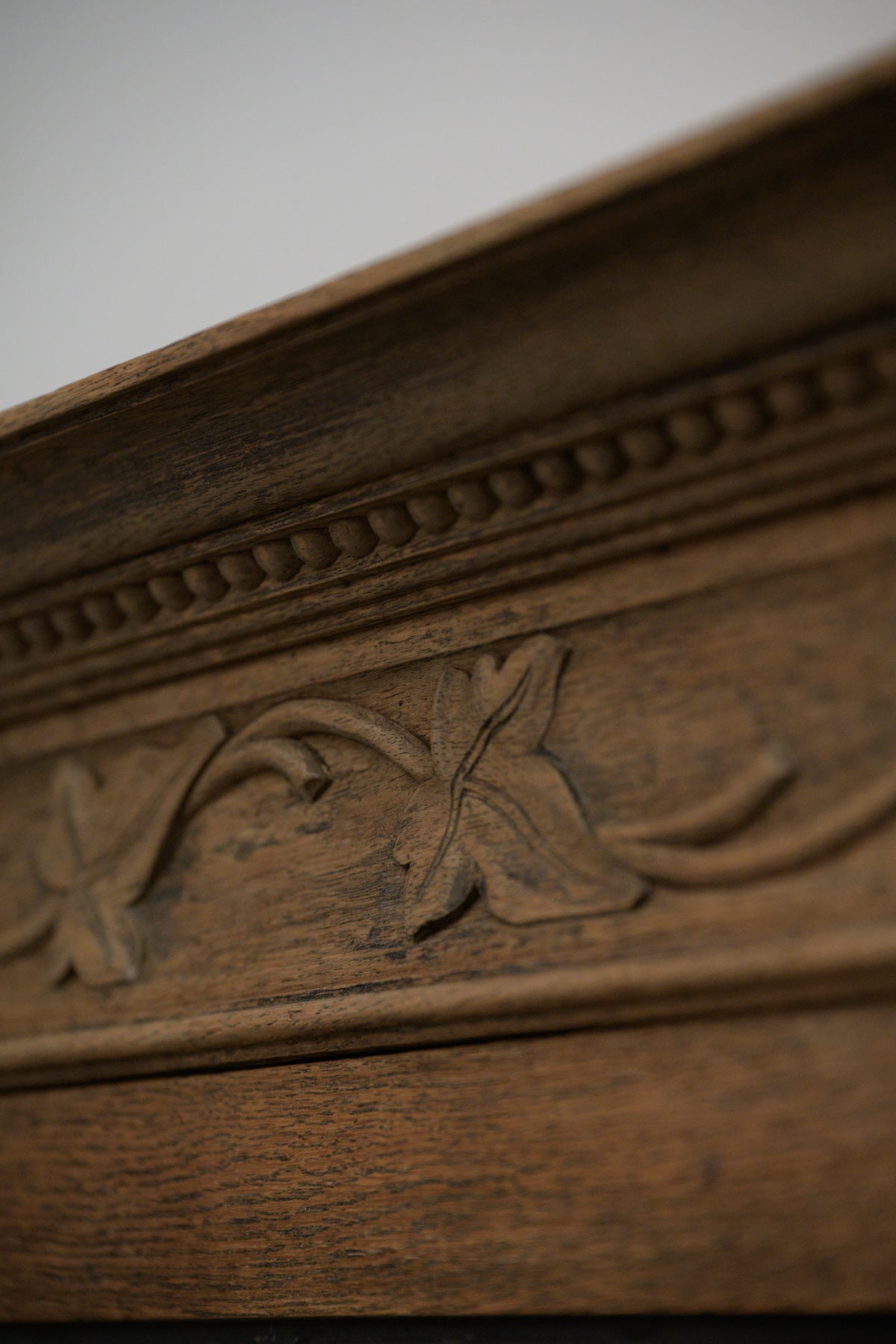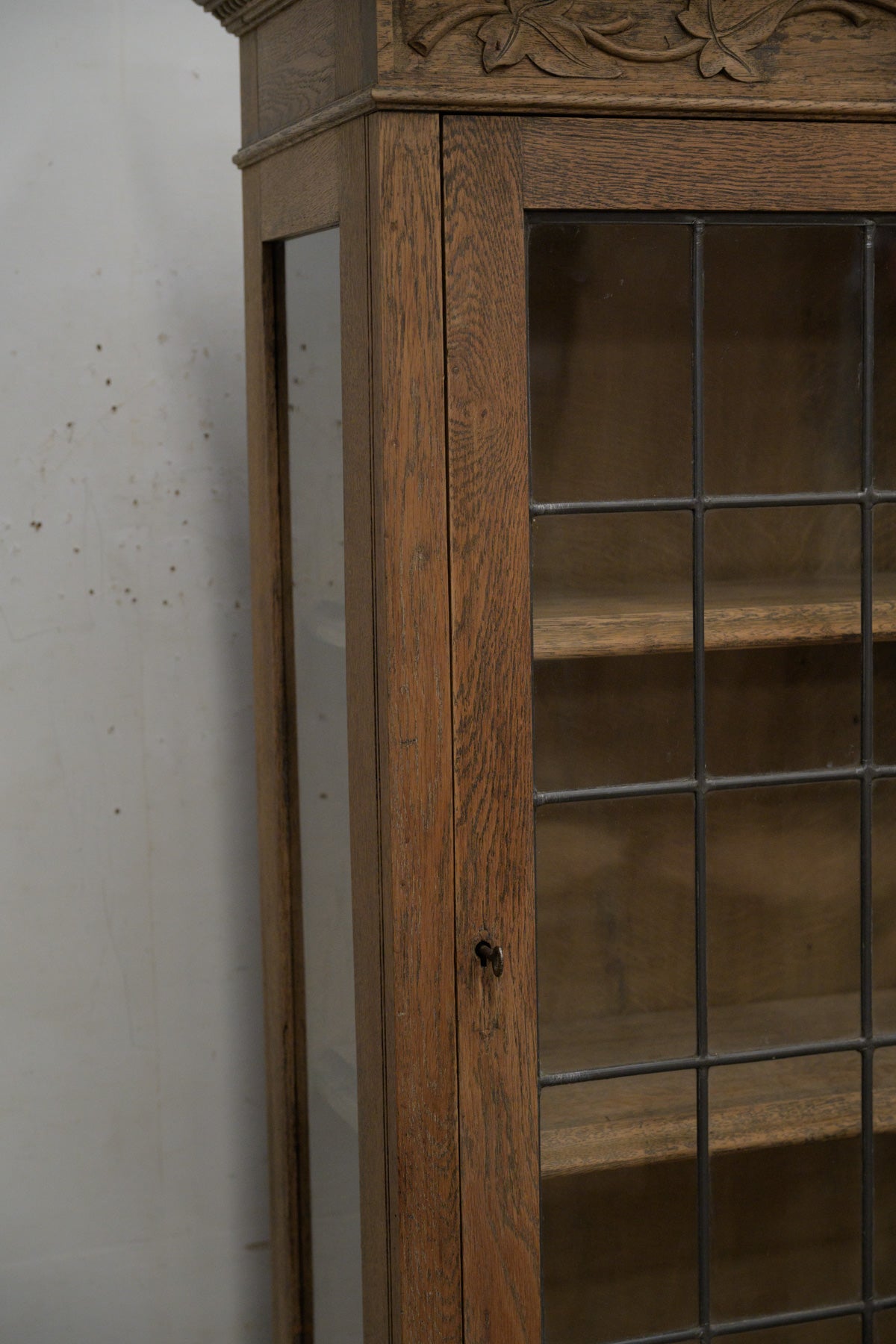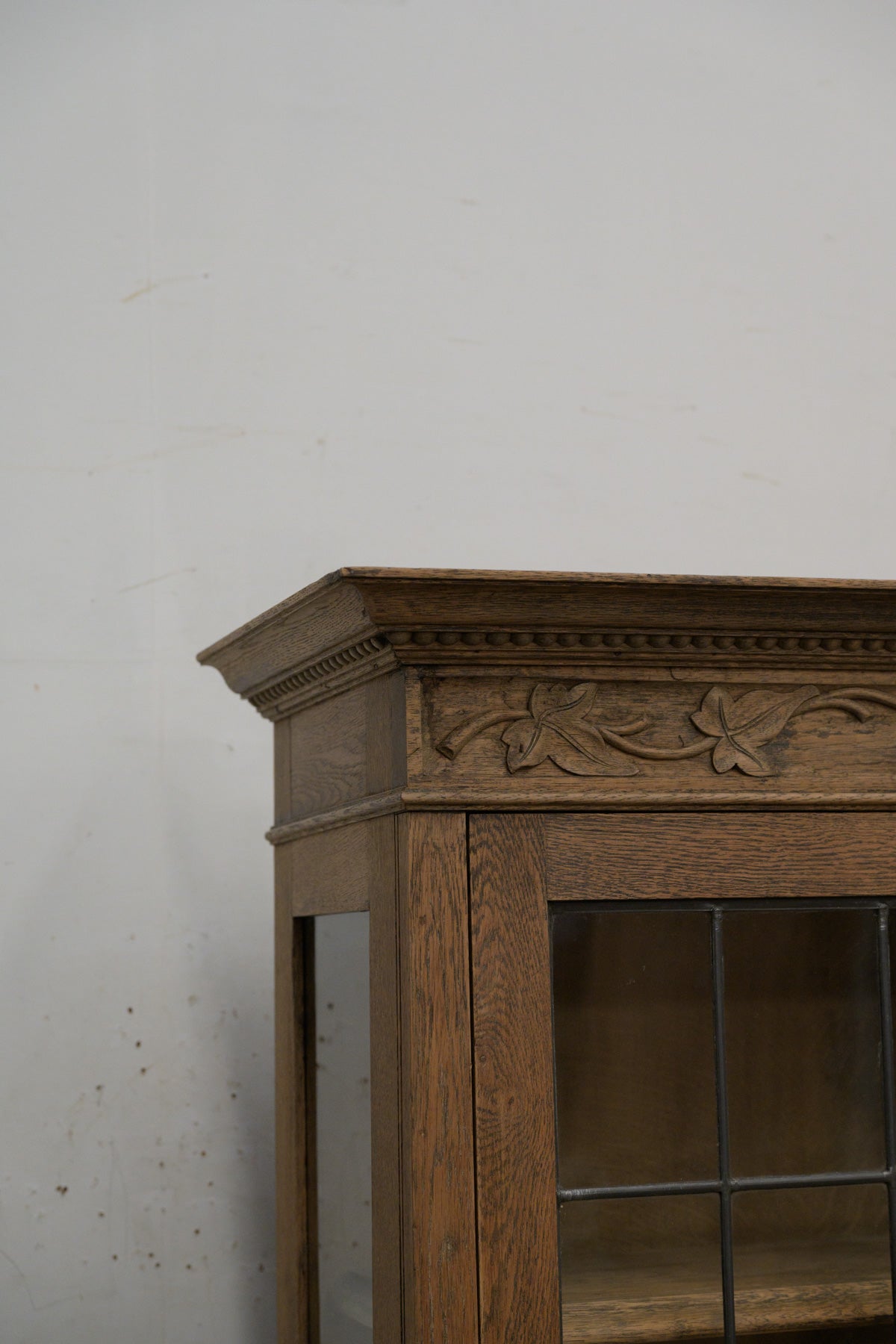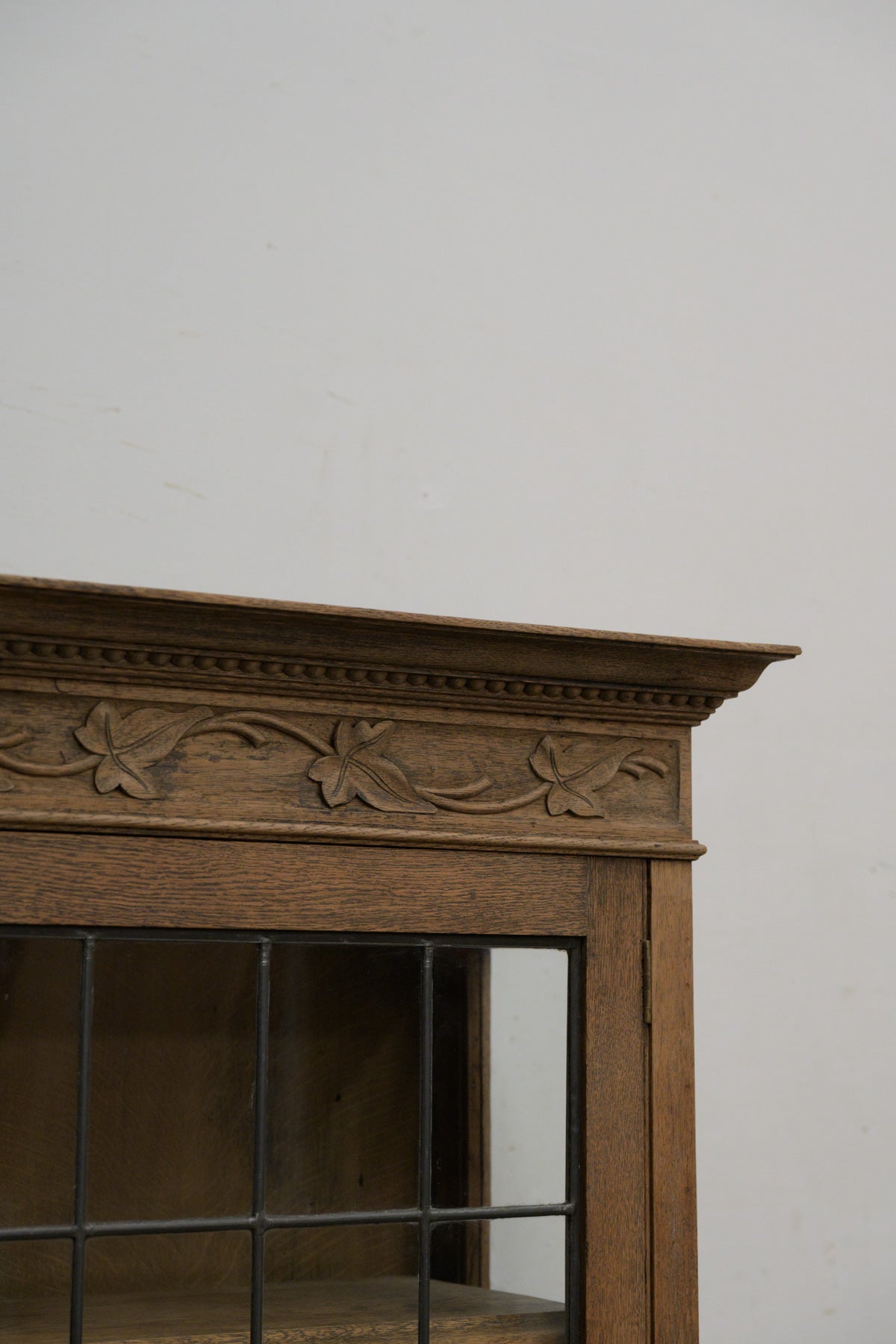 植物モチーフの彫刻、格子入りのガラス扉、引き出し前板には幾何学的なレリーフ等、細部に個性のあるオーク材のキャビネットです。1900年代前半のかなり古い家具ですが、棚板もしっかりと厚みがあり、本棚や食器棚として実用できます。小ぶりなサイズ感のわりに存在感のある家具ですので、店舗什器としても。