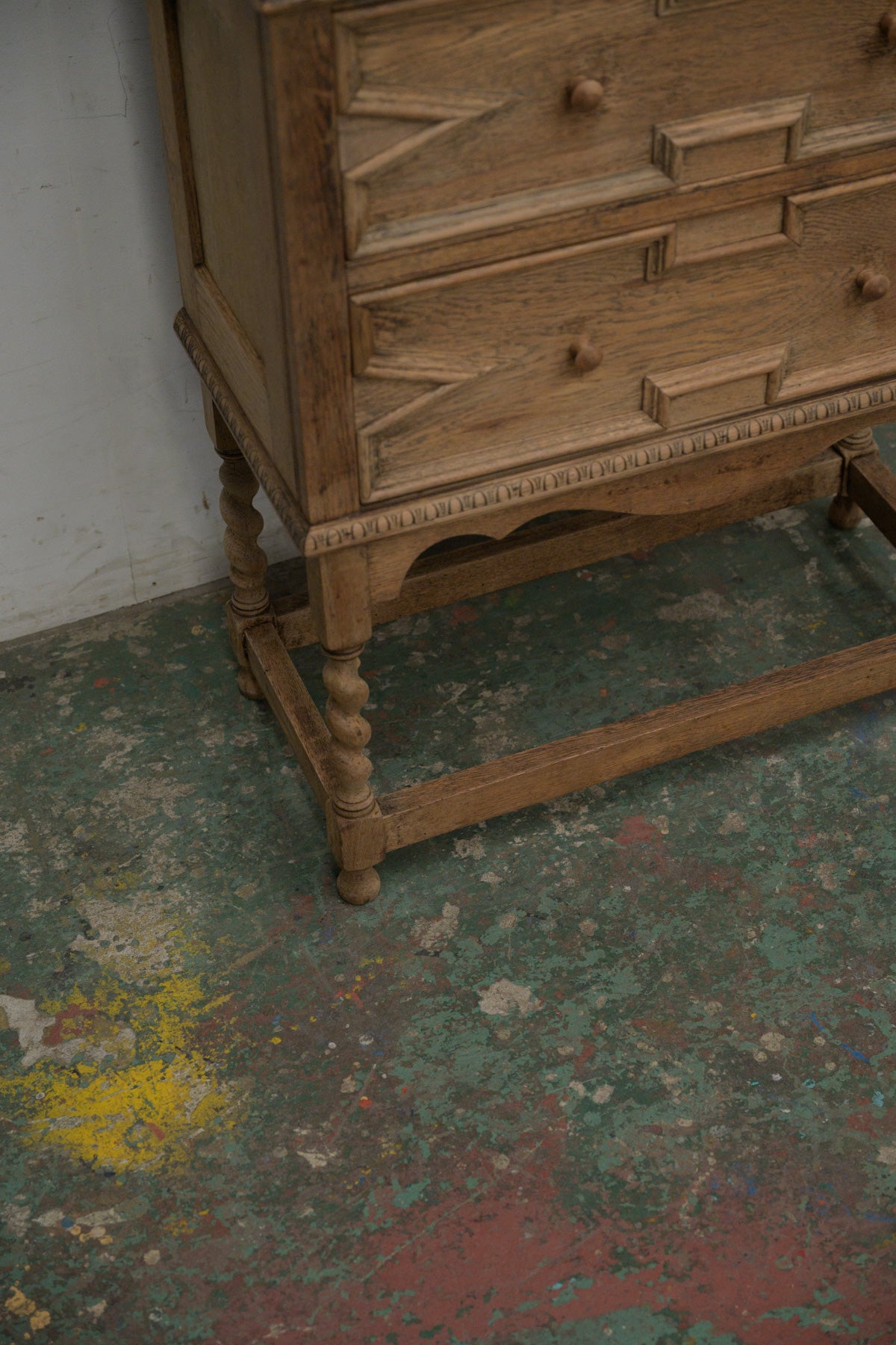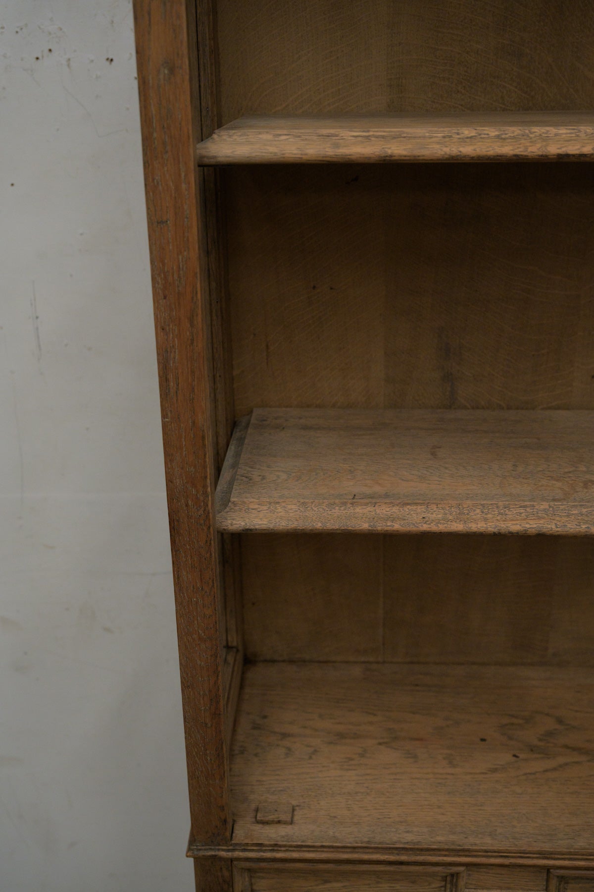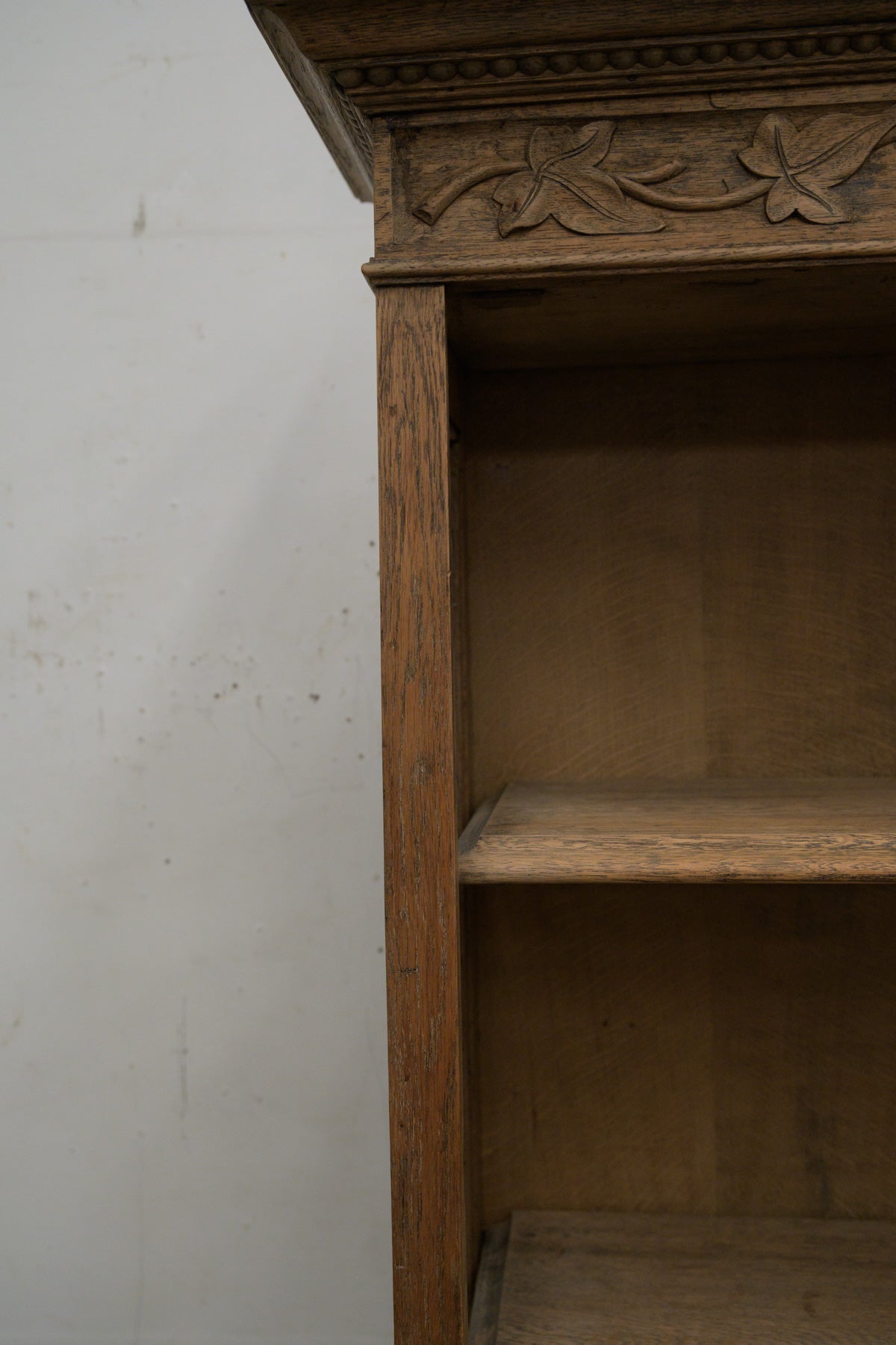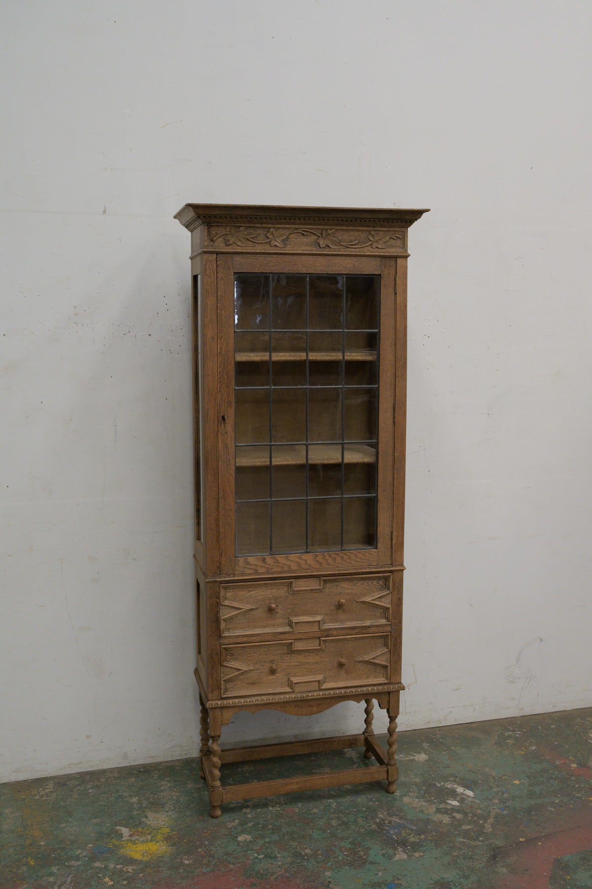 植物モチーフの彫刻、格子入りのガラス扉、引き出し前板には幾何学的なレリーフ等、細部に個性のあるオーク材のキャビネットです。1900年代前半のかなり古い家具ですが、棚板もしっかりと厚みがあり、本棚や食器棚として実用できます。小ぶりなサイズ感のわりに存在感のある家具ですので、店舗什器としても。