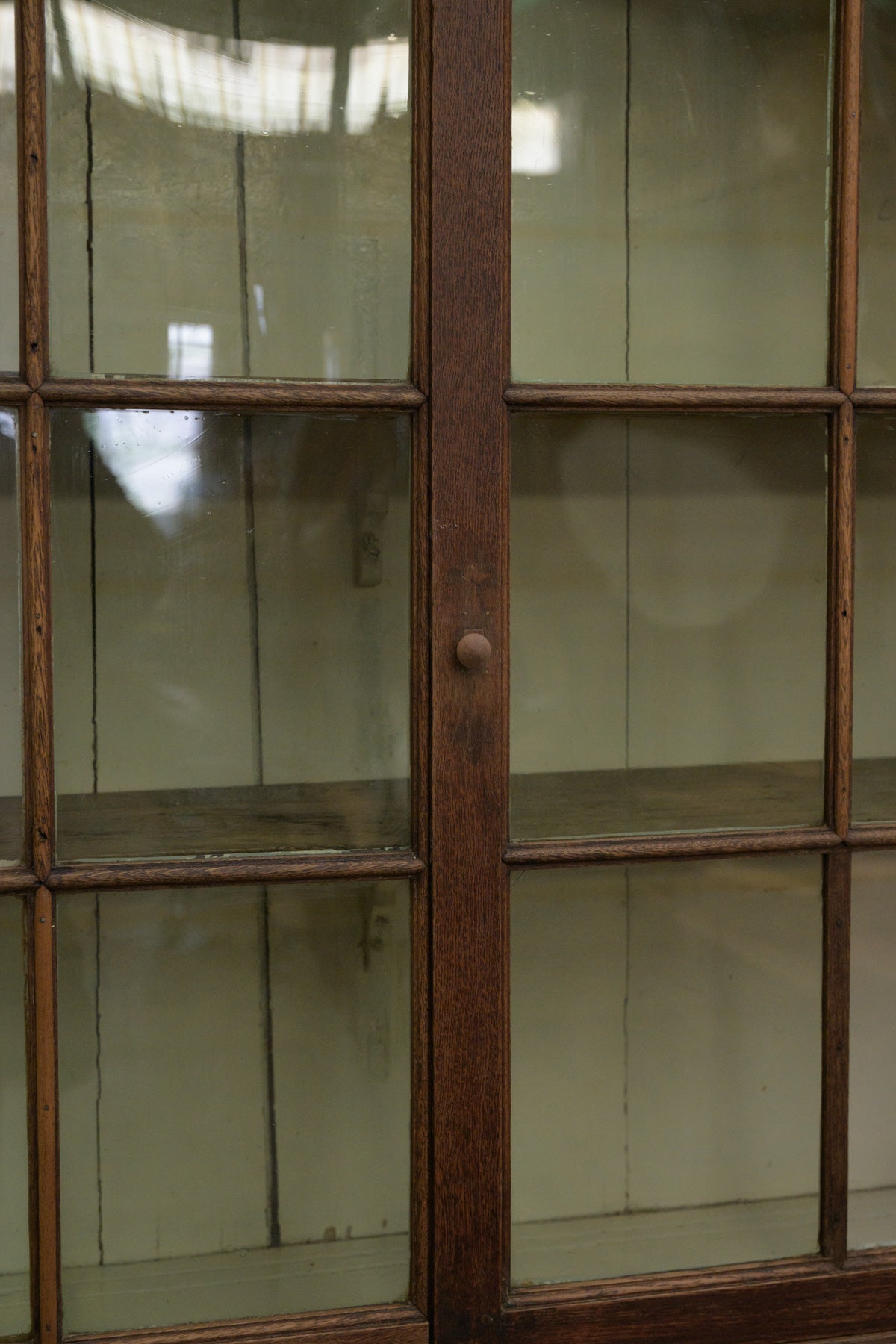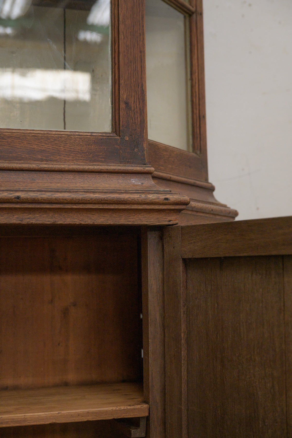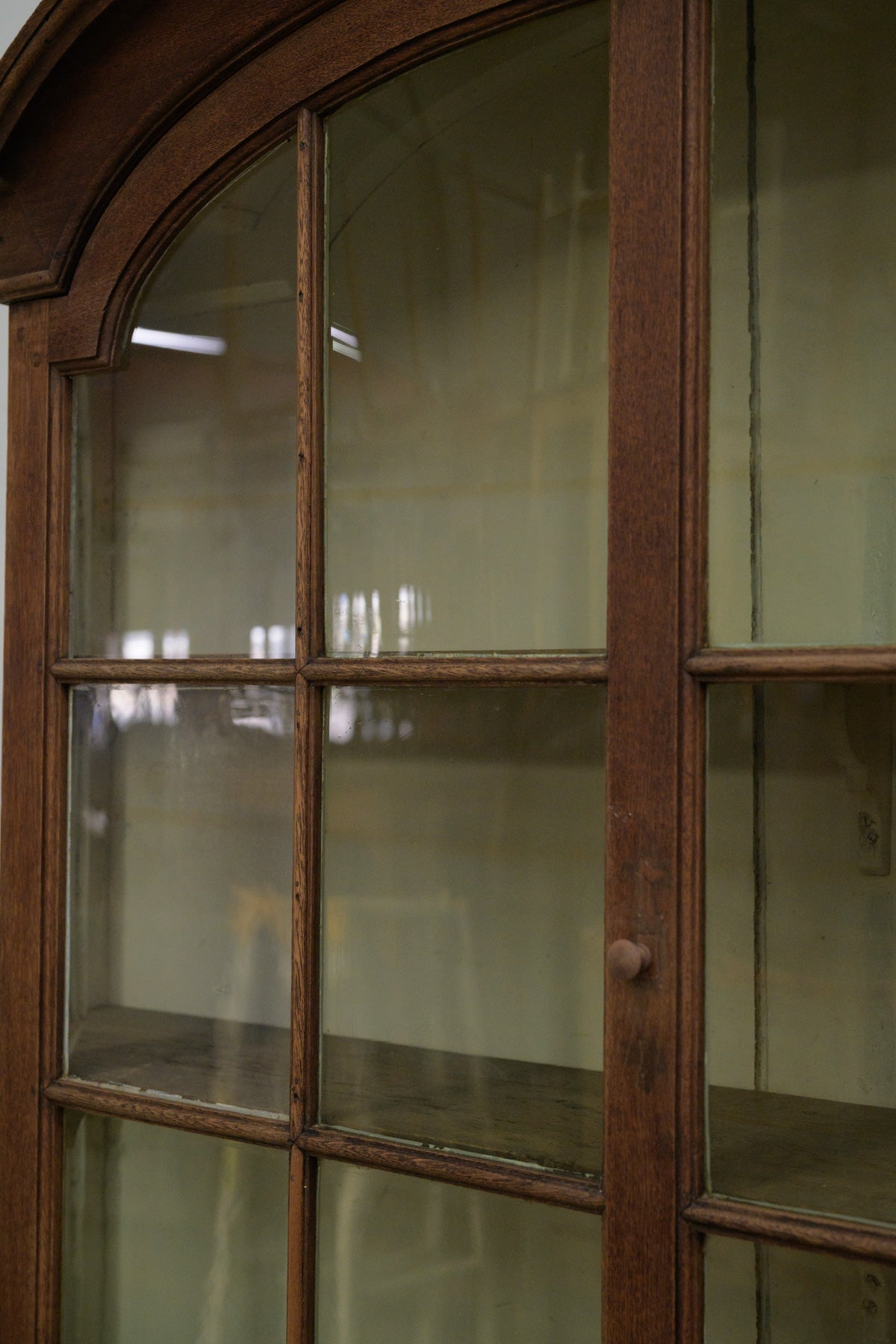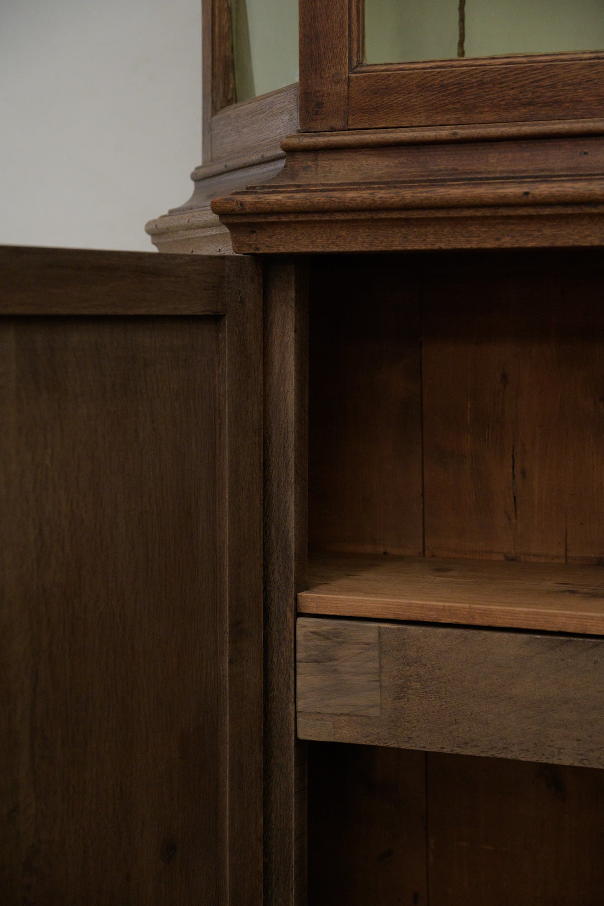 使い込んだオーク材の質感が素晴らしい19世紀の家具です。大きな家具ですが奥行が小さく、装飾も控えめでアーチ形の天飾りも端正で良いたたずまいです。棚板は取り外せます。薄いグリーンの古いガラスは一部割れていたので無色の新しいものに交換しています。