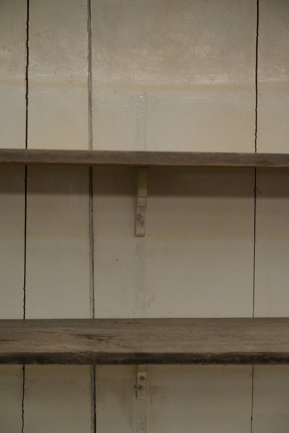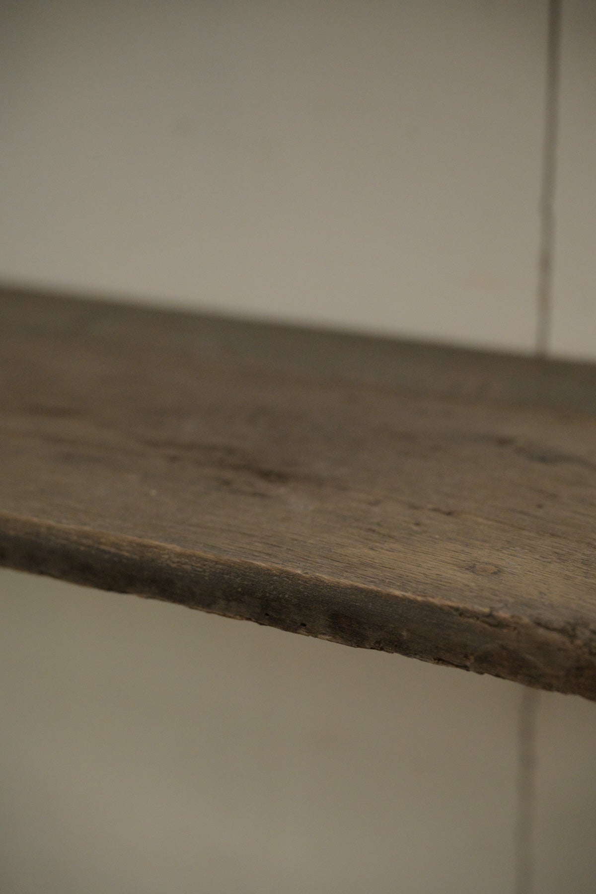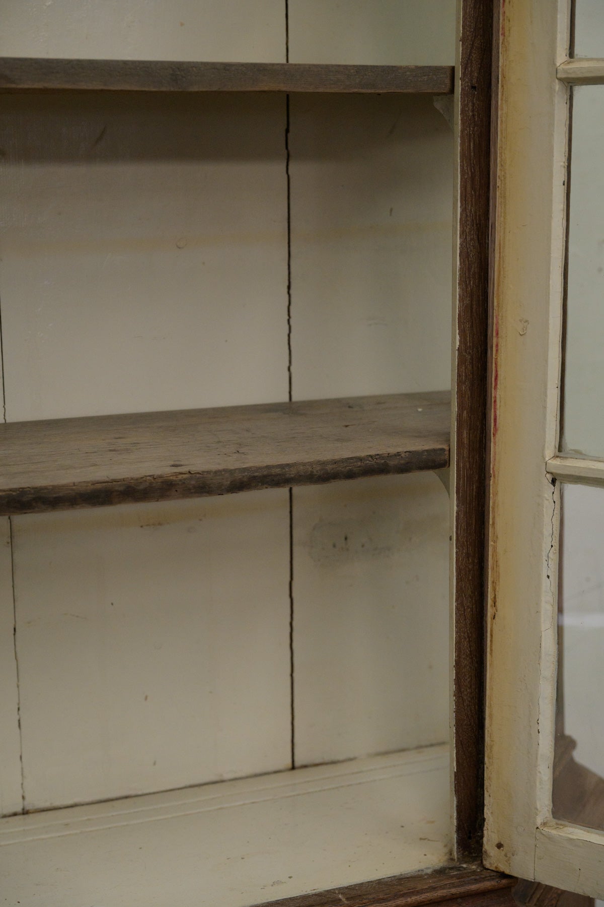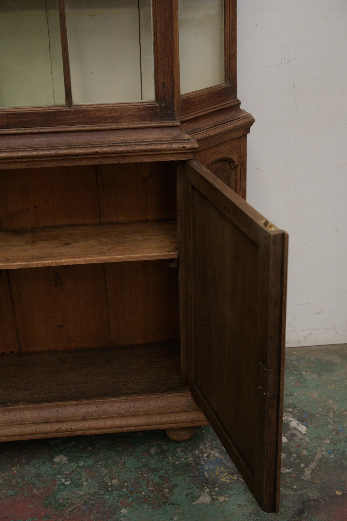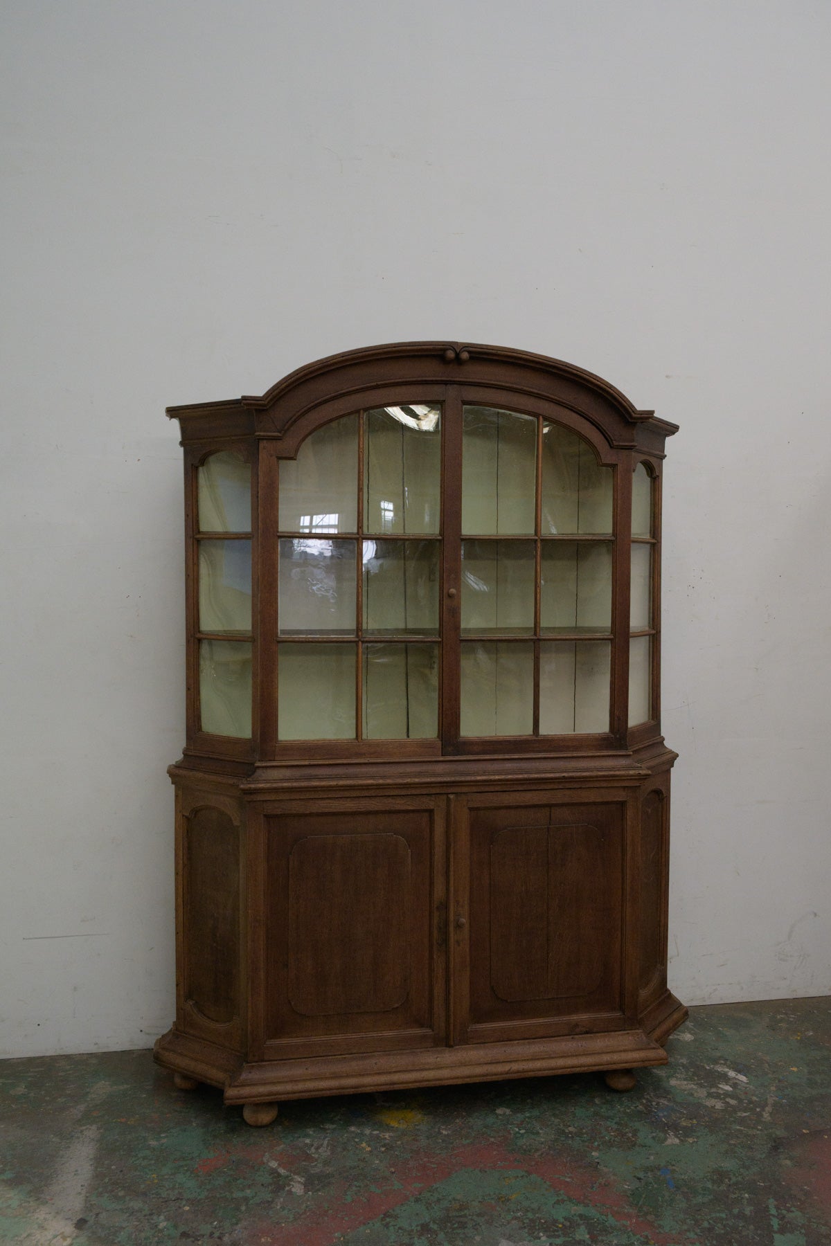 使い込んだオーク材の質感が素晴らしい19世紀の家具です。大きな家具ですが奥行が小さく、装飾も控えめでアーチ形の天飾りも端正で良いたたずまいです。棚板は取り外せます。薄いグリーンの古いガラスは一部割れていたので無色の新しいものに交換しています。