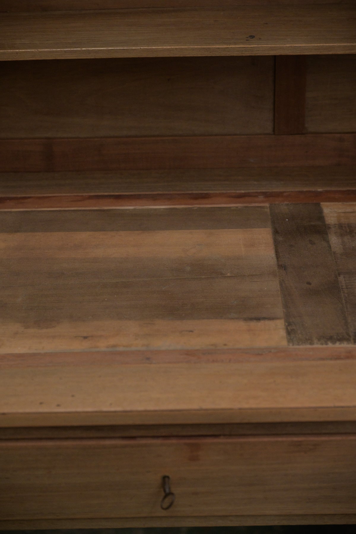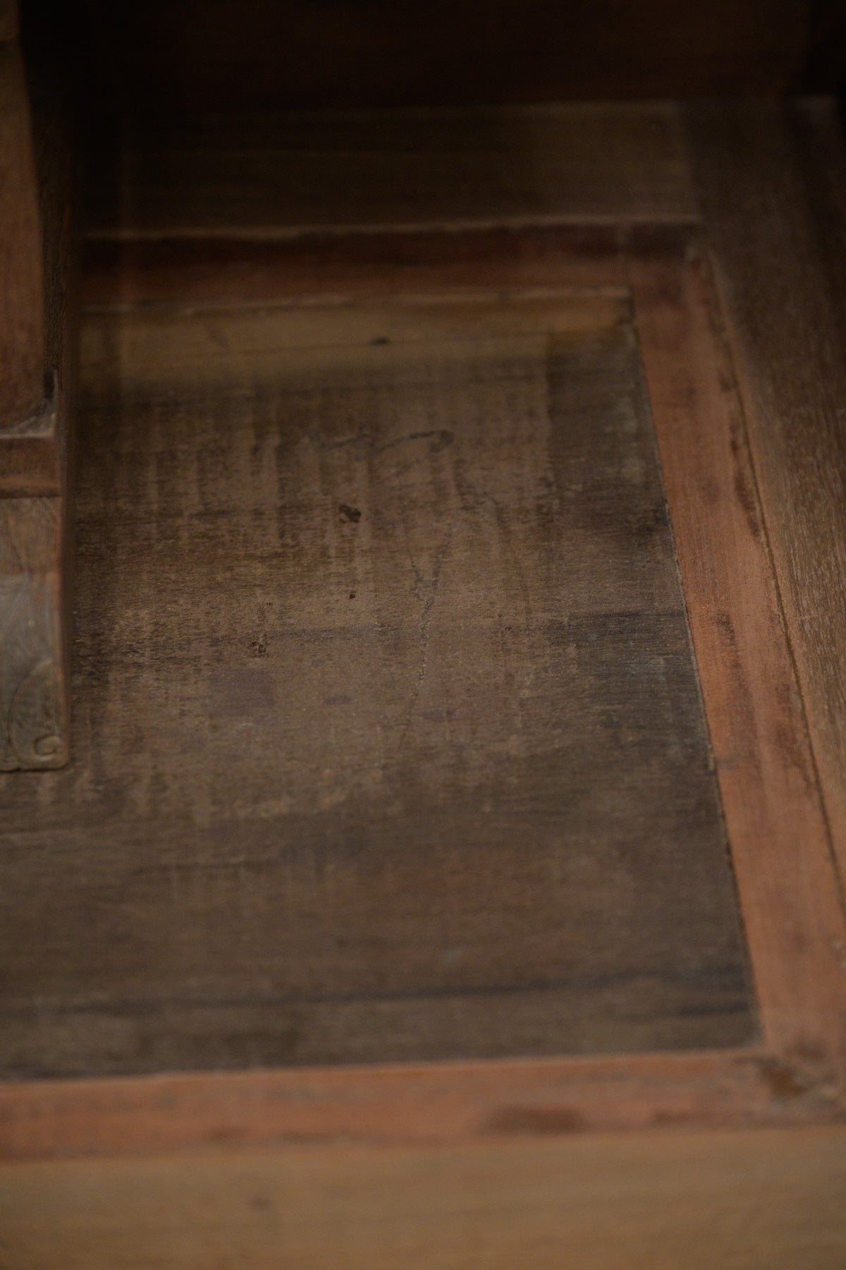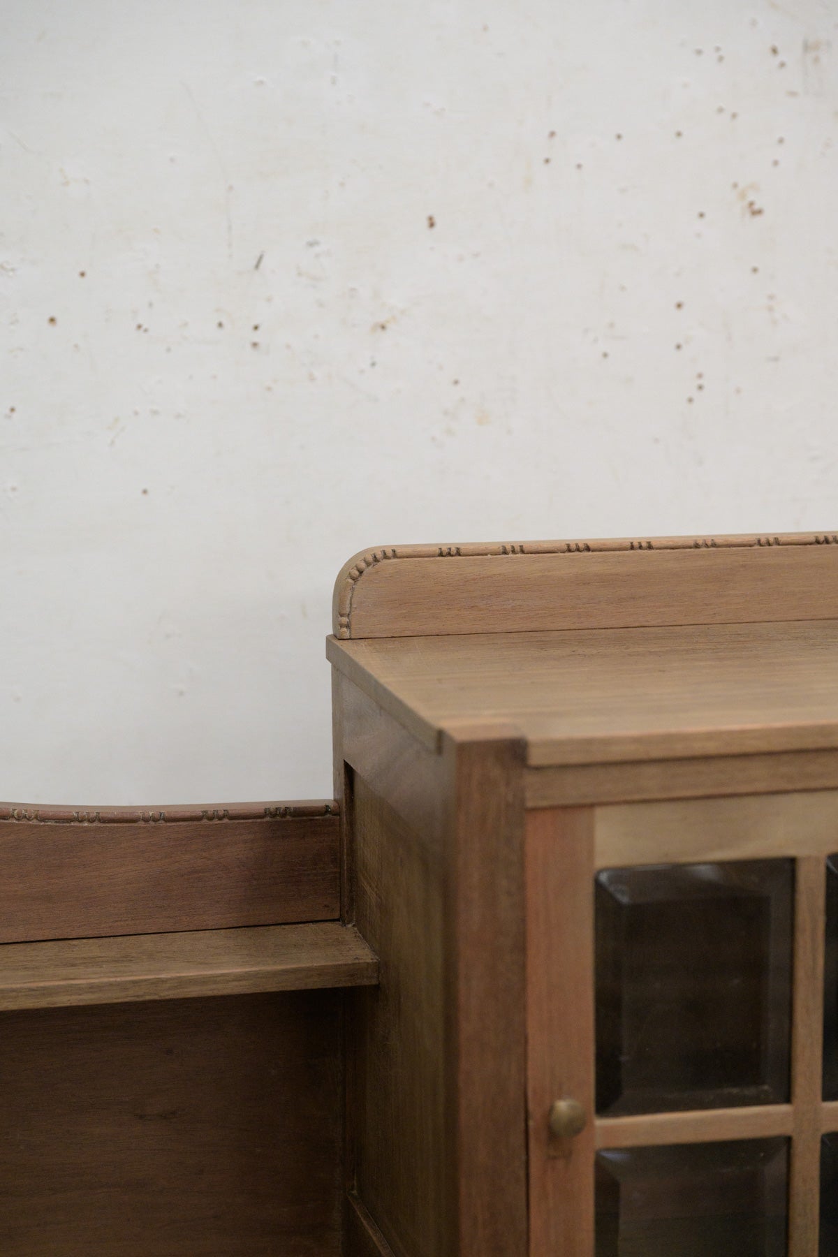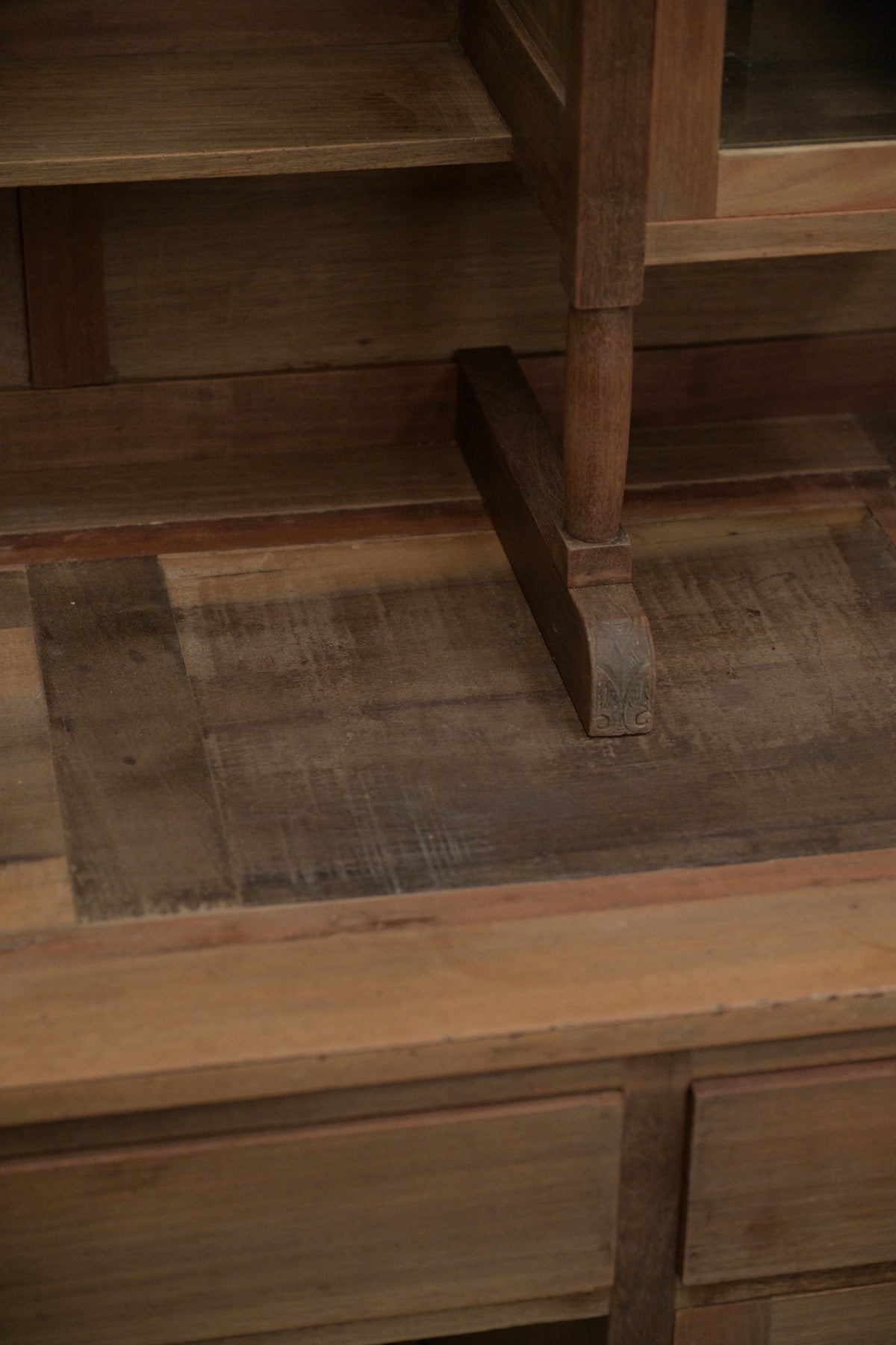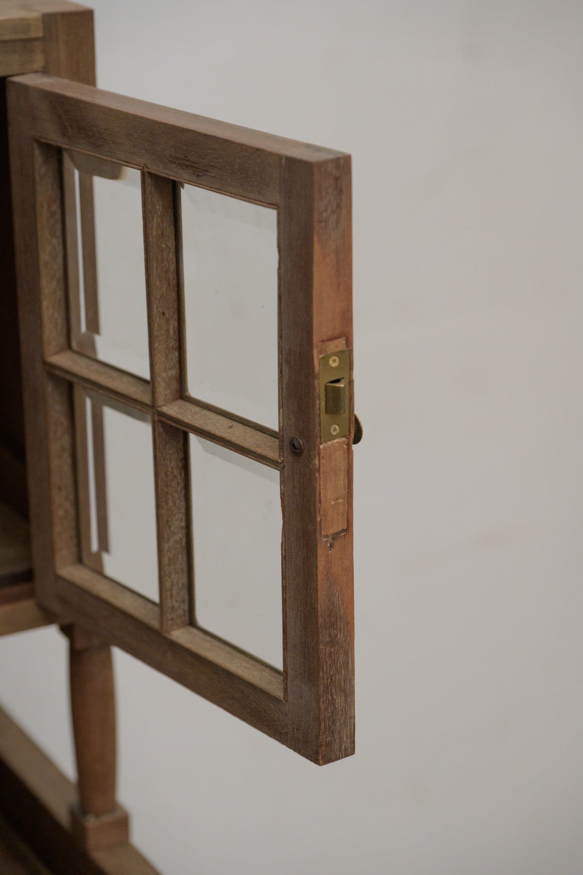 トップは裏面からビスを外すと、取り外せます。マホガニーの質感も良く、扉の中に引き出しも付いていて、小さなガラス扉等、魅力が盛りだくさんの家具。天板の飾りは取り外せます。鍵はかかりません。