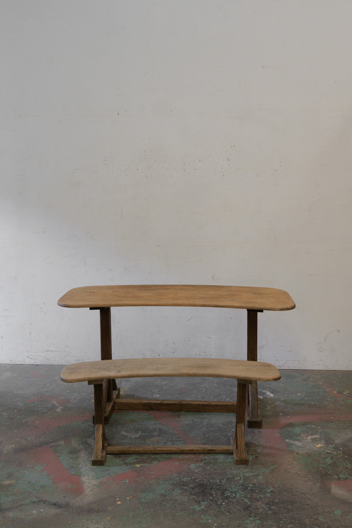 ベンチの座面とテーブル天板が同じ曲線でカットされており、古い手作りの素朴さもありながら有機的でモダンなデザインの家具です。材質はパイン。1900年台前半のめずらしい家具です。