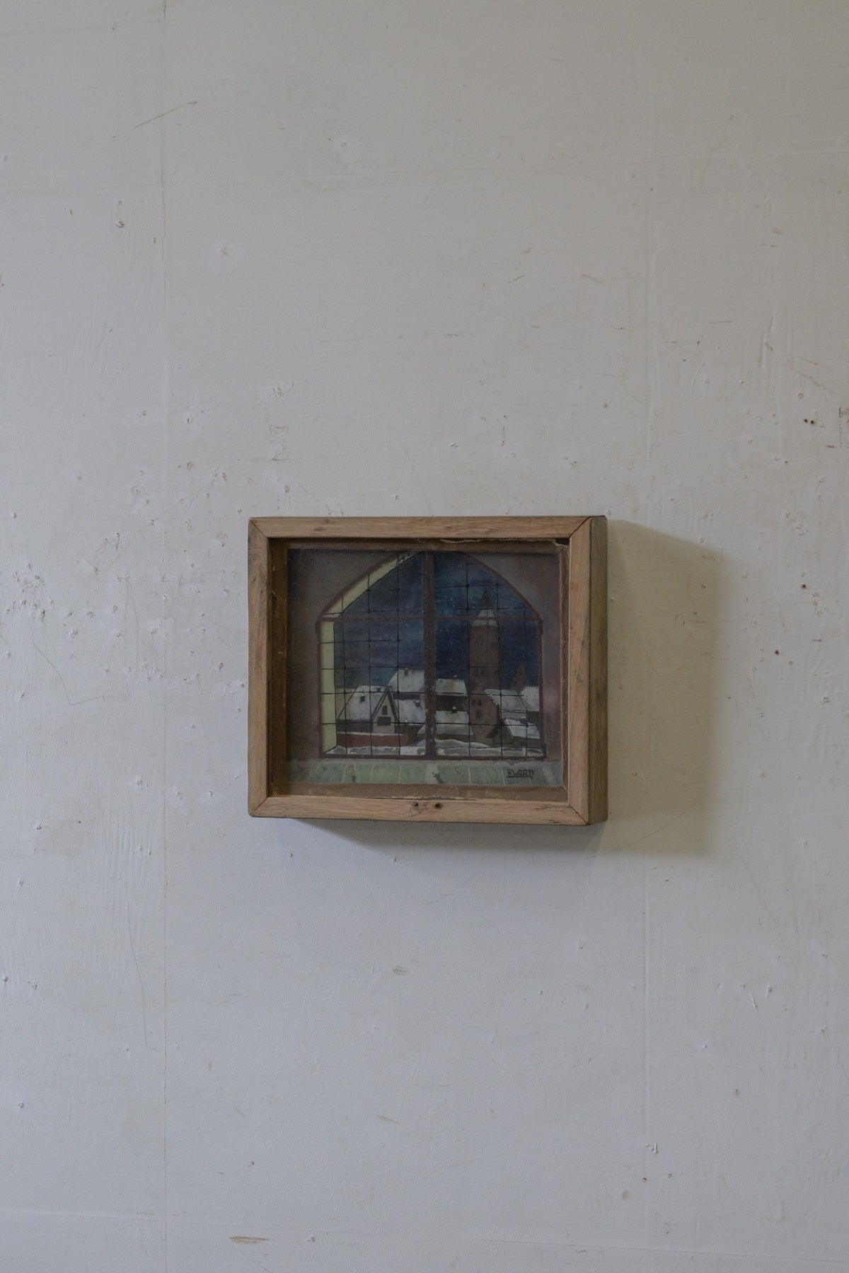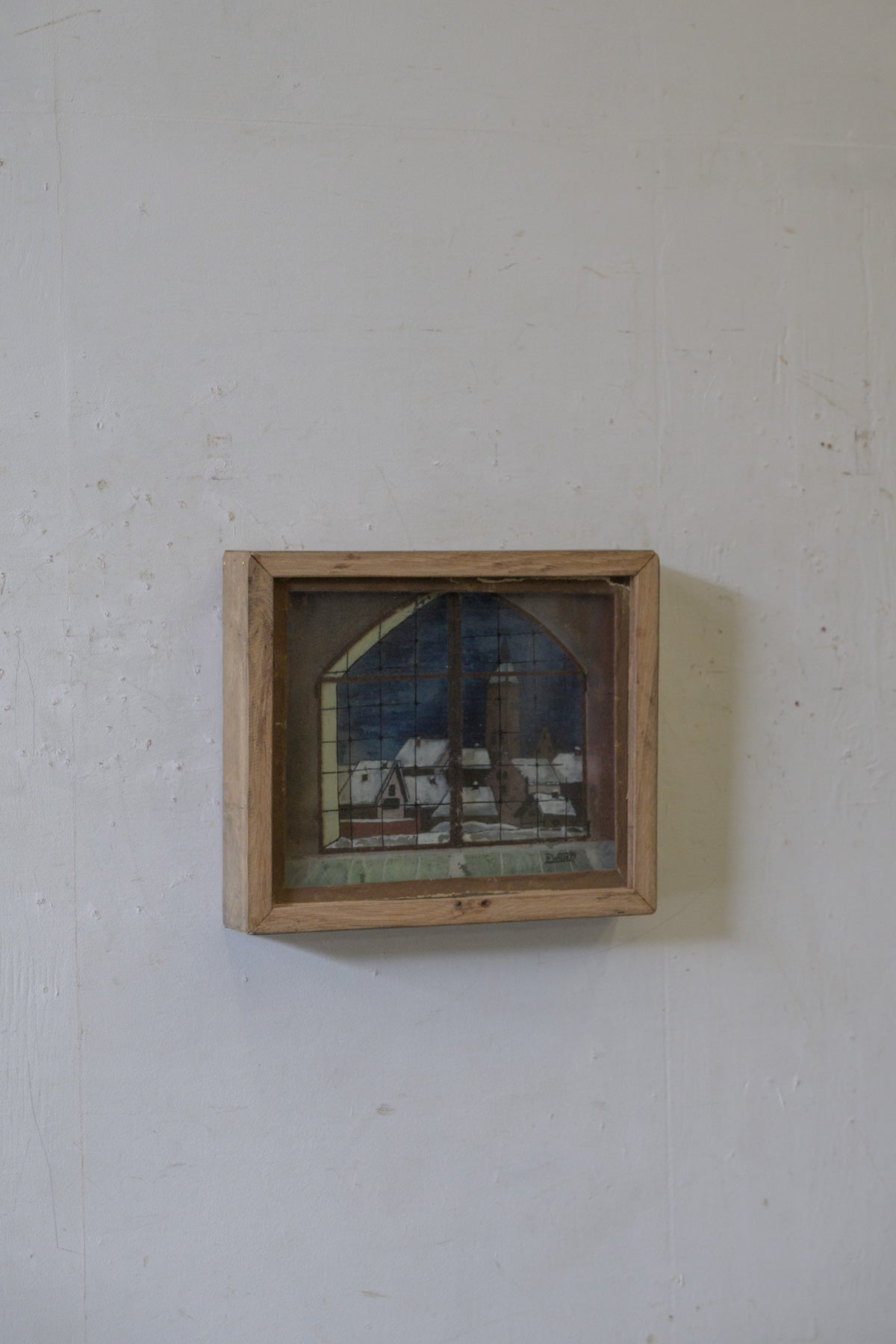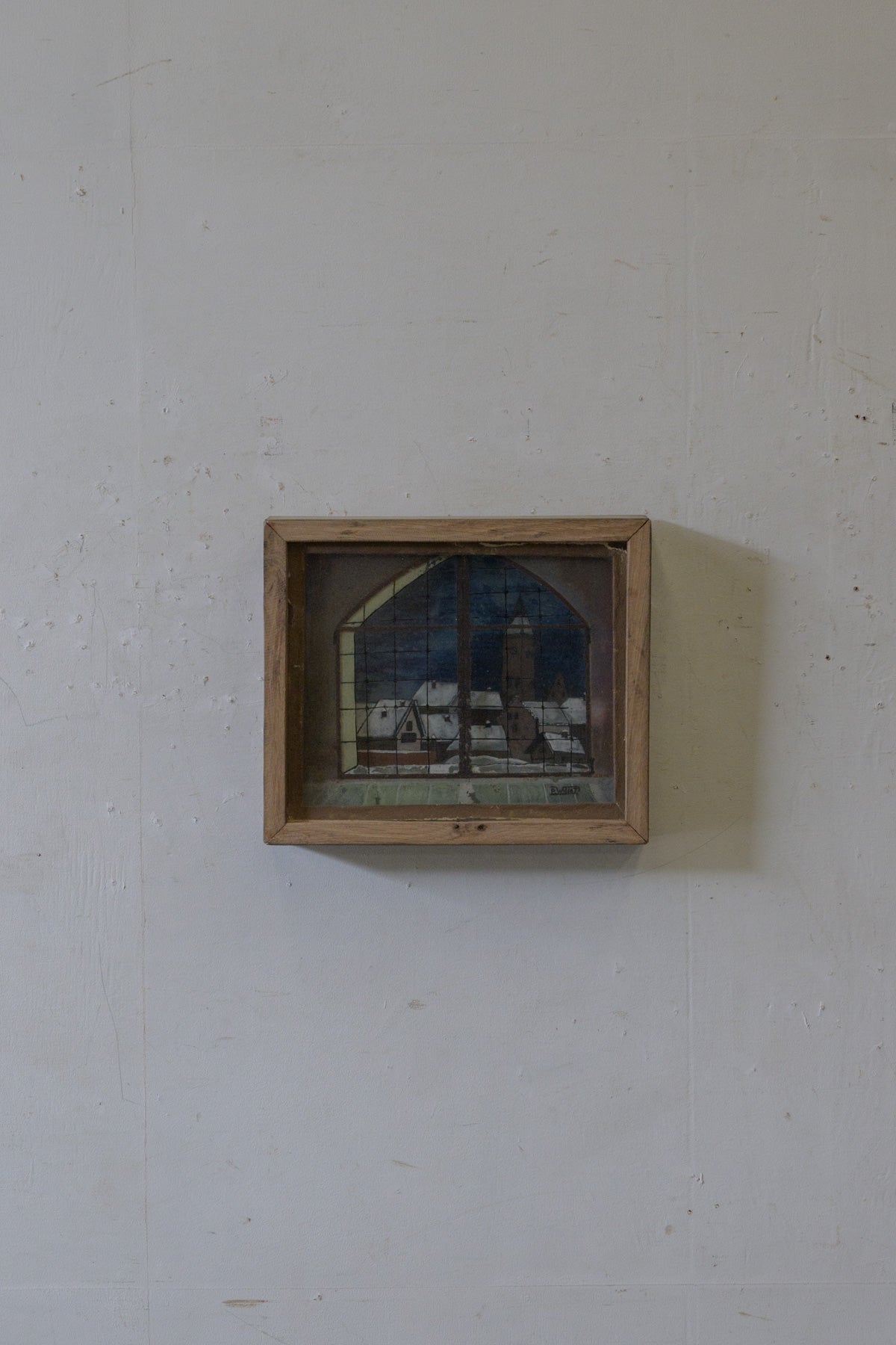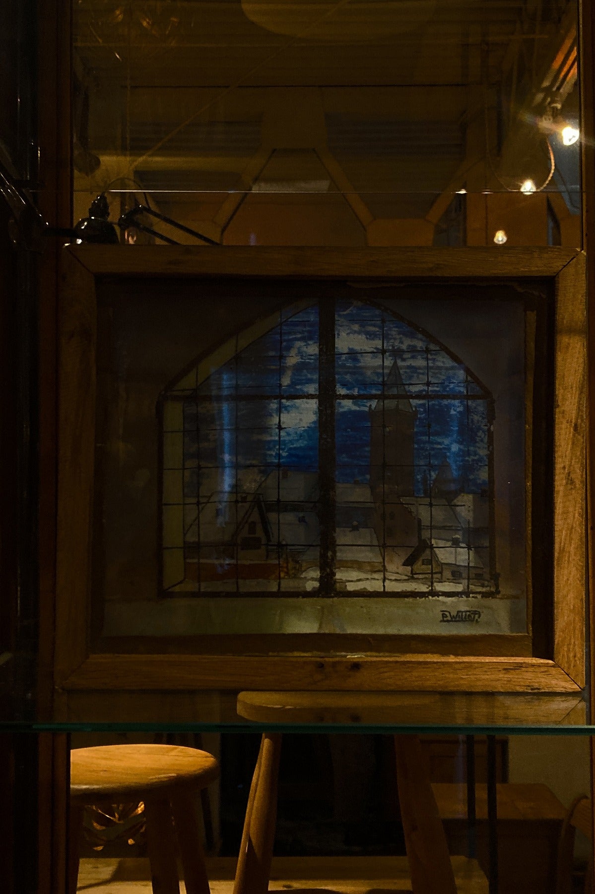 窓から見える教会と街並みの風景画で、背景、街並み、窓枠がそれぞれガラスに描かれ、3層に重ねられていて、裏から光を当てると風景が立体的に見えてきます。素朴なタッチや工夫された構造も含めて、とても魅力的な絵です。