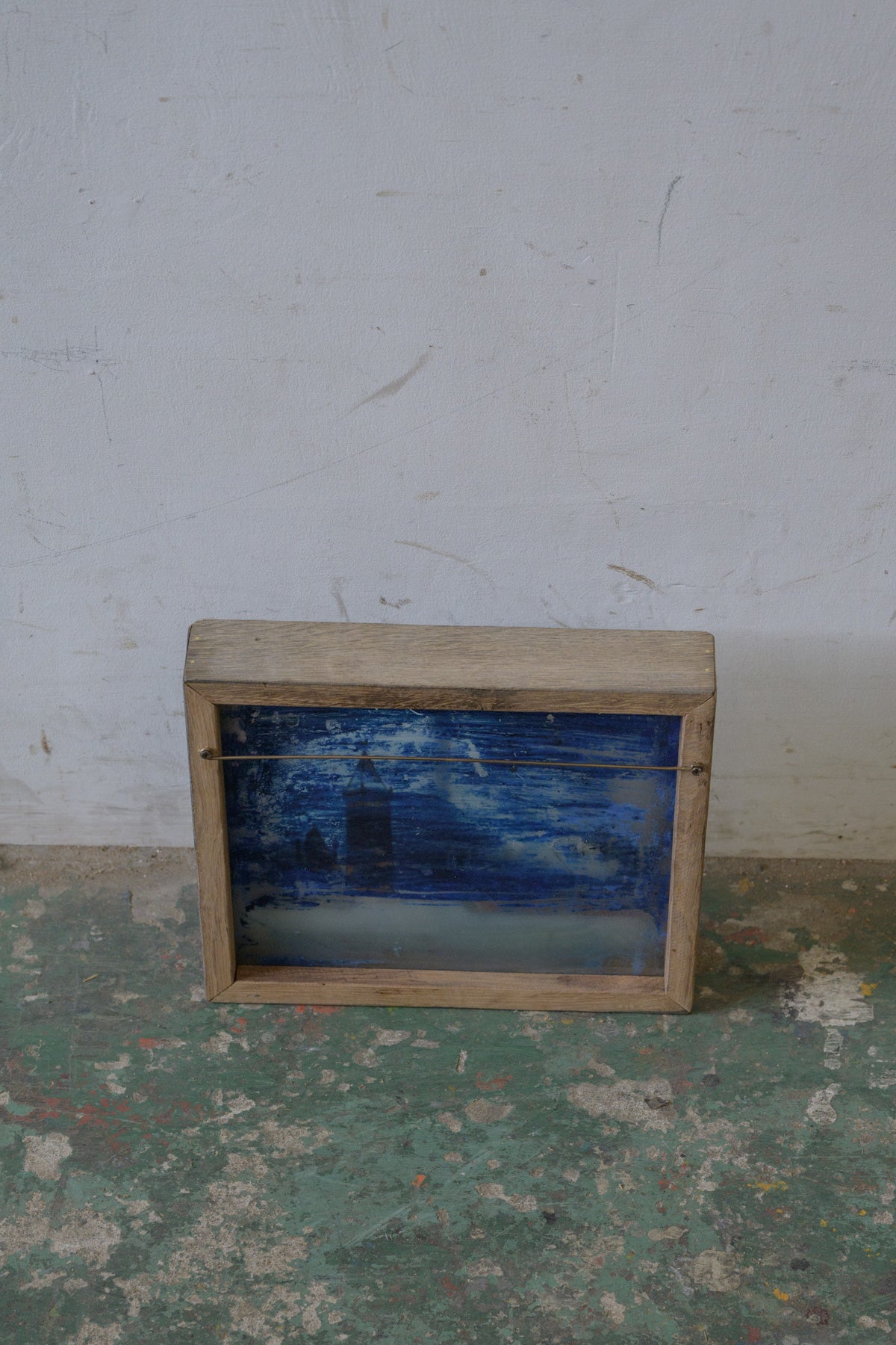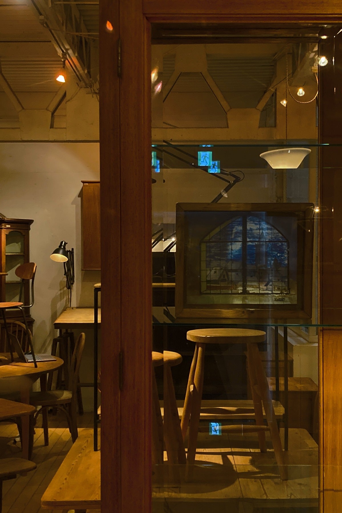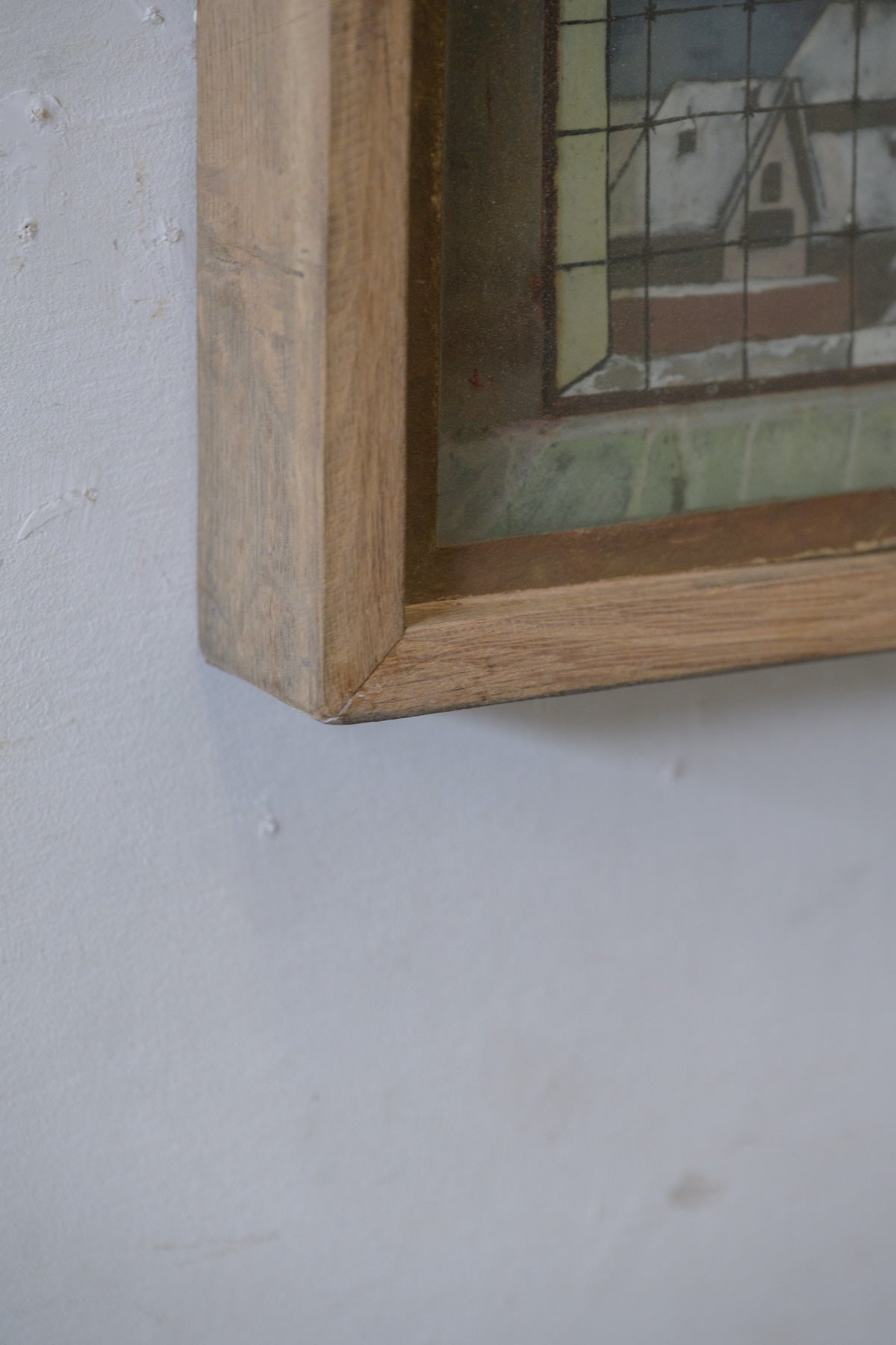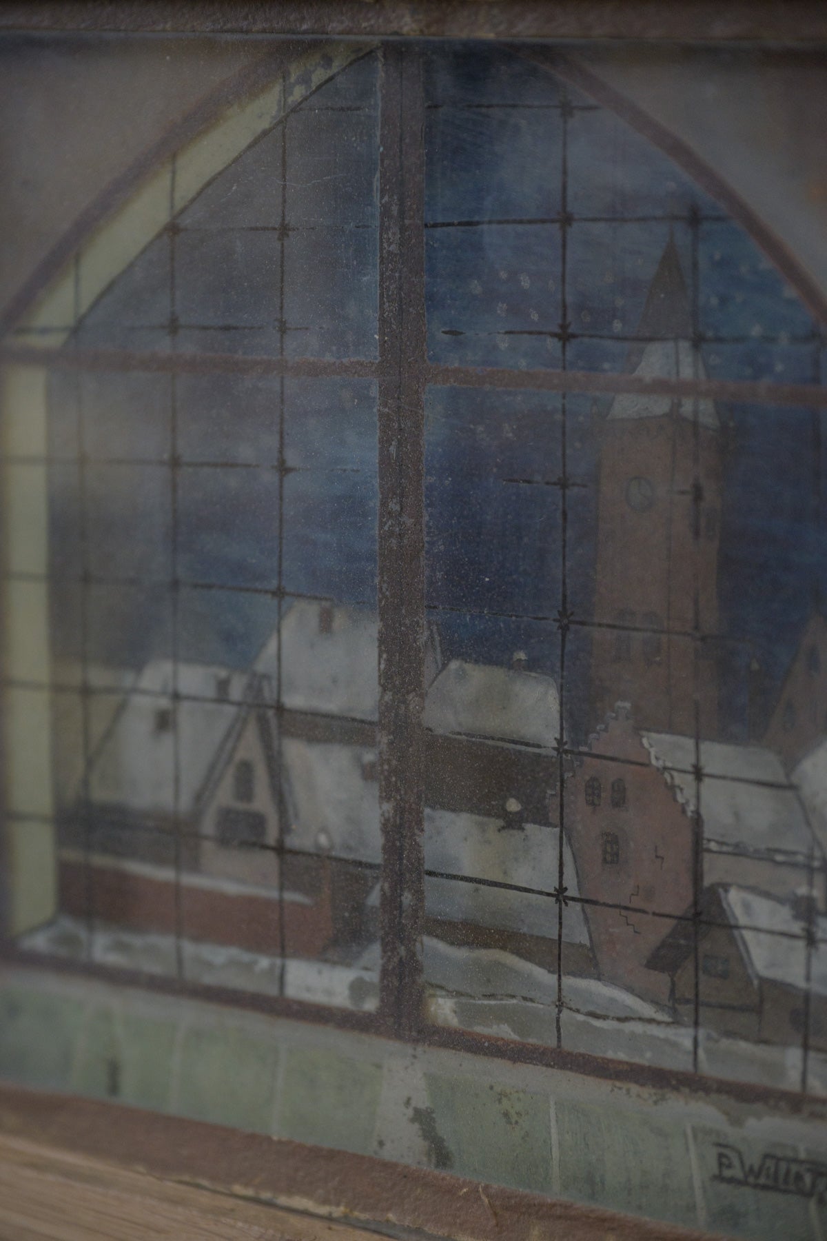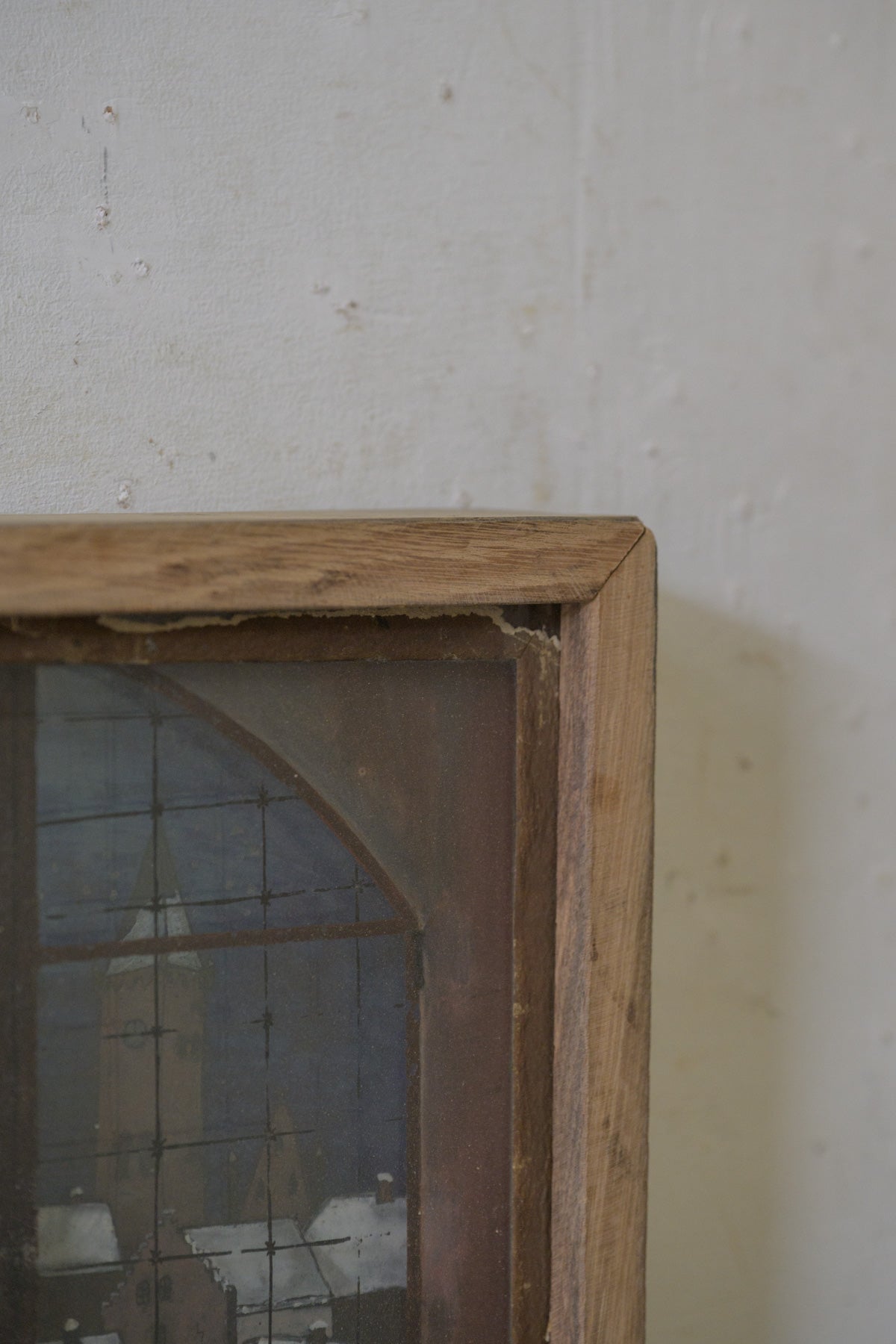 窓から見える教会と街並みの風景画で、背景、街並み、窓枠がそれぞれガラスに描かれ、3層に重ねられていて、裏から光を当てると風景が立体的に見えてきます。素朴なタッチや工夫された構造も含めて、とても魅力的な絵です。