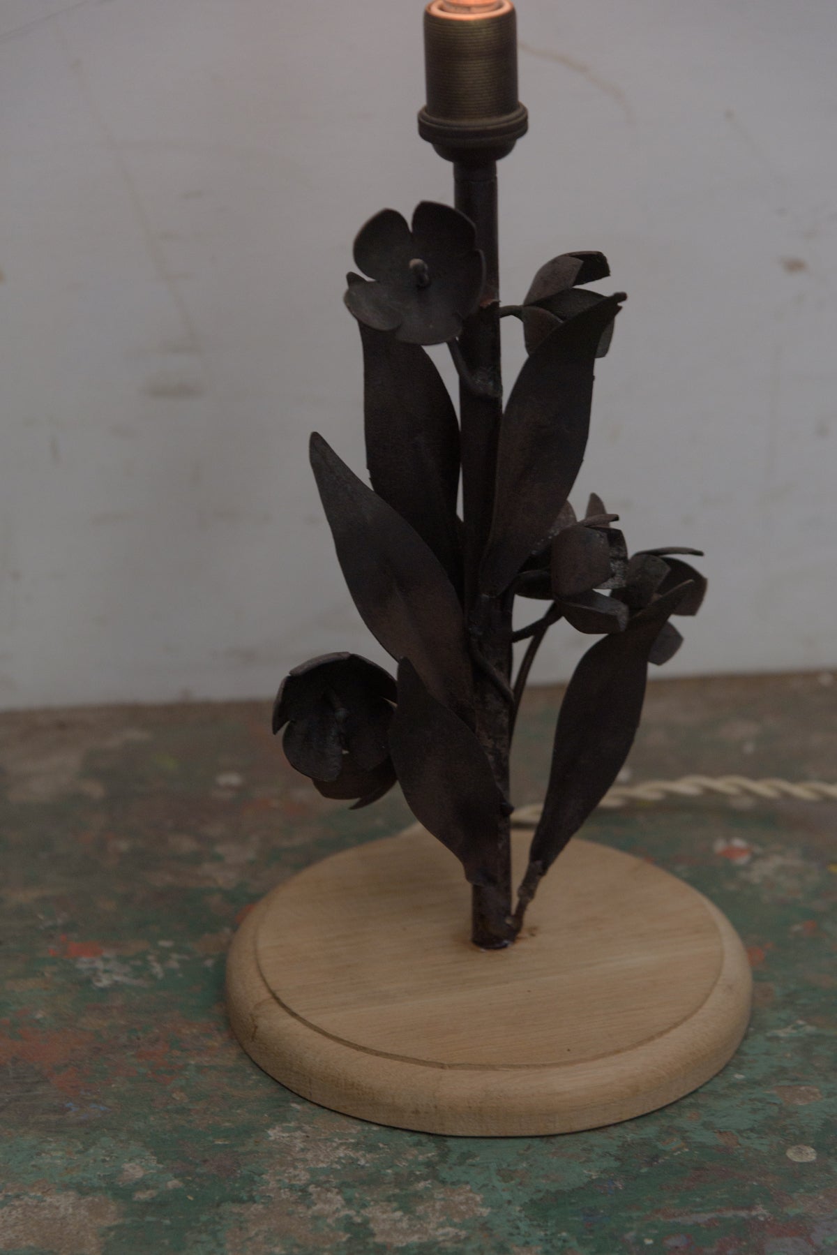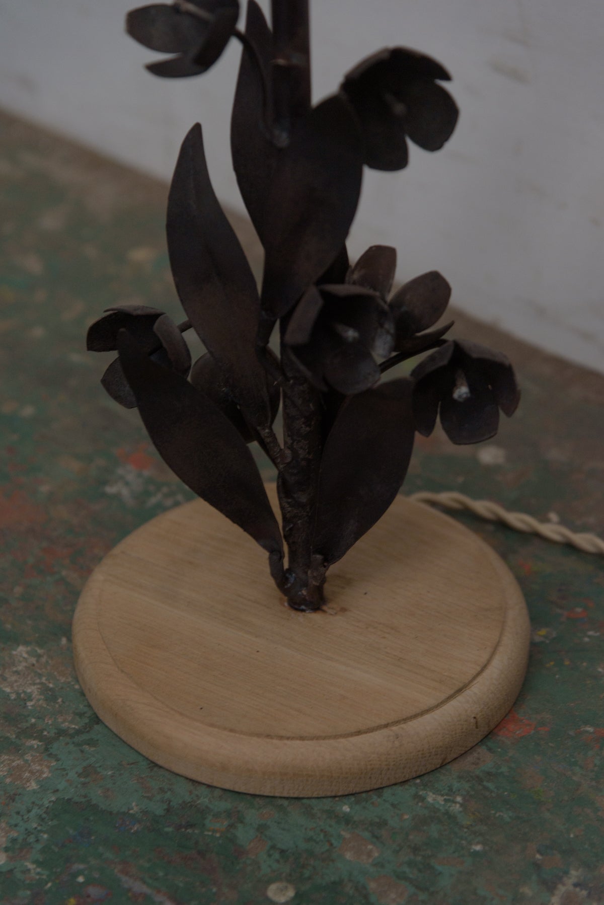 アイアンの植物モチーフのオブジェのようなランプ。木製のベースは当方で取り付けています。電気部品は日本の新しいものに交換しています。コードの長さは約2.5mでコンセントプラグ仕様。
