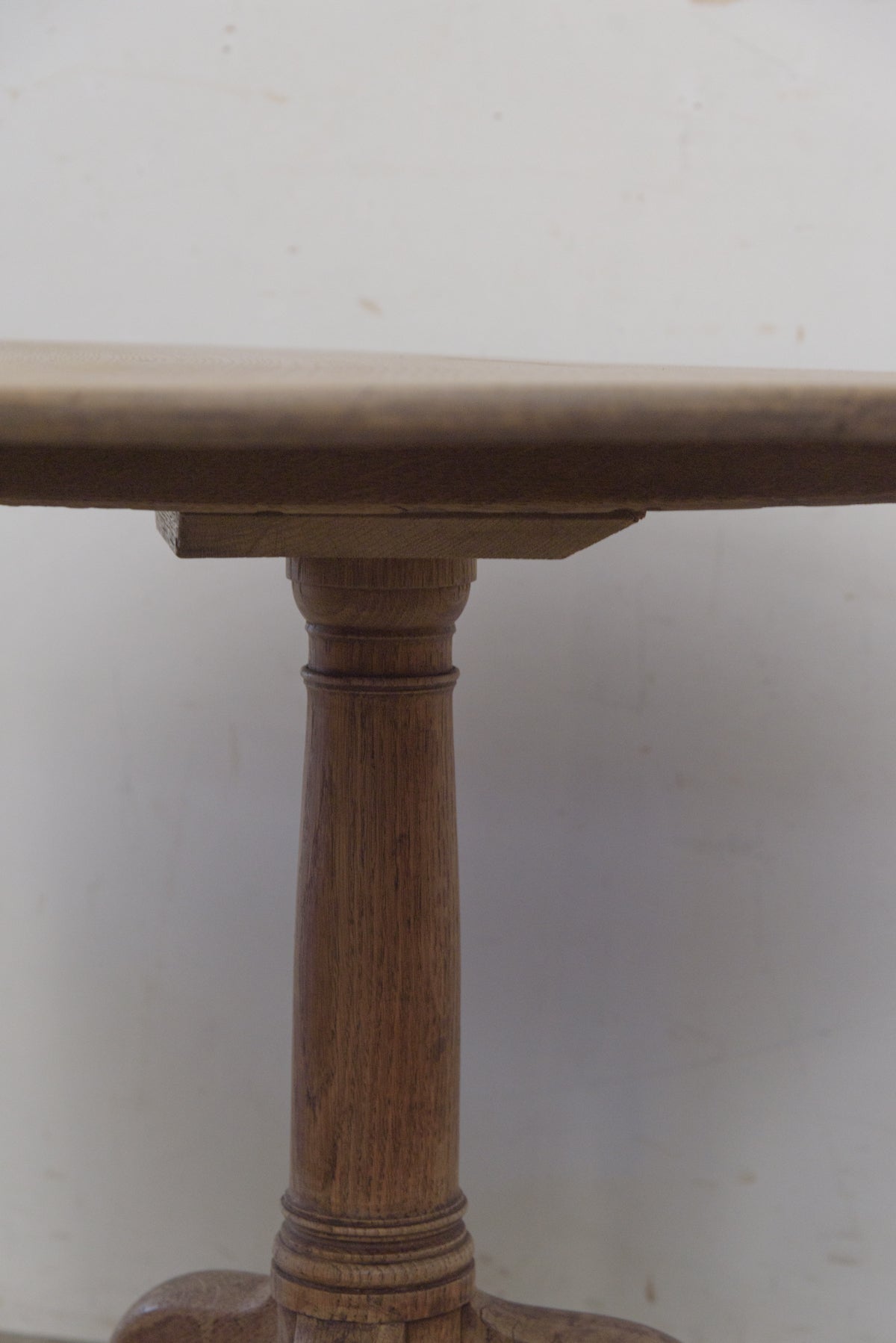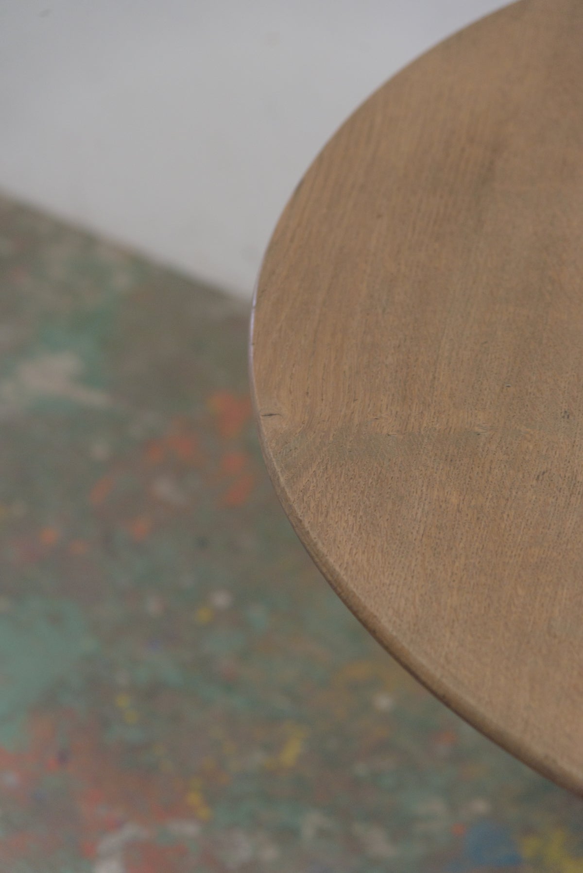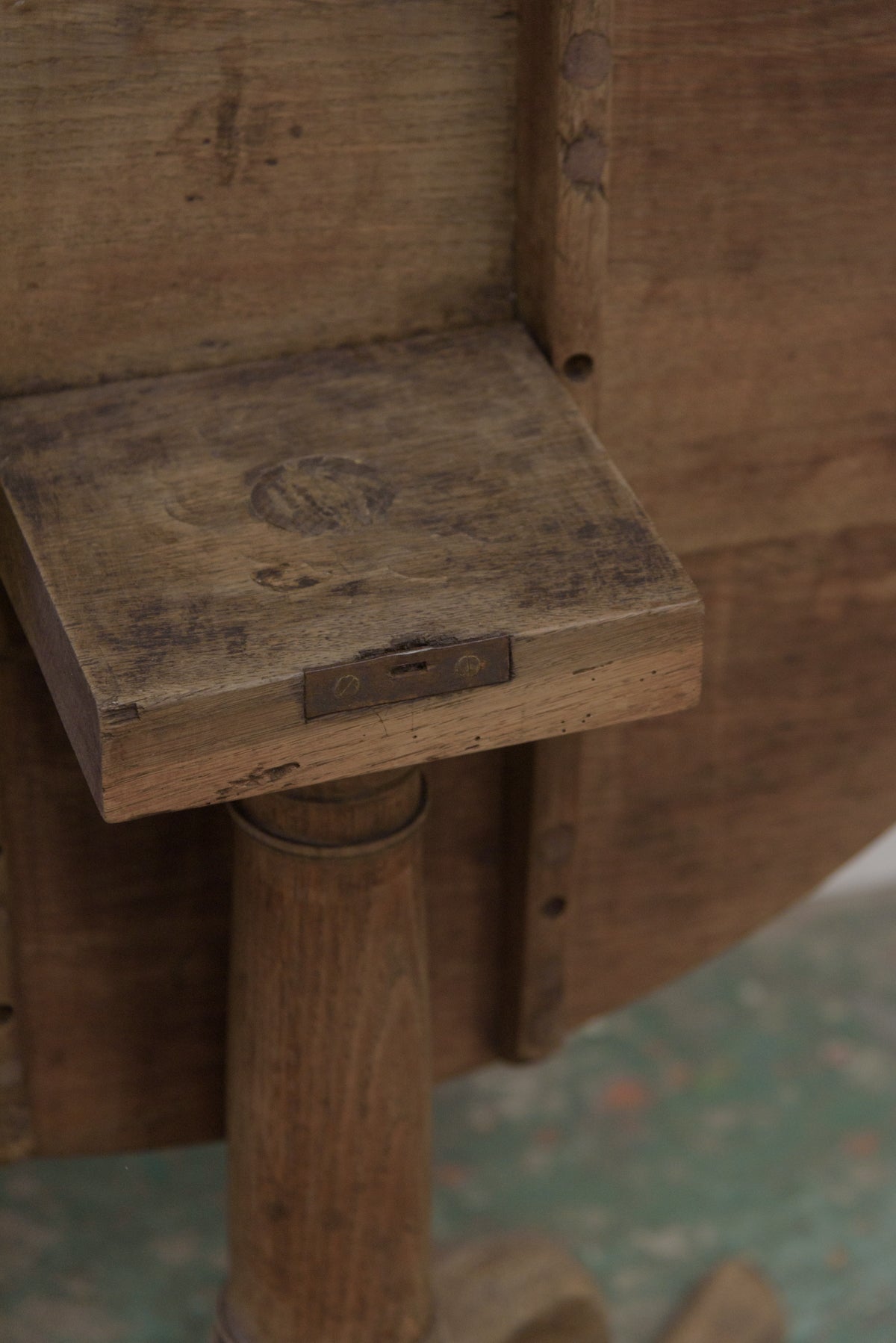 1900年代前半の家具で、材質はオーク。天板の裏にある真鍮のスイッチを押すと天板が立ち上がります。立ち上げた状態も絵になるので、飲食店の補助テーブルとしても。天板の状態も良く、サイズも使いやすい万能なテーブルです。