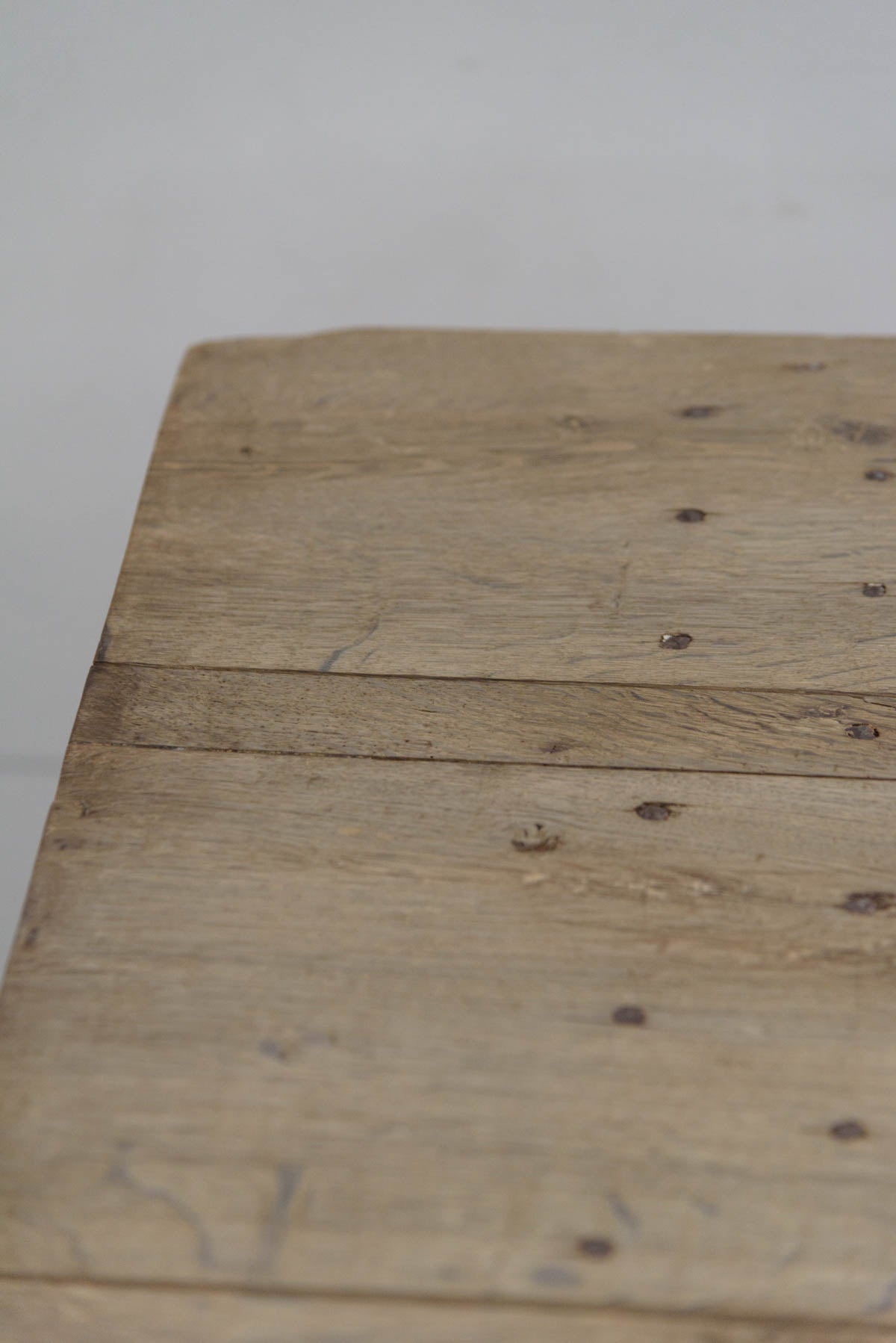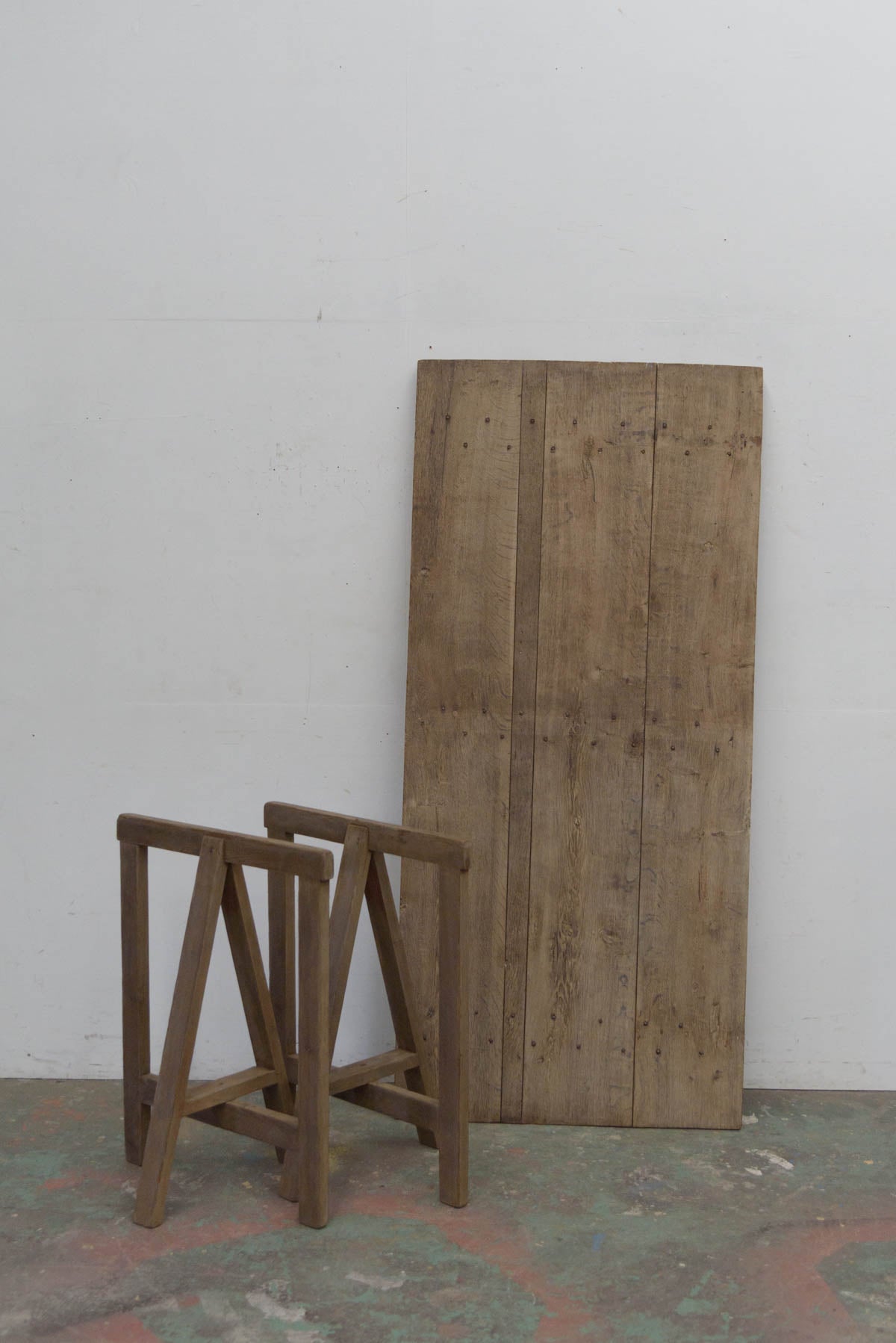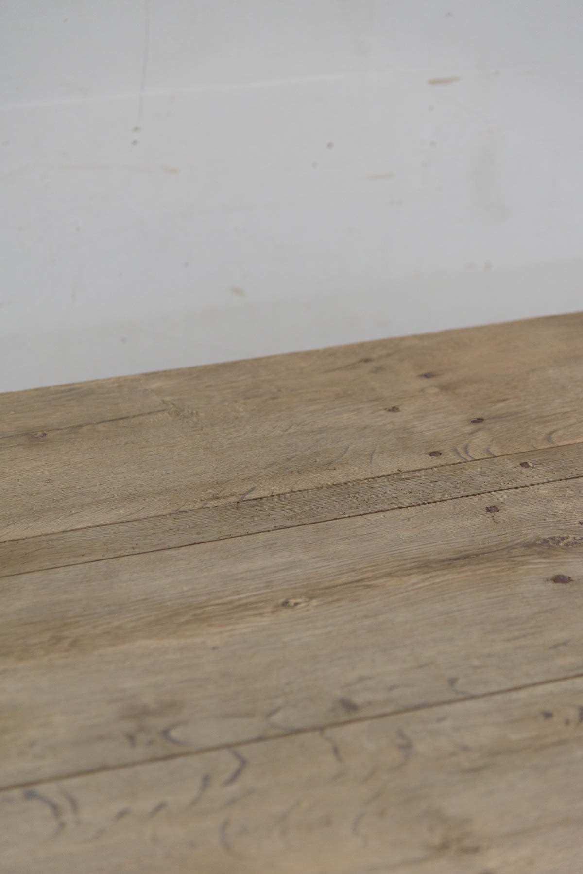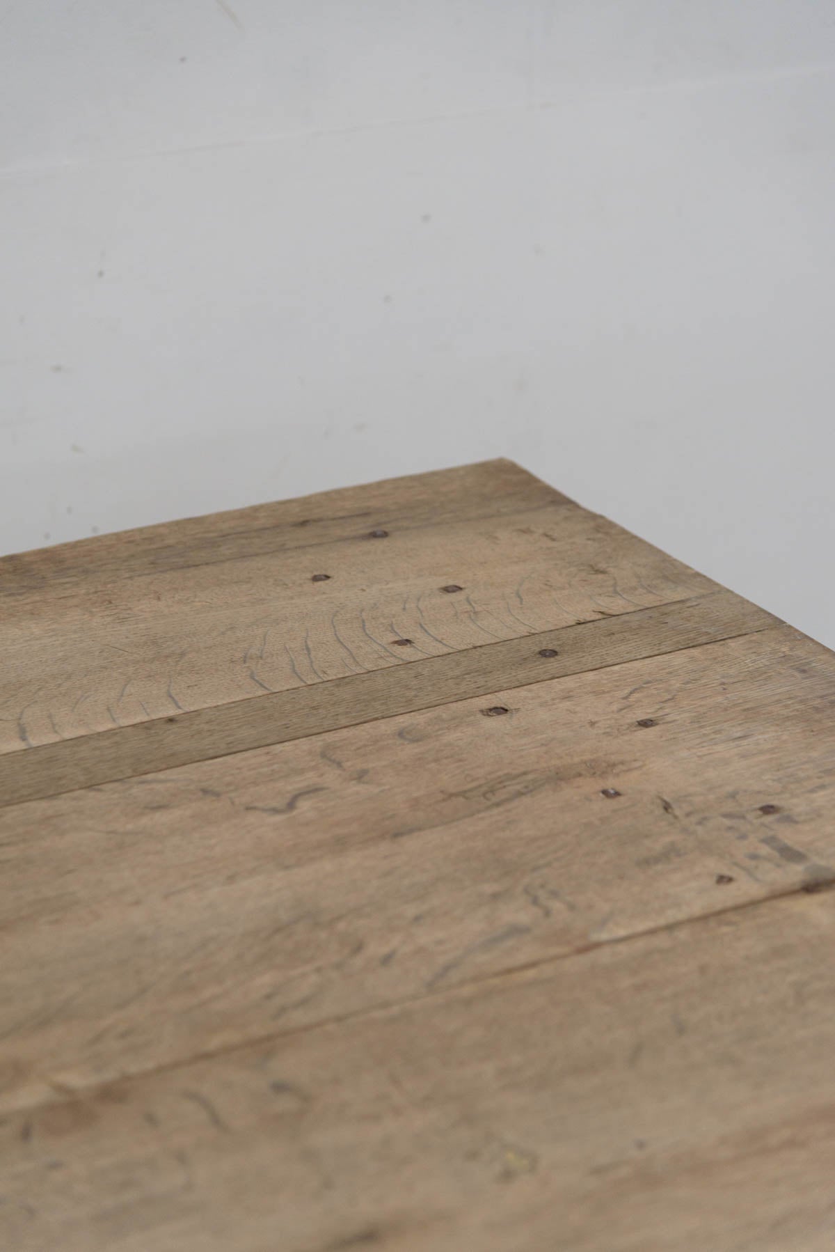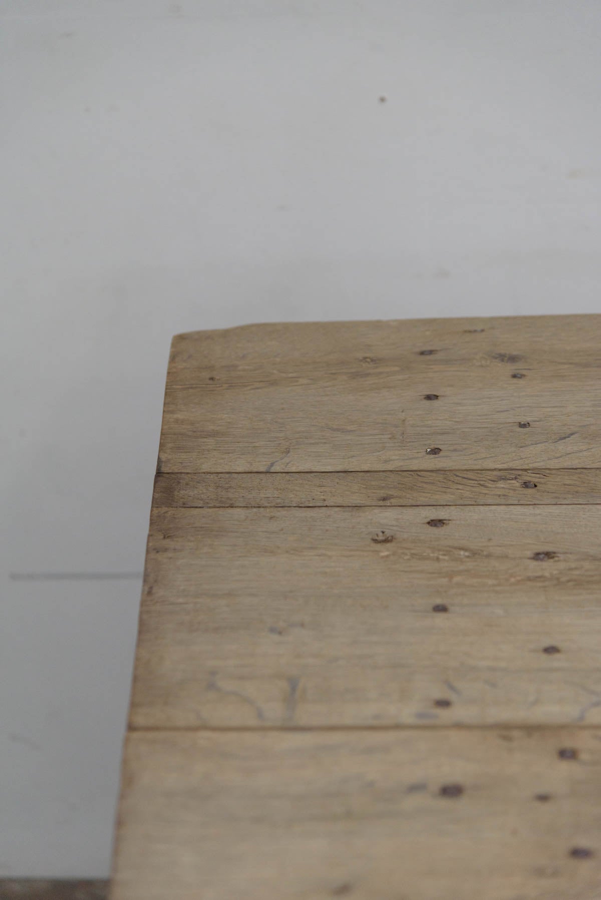 枯れたオークの質感が素晴らしい天板に、パイン材の脚。もともとは木工や修理業のアトリエで使用されていた作業台です。天板はのせてあるだけですが、重みもあるのでしっかり安定感もあり、ダイニングテーブルとしても。持ち運びもしやすいテーブルです。
