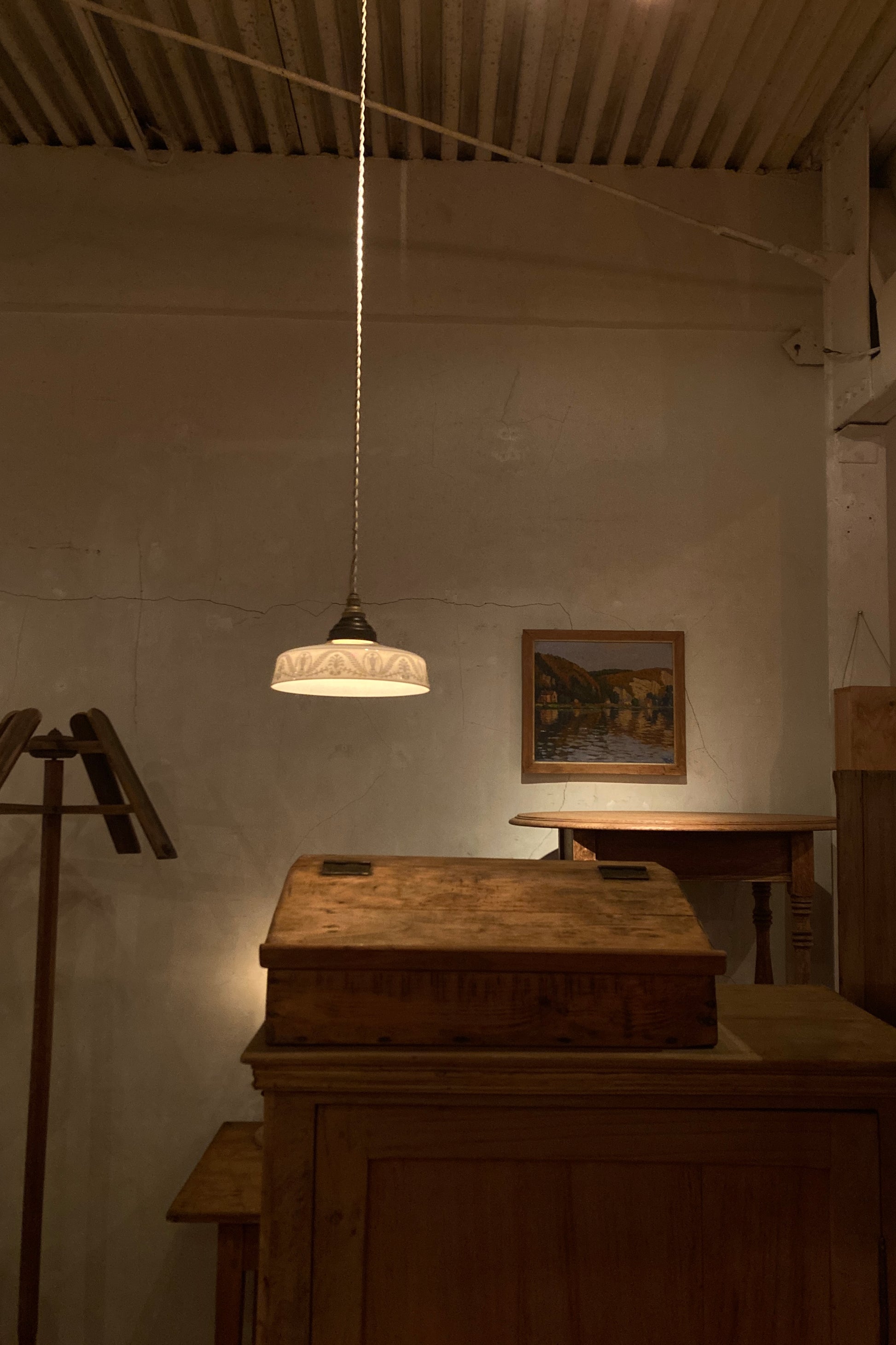 1920ー40年ごろの西ヨーロッパで作られたミルクガラスのペンダントライトです。
