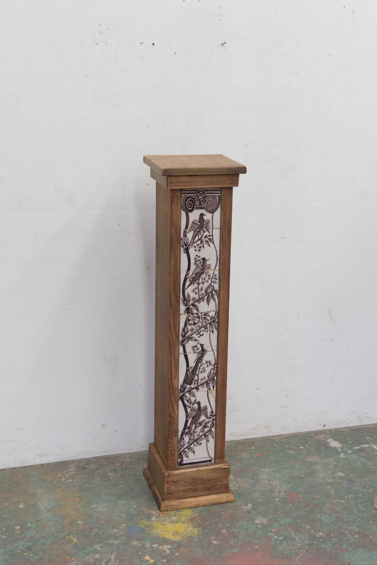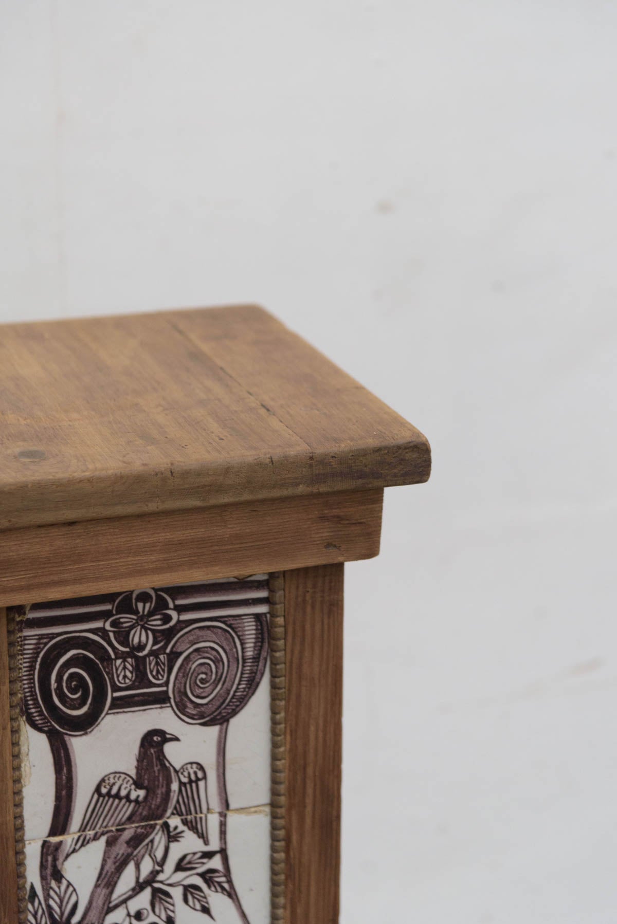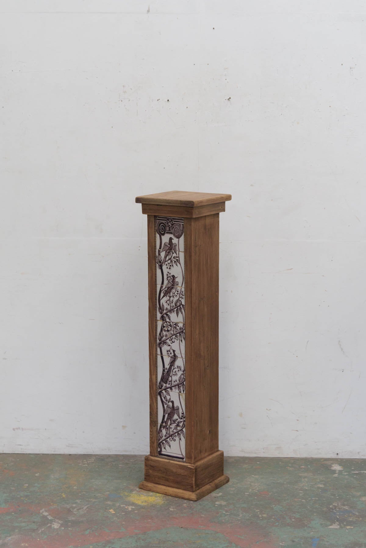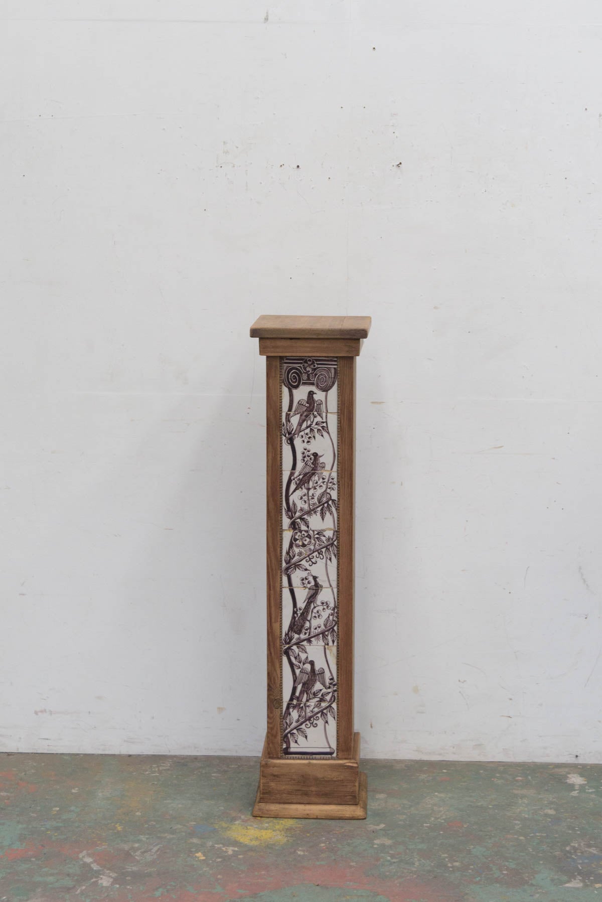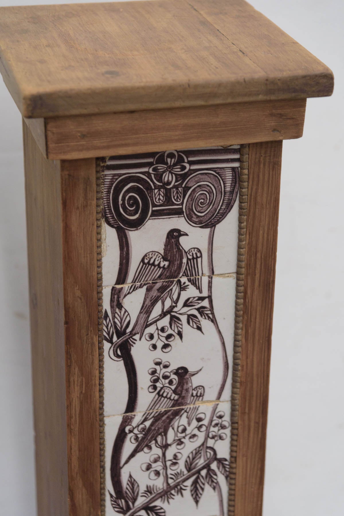 木製の枠に装飾タイルが組み込まれており、鉢植えや花器、彫刻などを置く台として1900年代初頭に作られたものだと思われます。オブジェとしても存在感のあるプランタースタンドです。