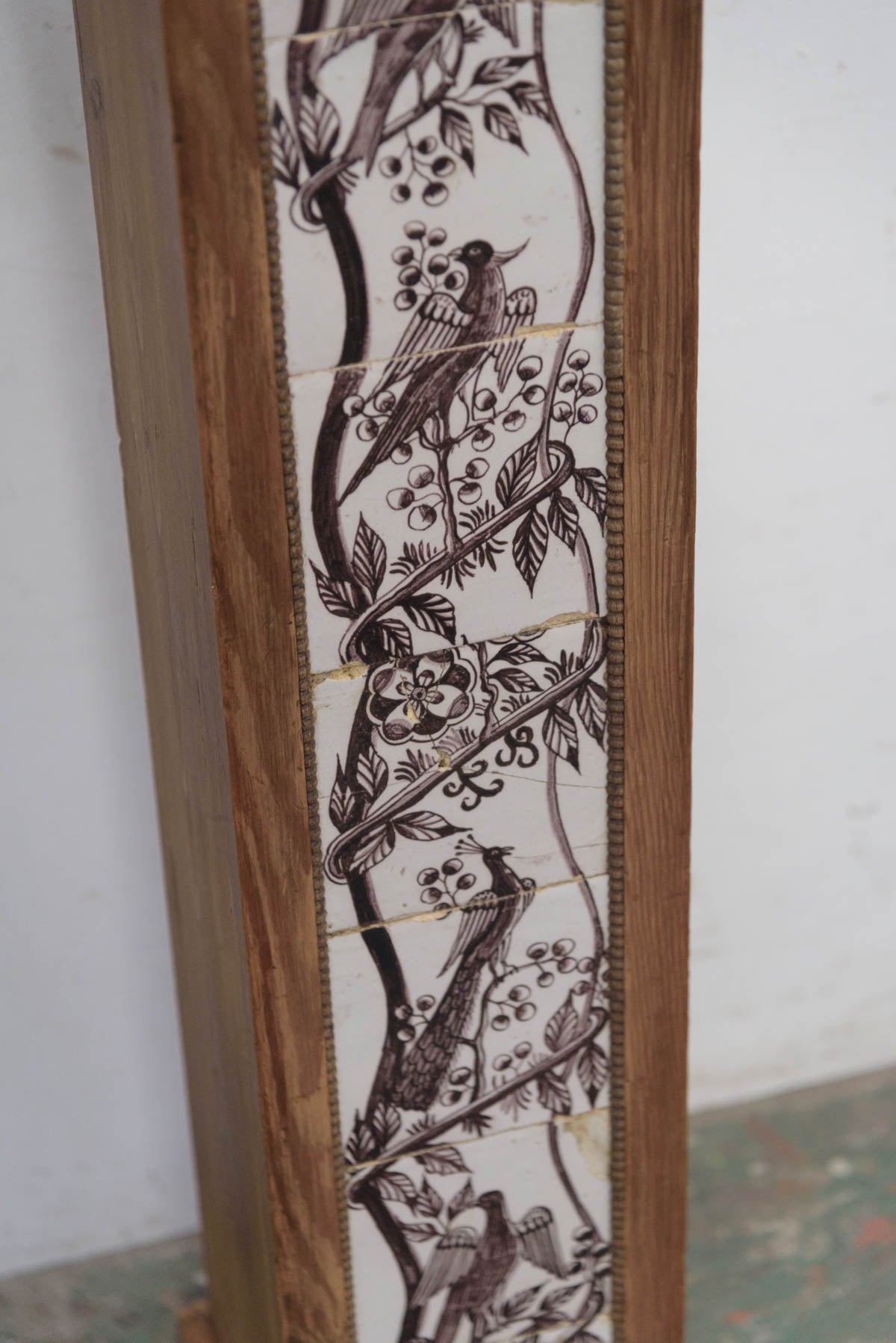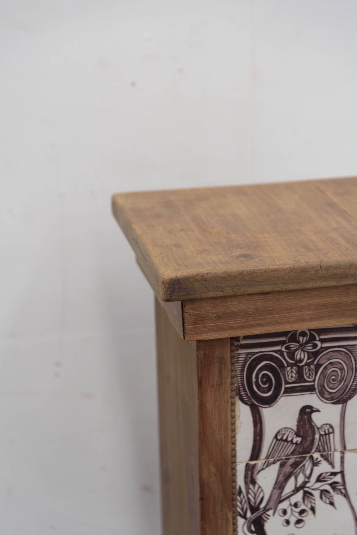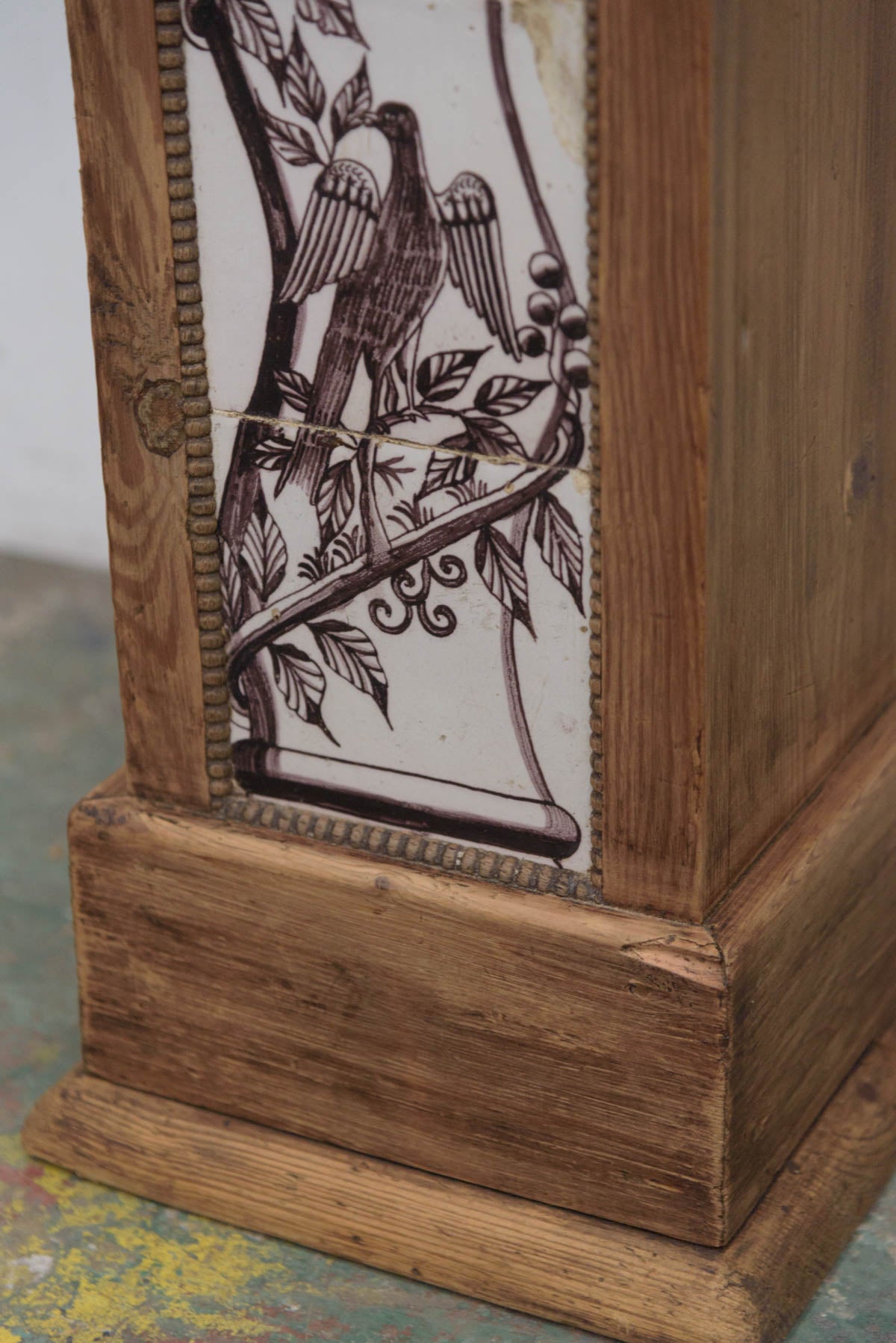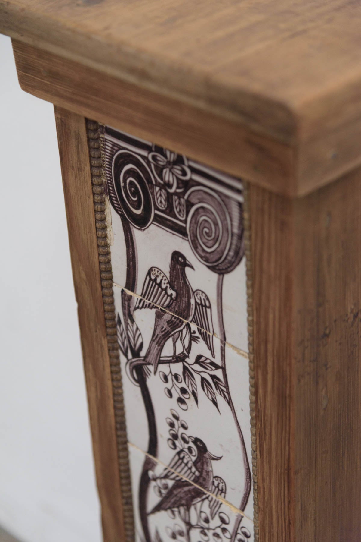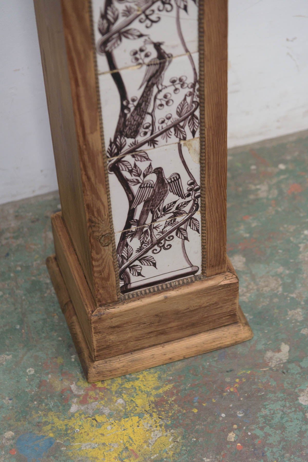 木製の枠に装飾タイルが組み込まれており、鉢植えや花器、彫刻などを置く台として1900年代初頭に作られたものだと思われます。オブジェとしても存在感のあるプランタースタンドです。