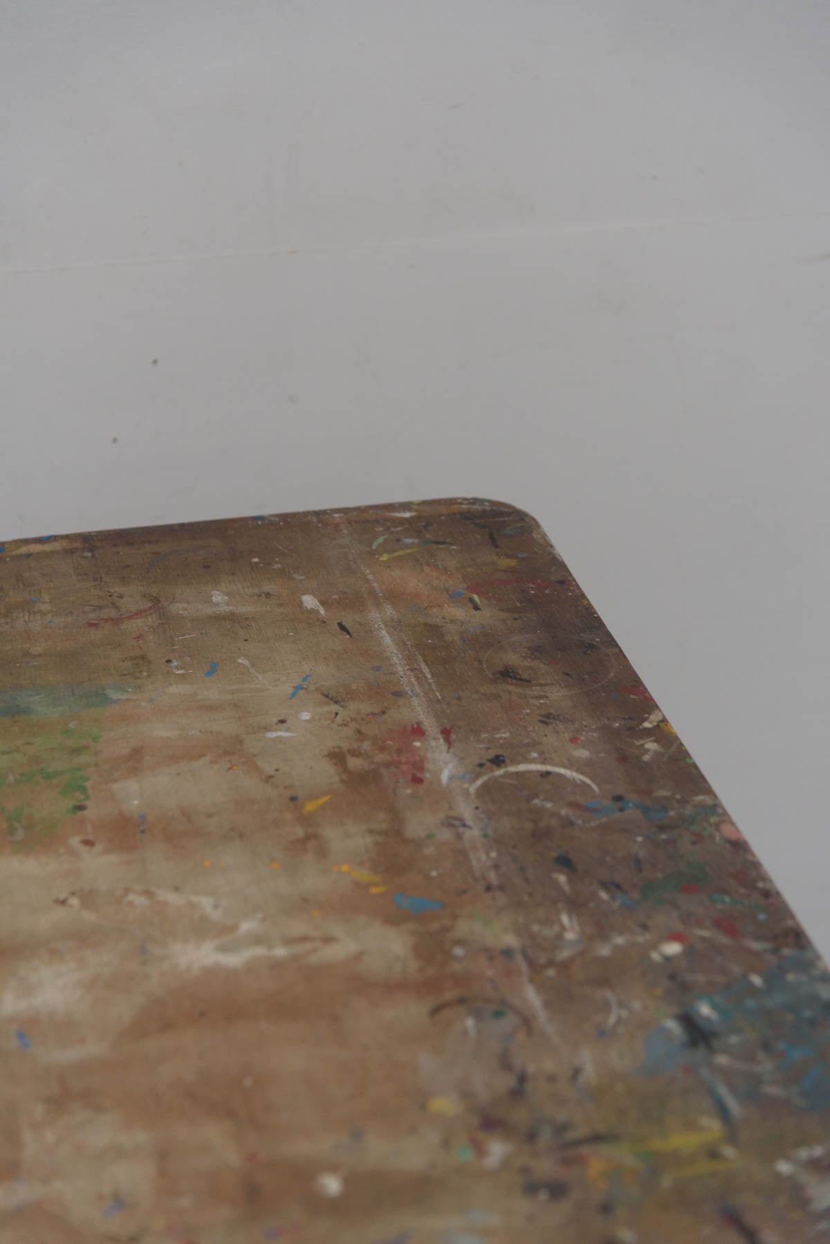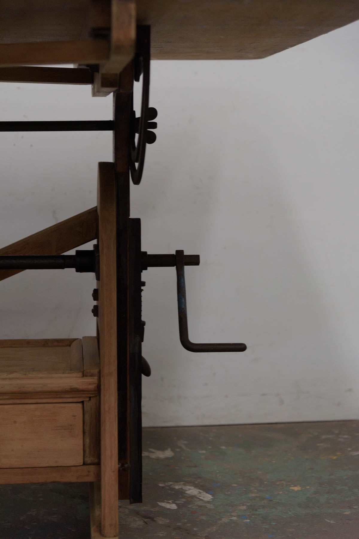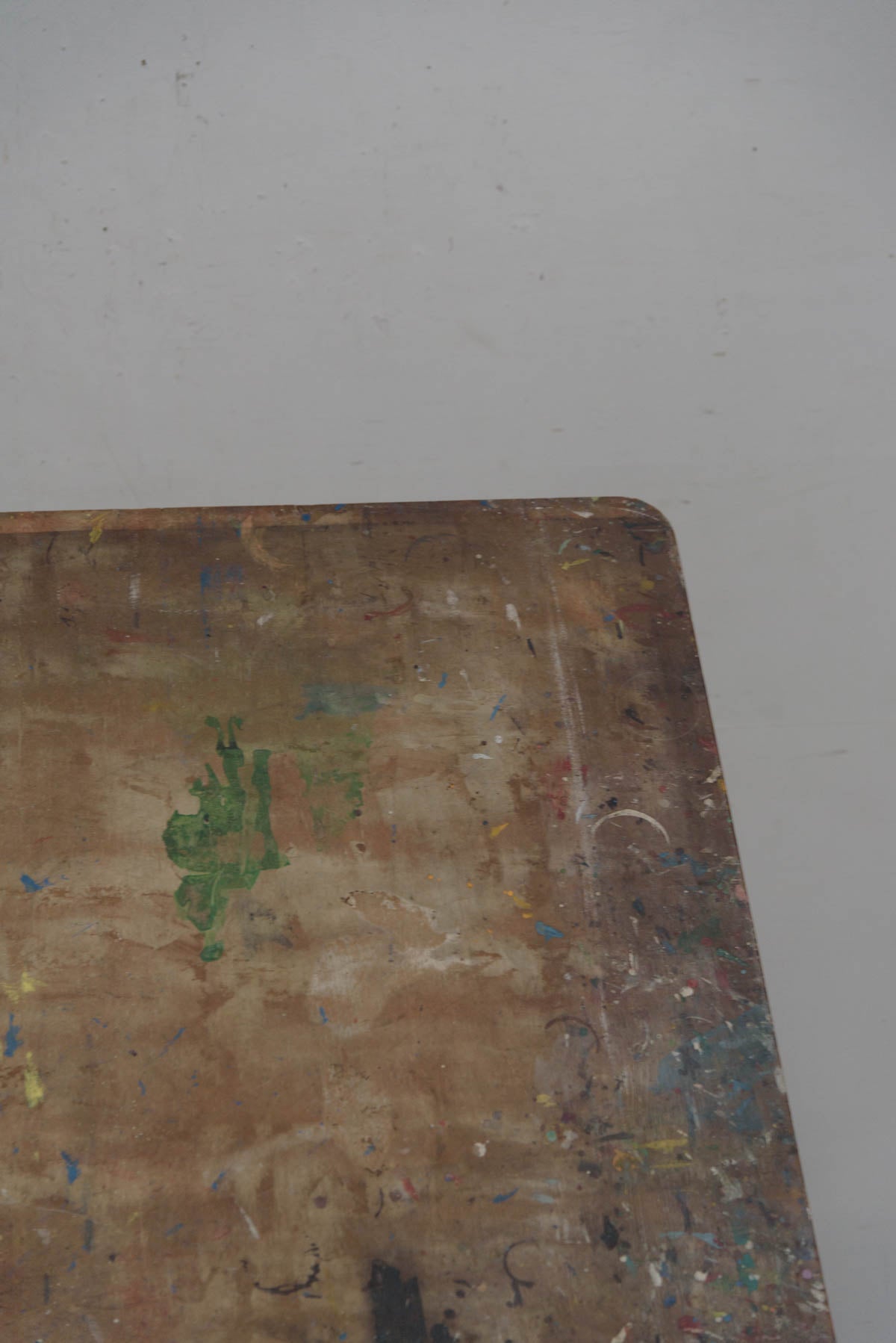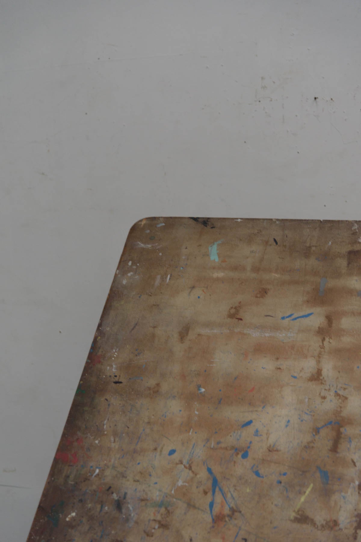 ベルギーの古い図面台です。角度や高さが調整できます。古い工業用の家具ですが天板のカラフルな絵の具とのバランスが絶妙で、天板をフラットにしてディスプレイ台やダイニングテーブルとしてもお使いいただけます。