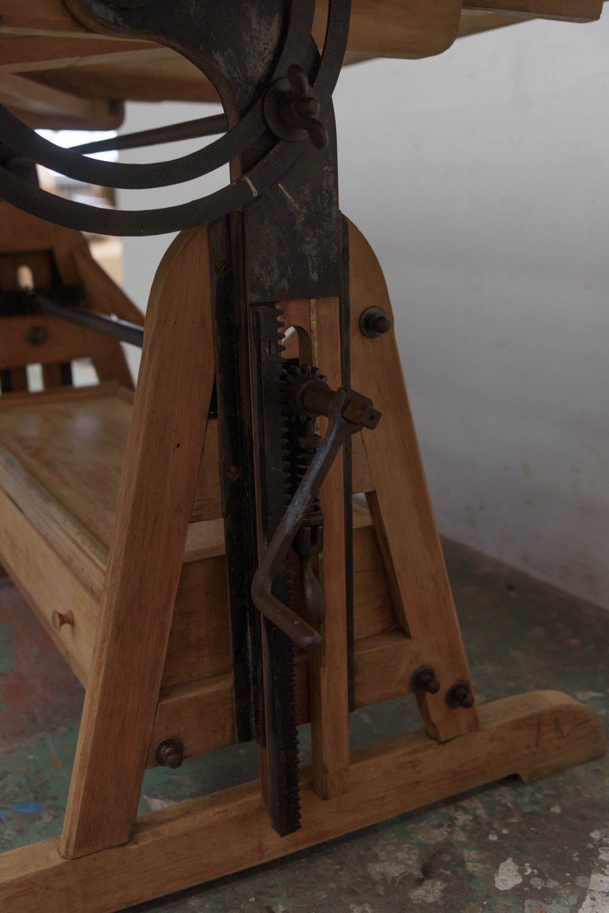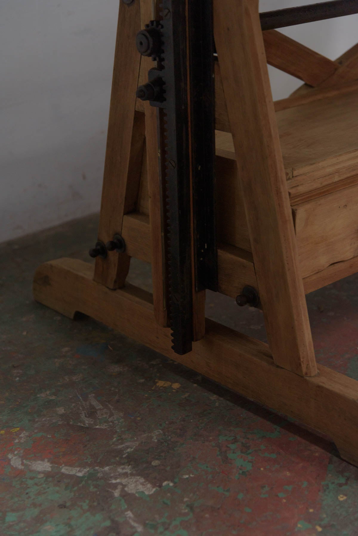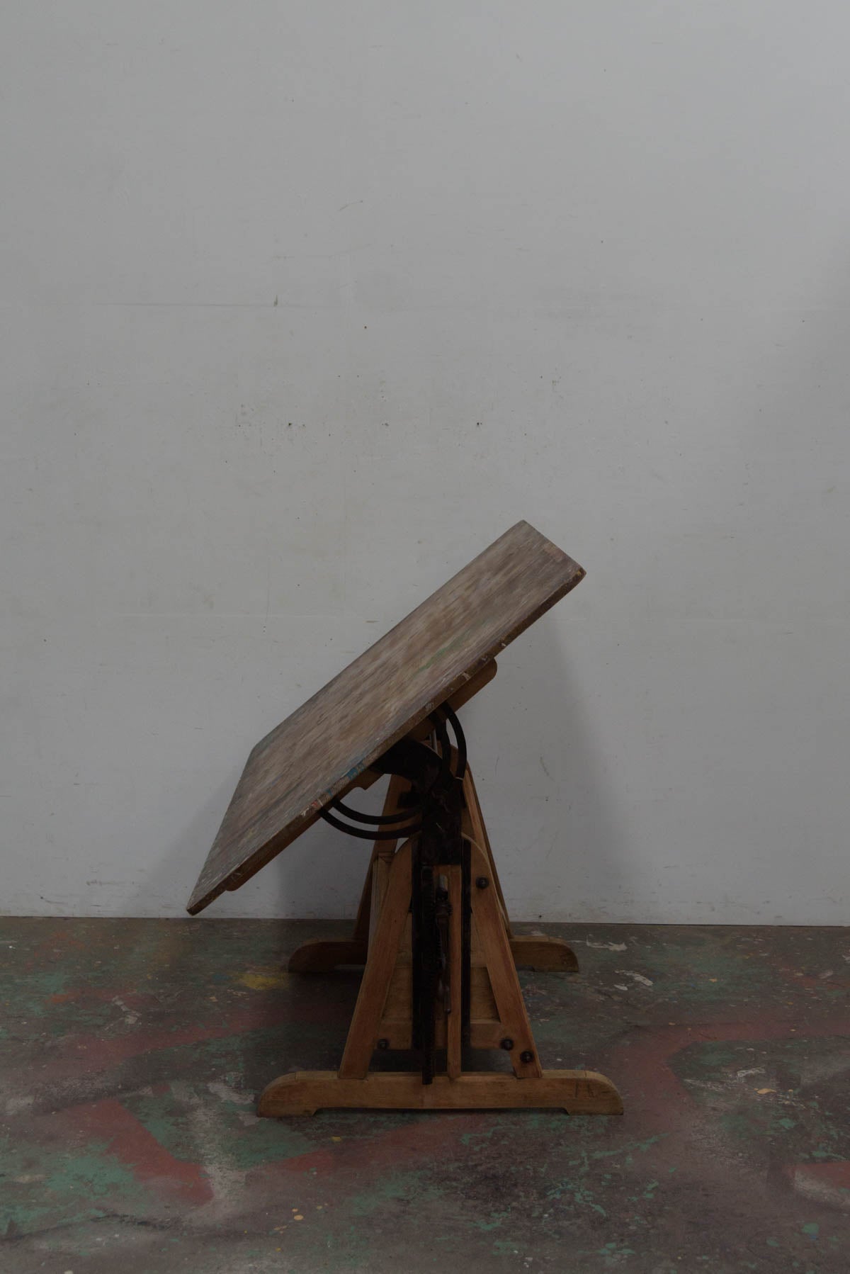 ベルギーの古い図面台です。角度や高さが調整できます。古い工業用の家具ですが天板のカラフルな絵の具とのバランスが絶妙で、天板をフラットにしてディスプレイ台やダイニングテーブルとしてもお使いいただけます。