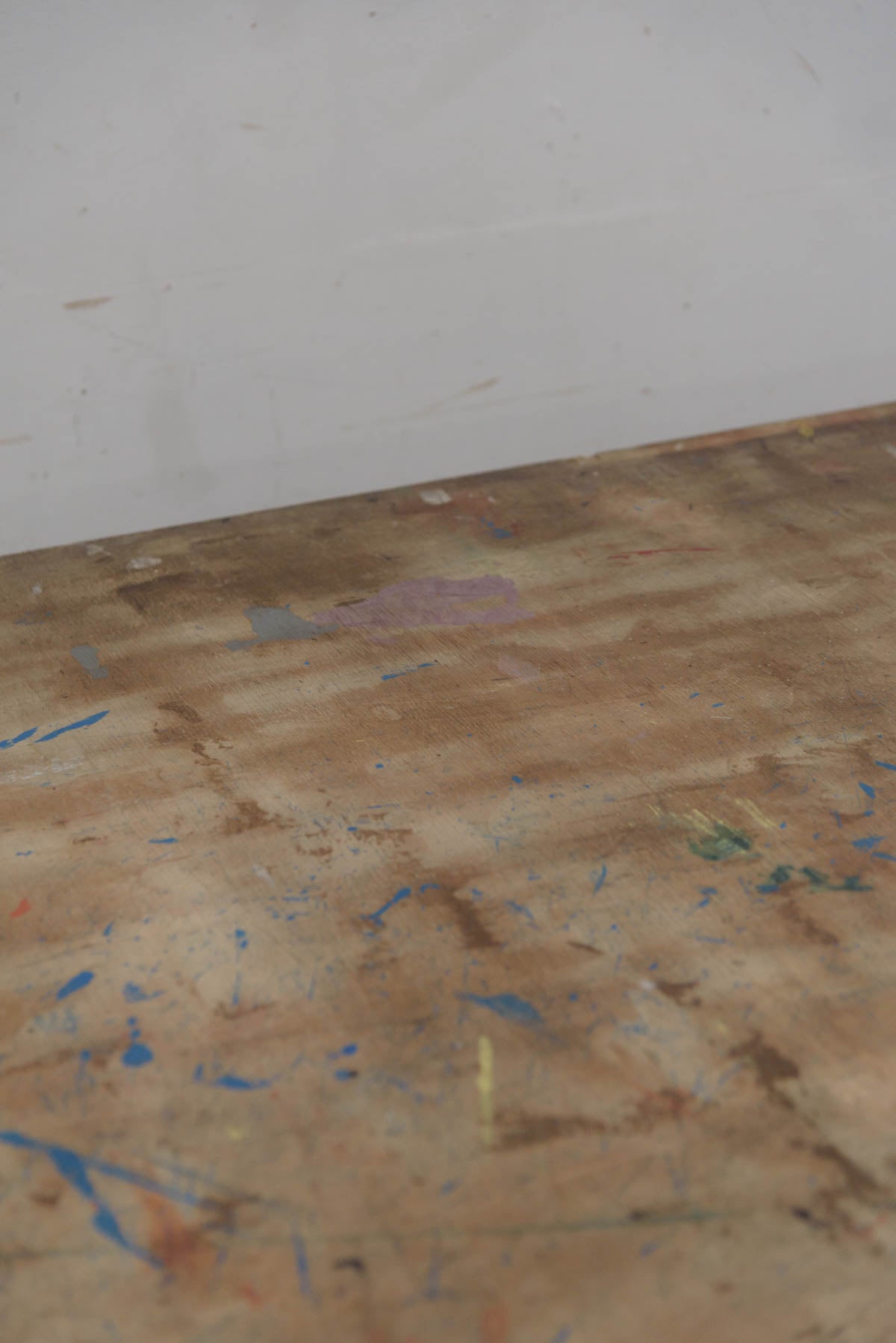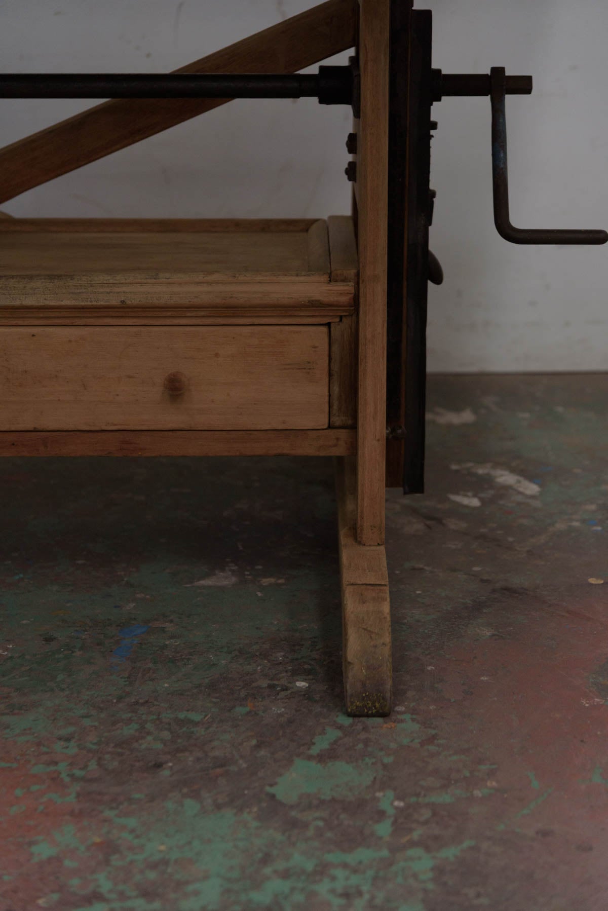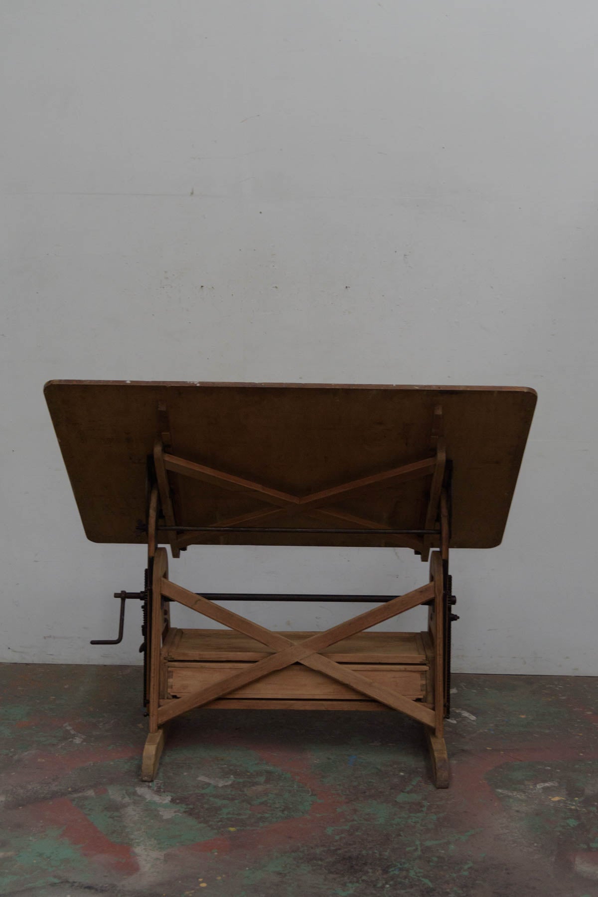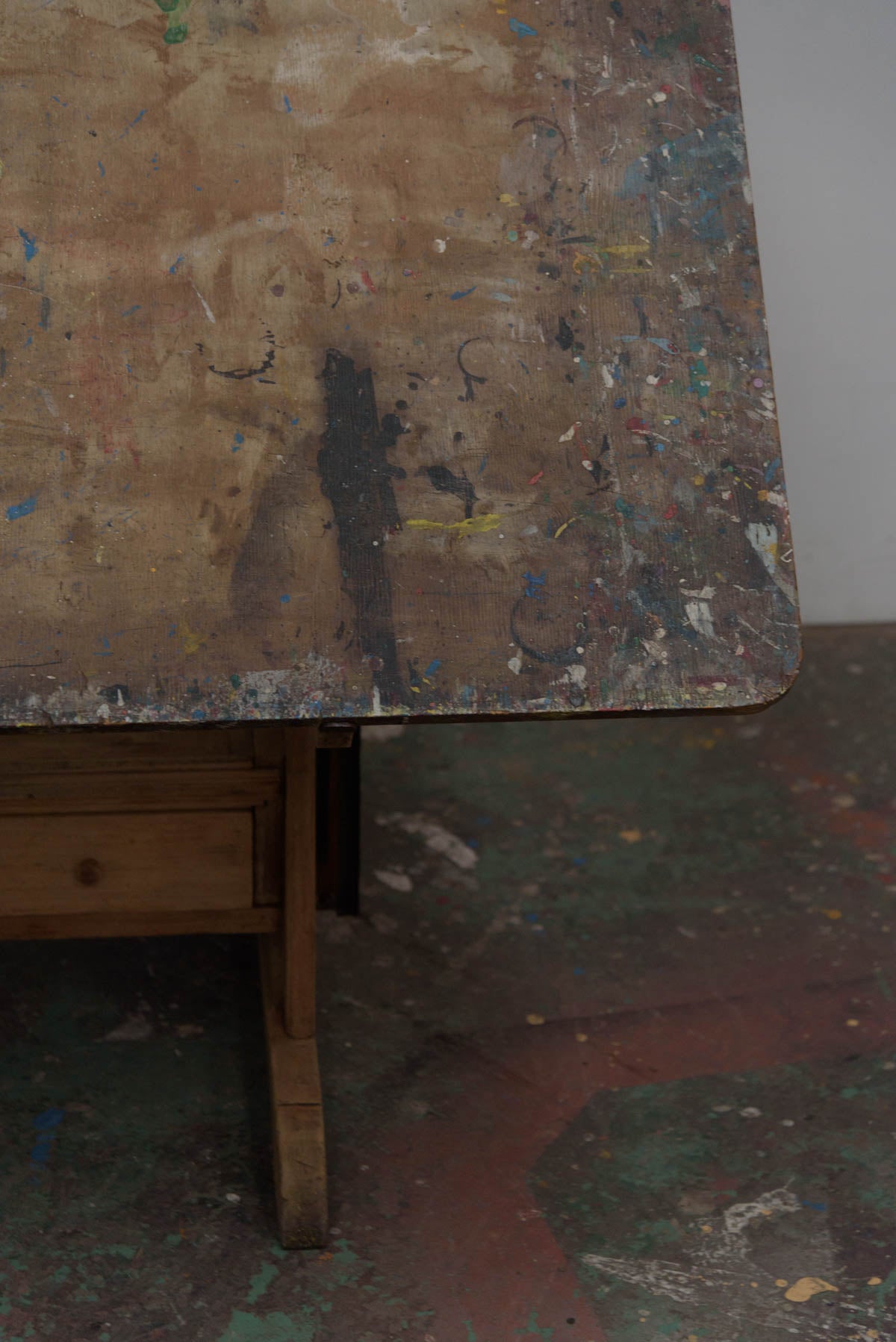 ベルギーの古い図面台です。角度や高さが調整できます。古い工業用の家具ですが天板のカラフルな絵の具とのバランスが絶妙で、天板をフラットにしてディスプレイ台やダイニングテーブルとしてもお使いいただけます。