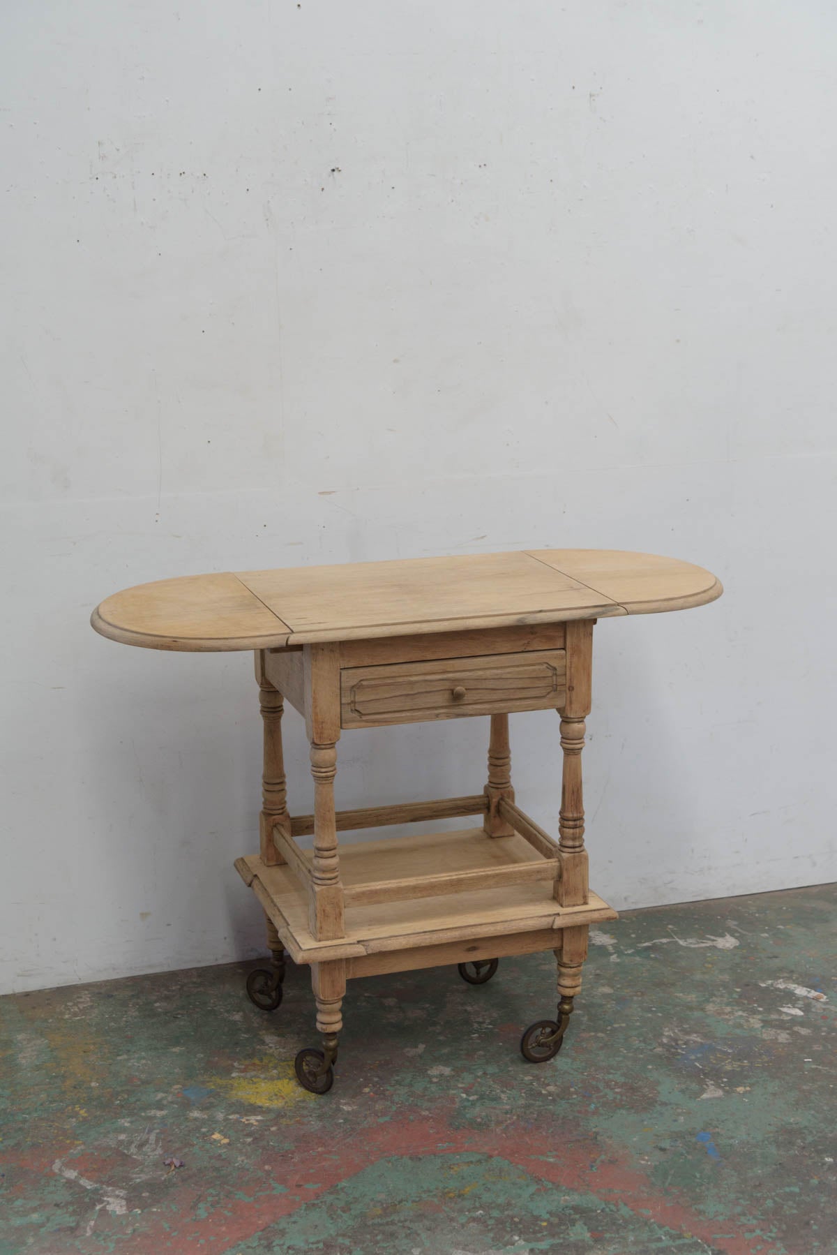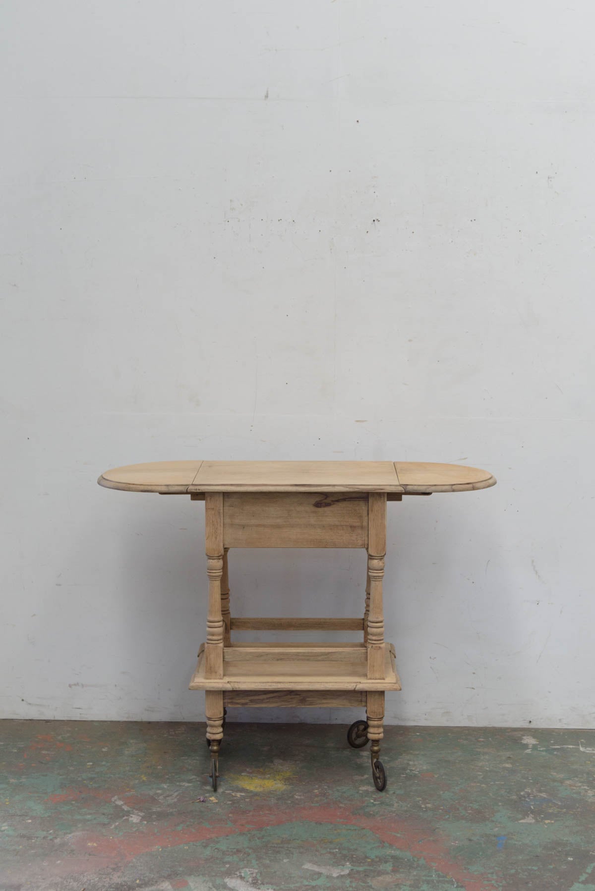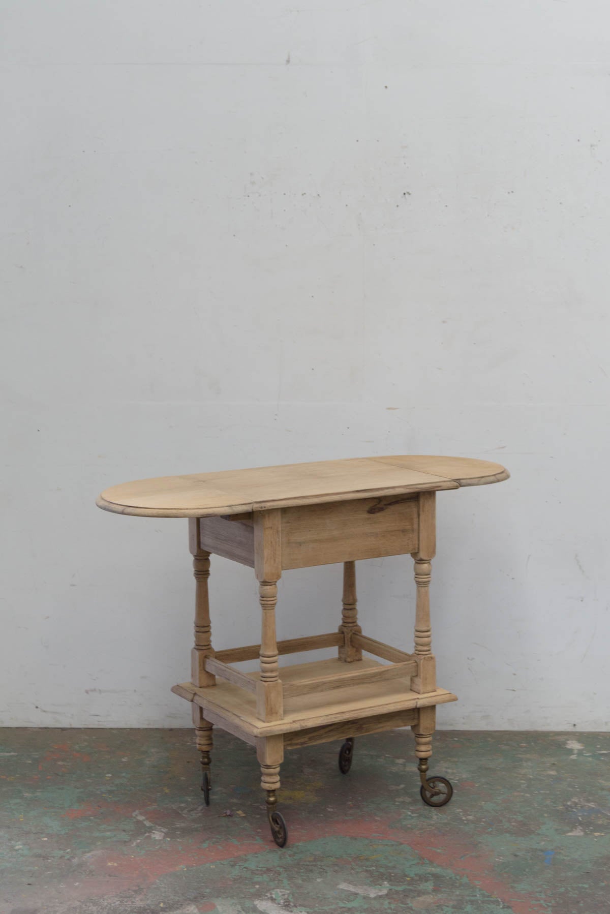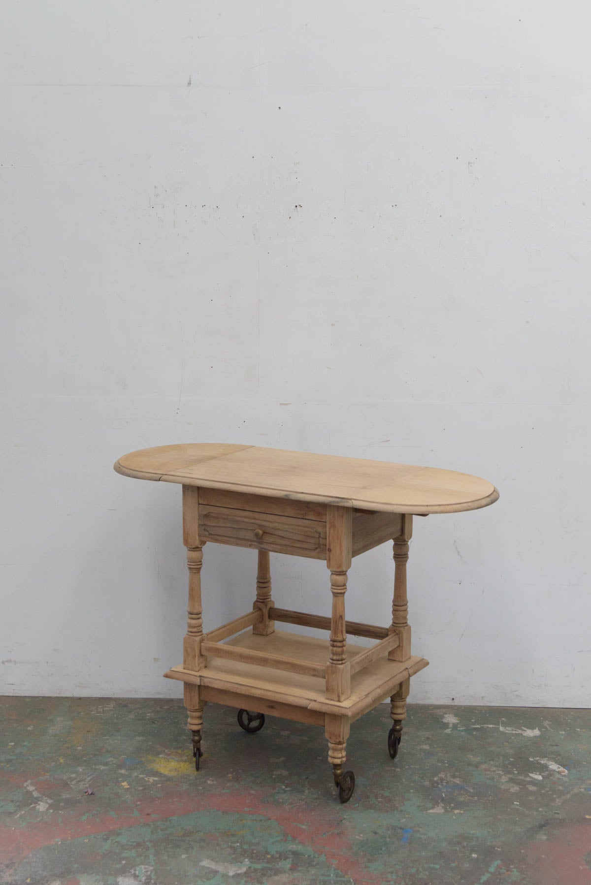 ベルギーのキッチンワゴンです。めずらしいオーバルのバタフライ天板に引き出し付きです。キャスターの動きも良く、しっかり実用できます。1950ー60年ごろの家具です。