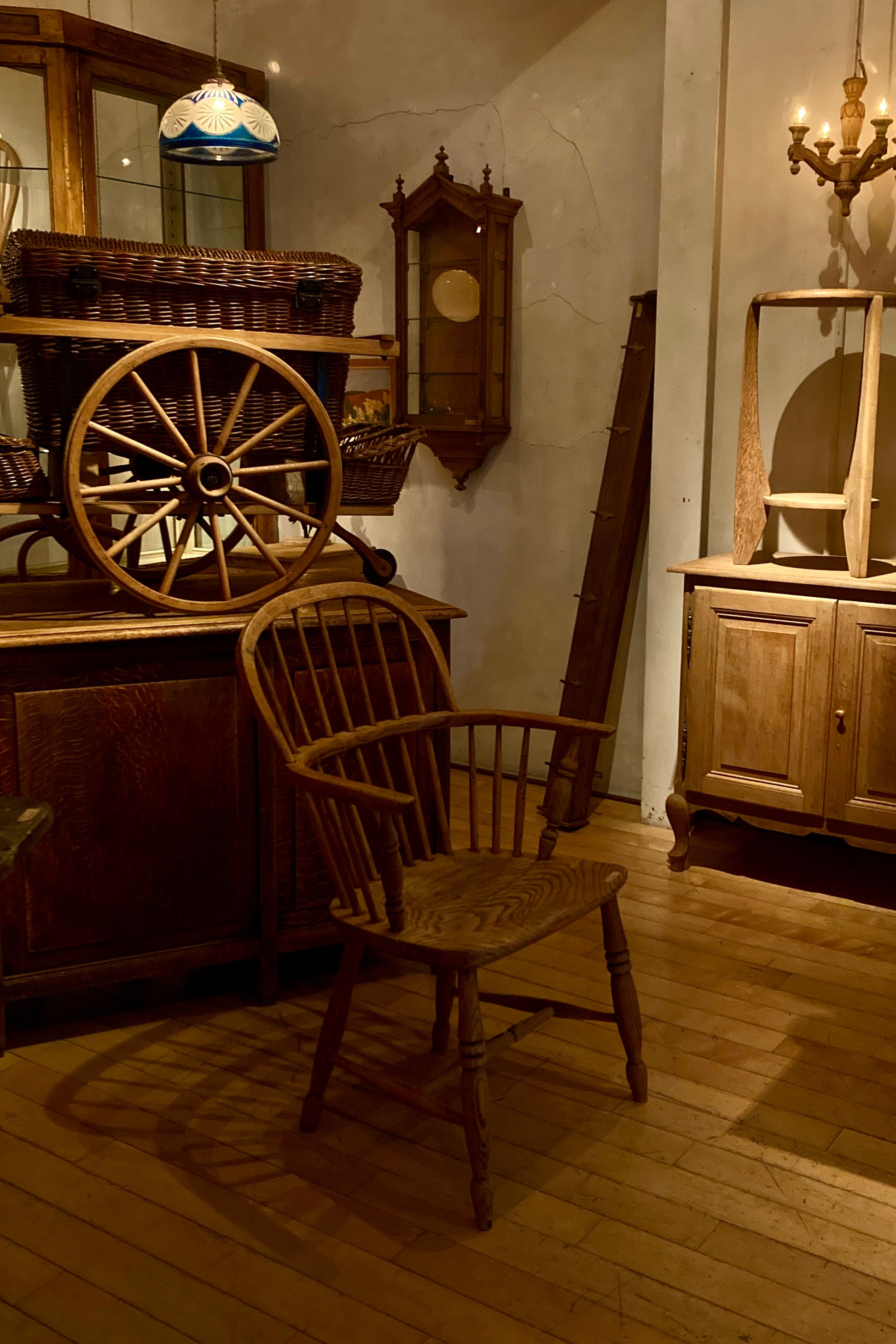 1800年代後半のものだと思われます。手仕事ならではのいびつなパーツや、摩耗して光沢の出た座面等、味のあるディテイル満載の椅子です。材質はエルム材。ウィンザーチェアの中でも小ぶりで良いサイズ感です。