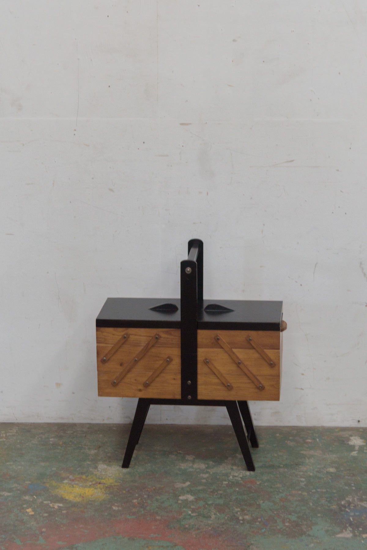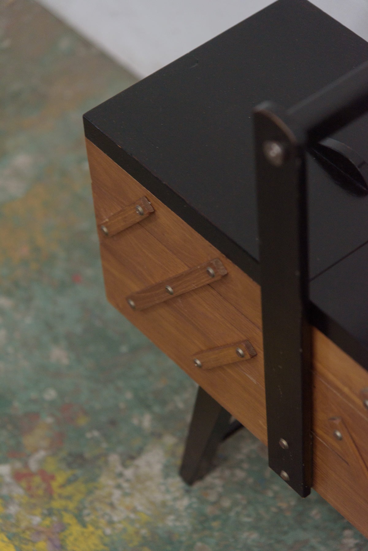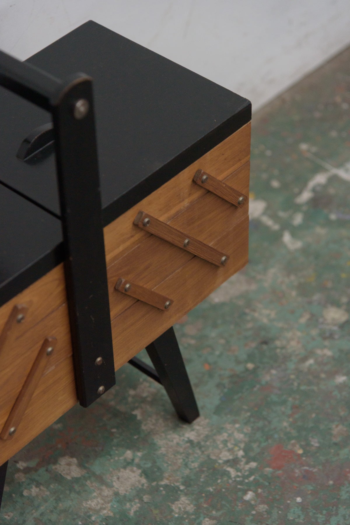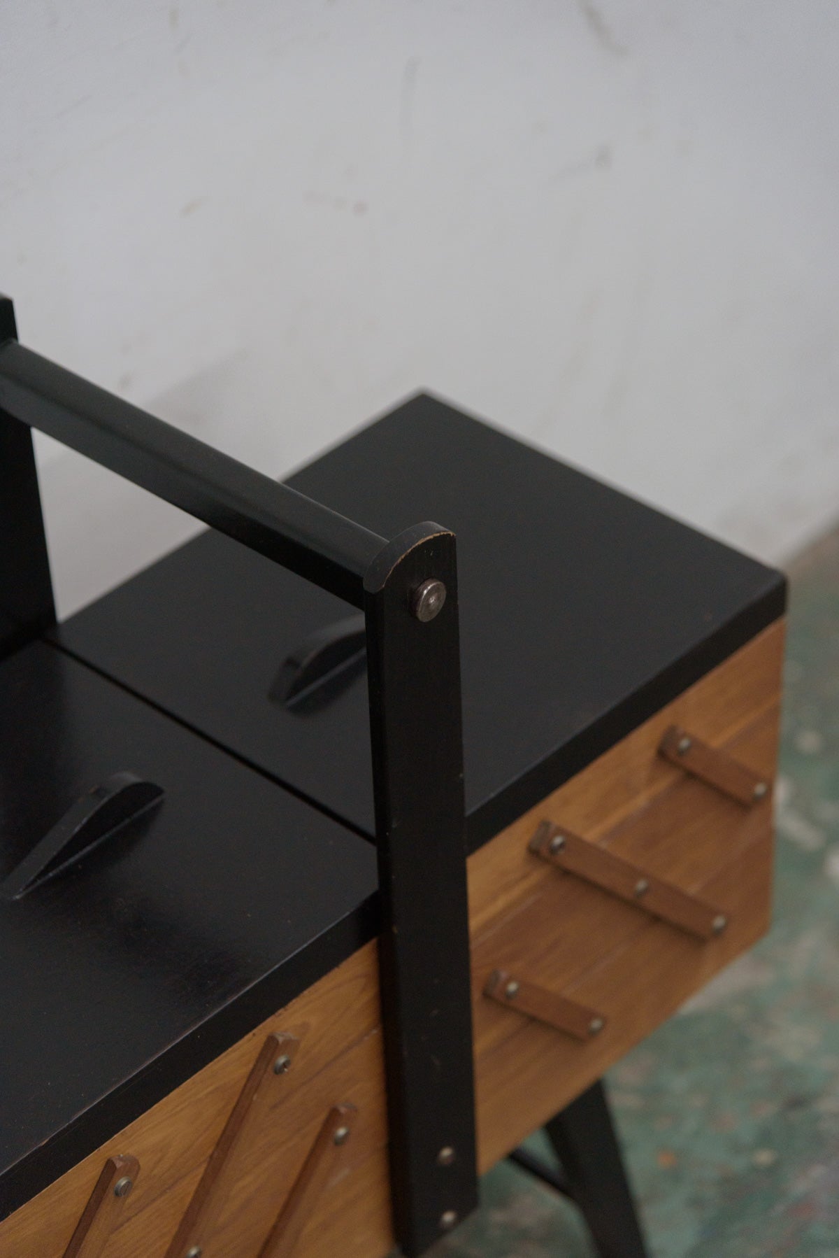 脚、取っ手付きで家具としても存在感があり、細かいものがしっかり収納できて実用性も兼ね備えています。1960ー70年ごろの家具で、黒の塗装がいい雰囲気です。