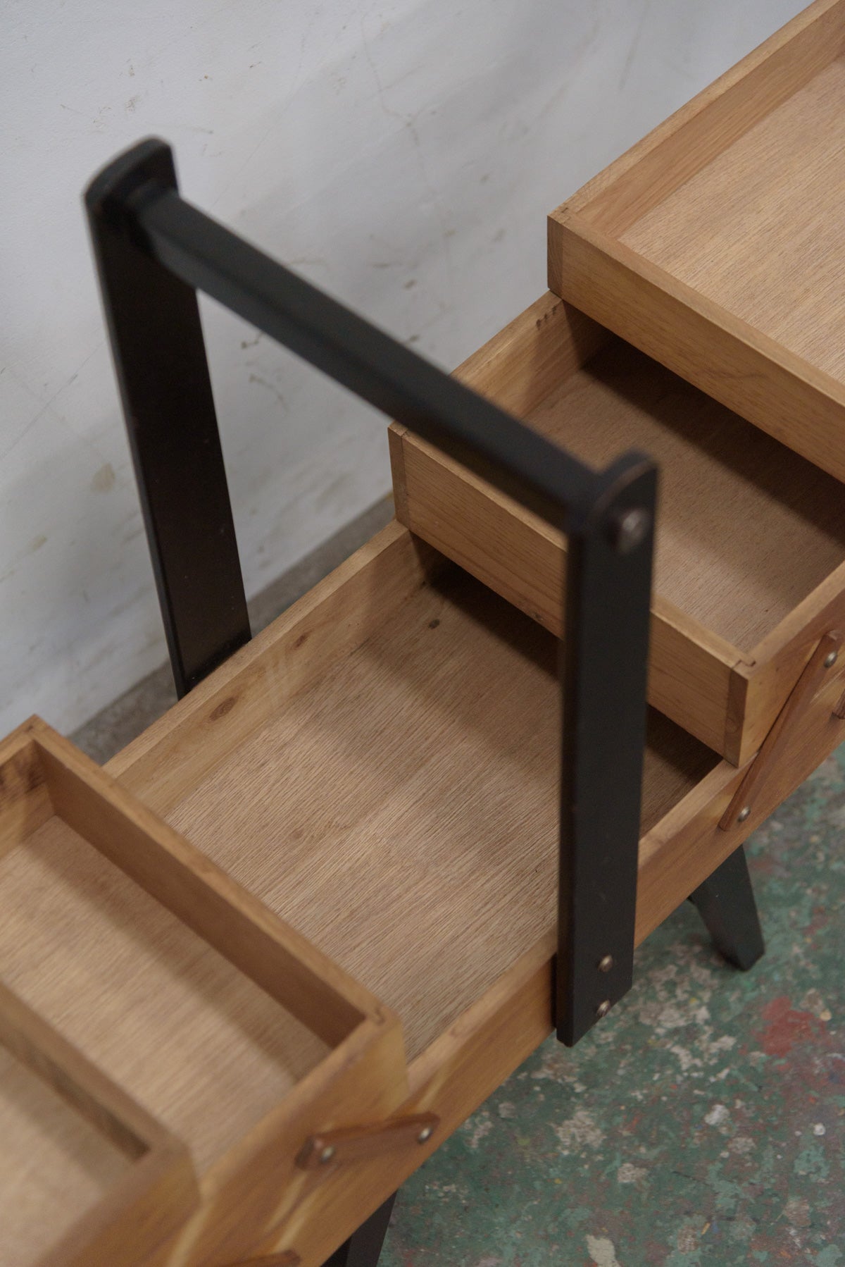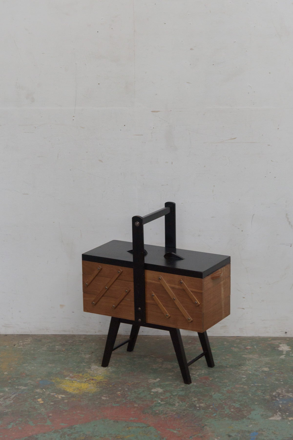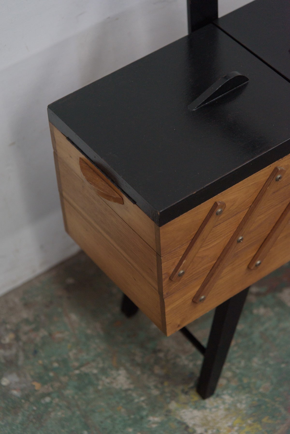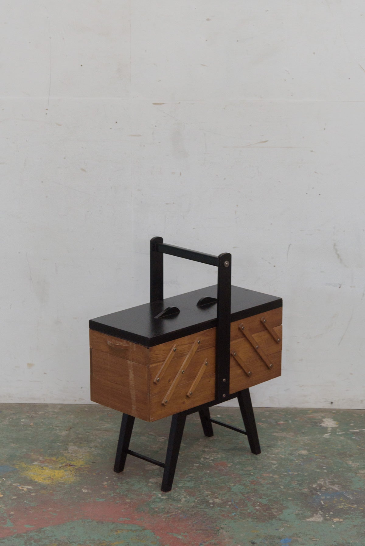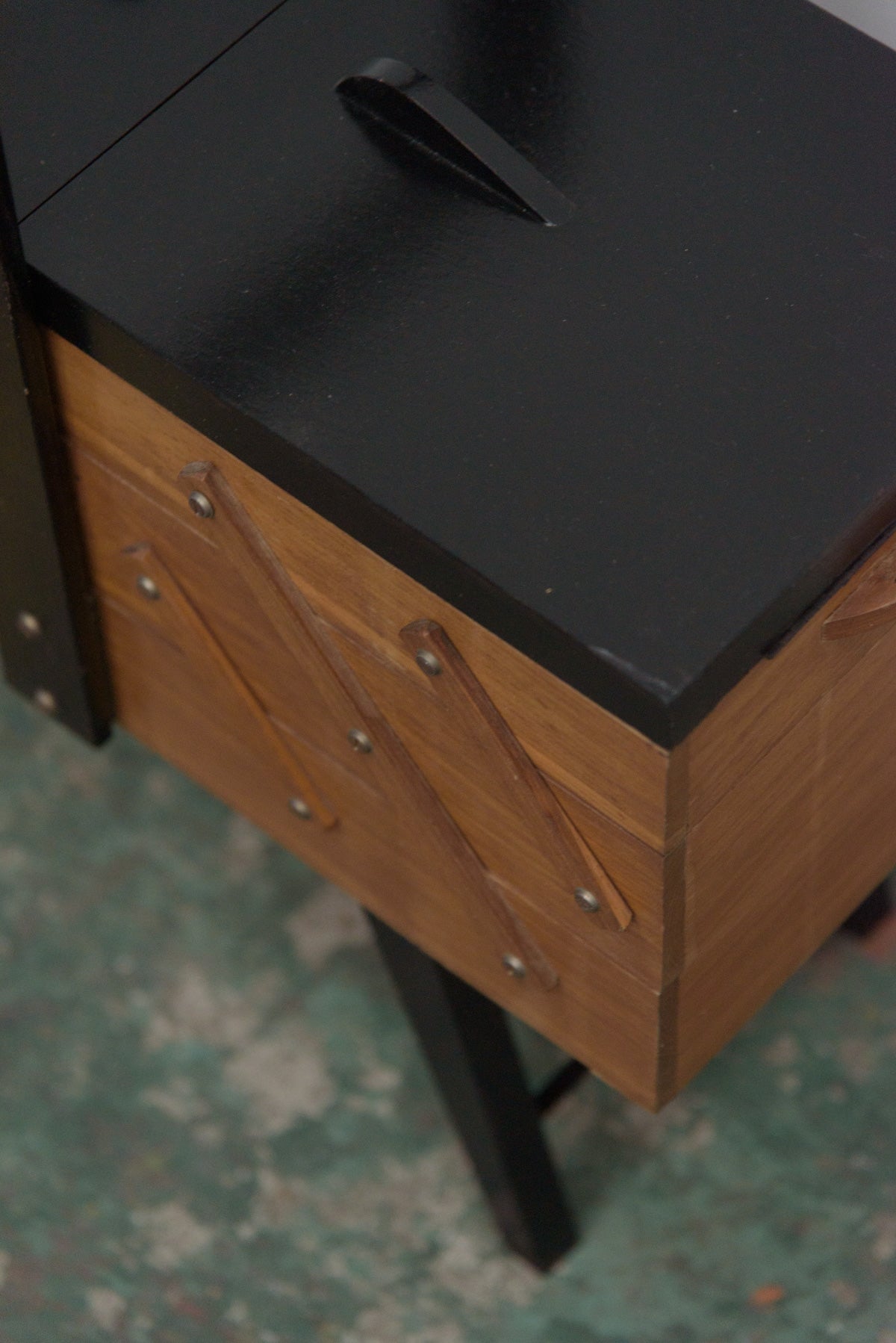 脚、取っ手付きで家具としても存在感があり、細かいものがしっかり収納できて実用性も兼ね備えています。1960ー70年ごろの家具で、黒の塗装がいい雰囲気です。