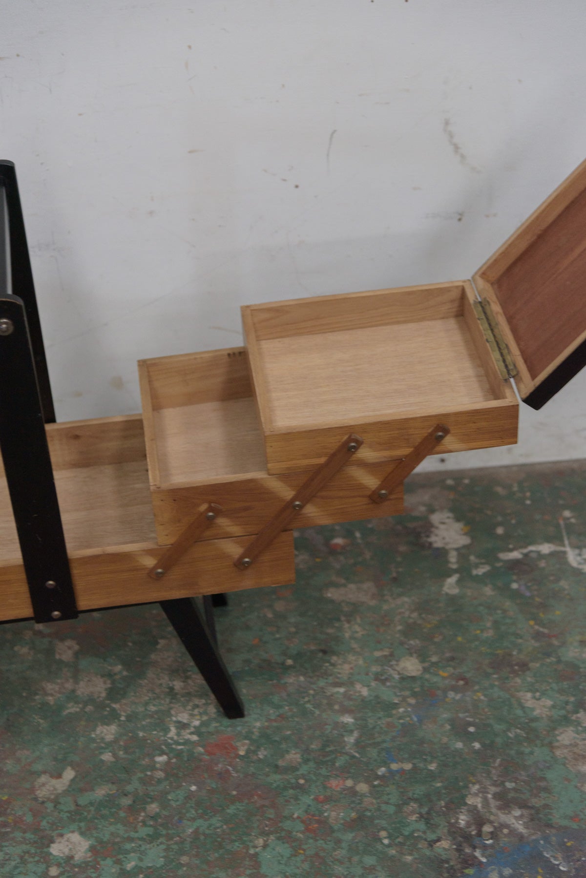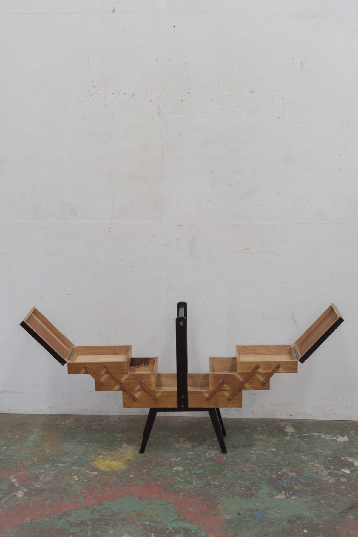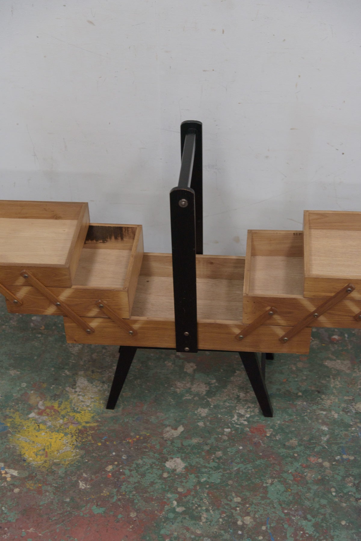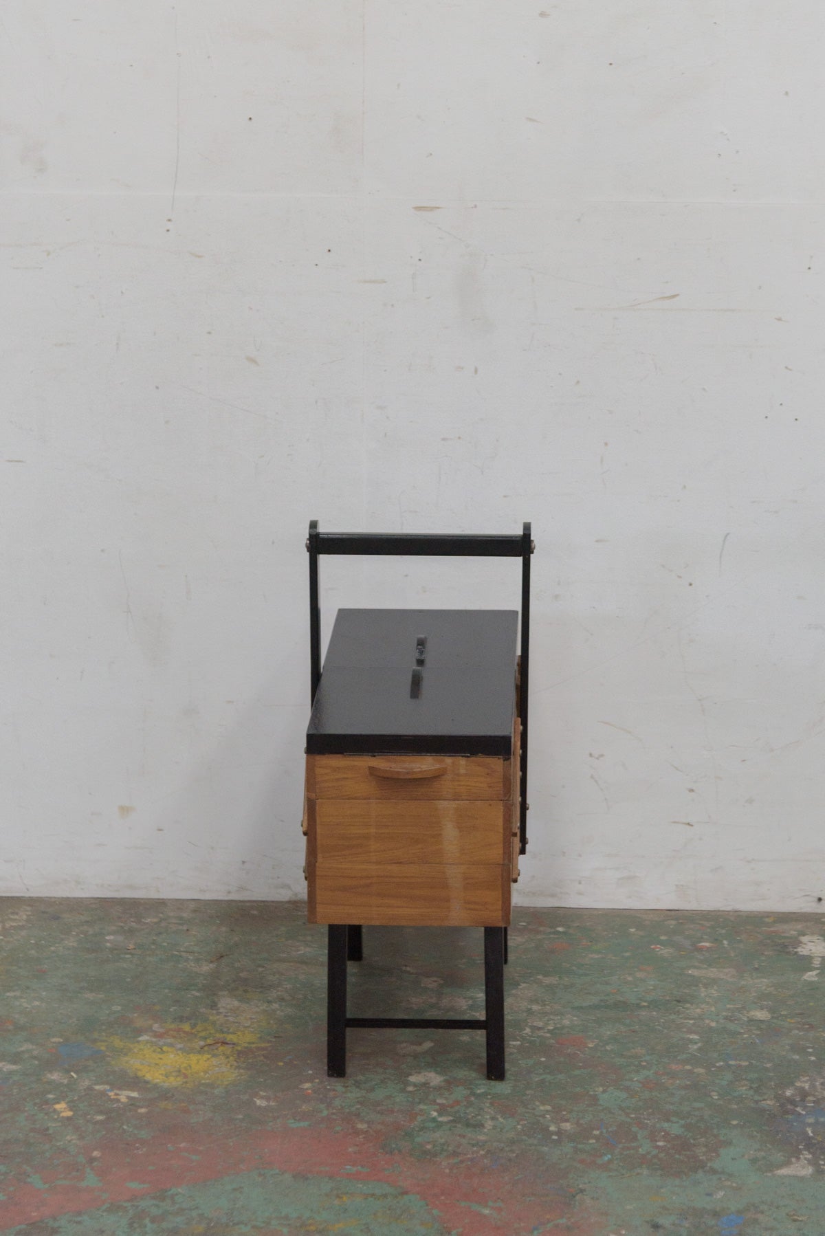 脚、取っ手付きで家具としても存在感があり、細かいものがしっかり収納できて実用性も兼ね備えています。1960ー70年ごろの家具で、黒の塗装がいい雰囲気です。