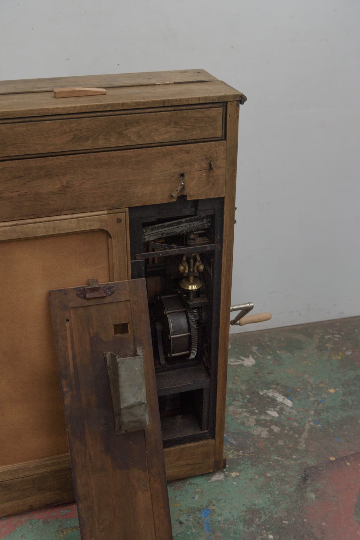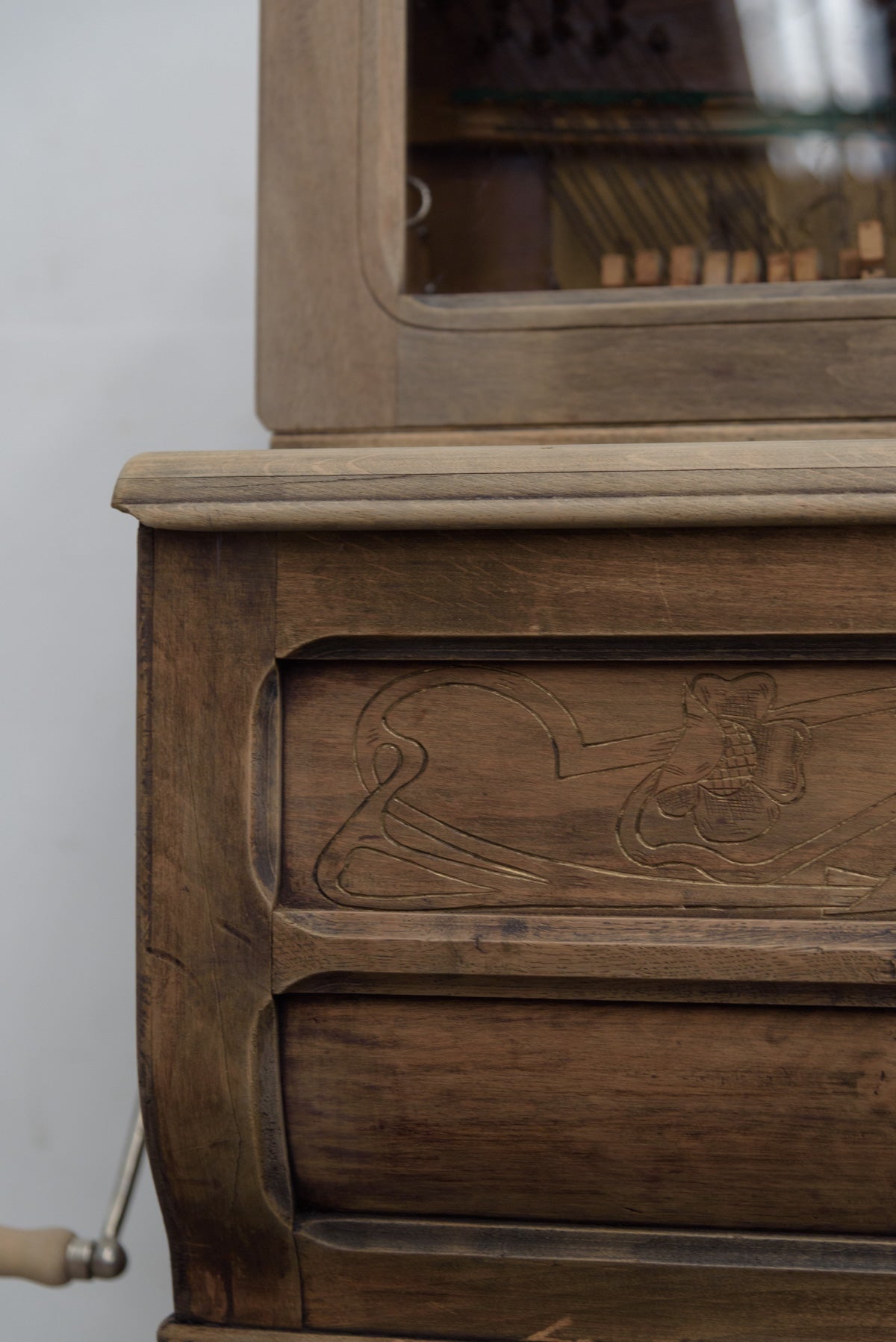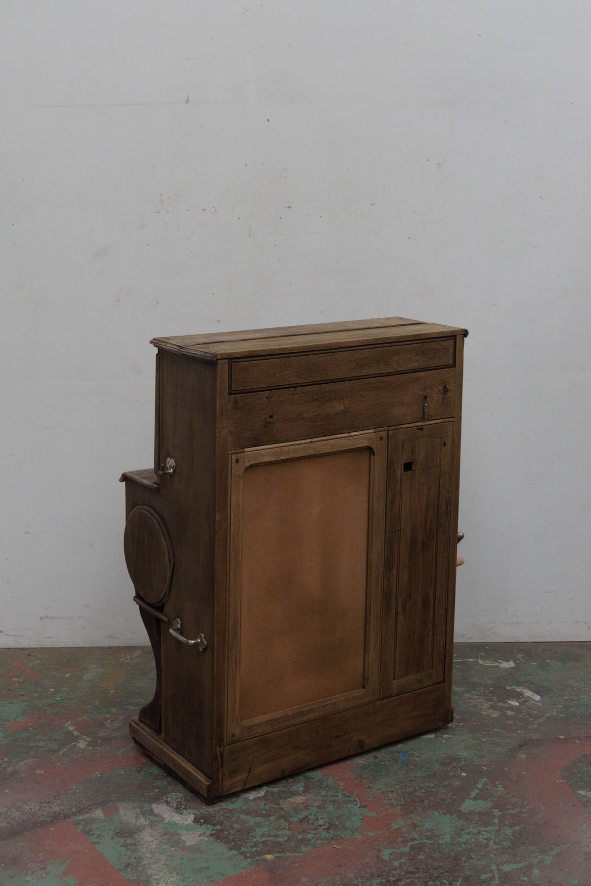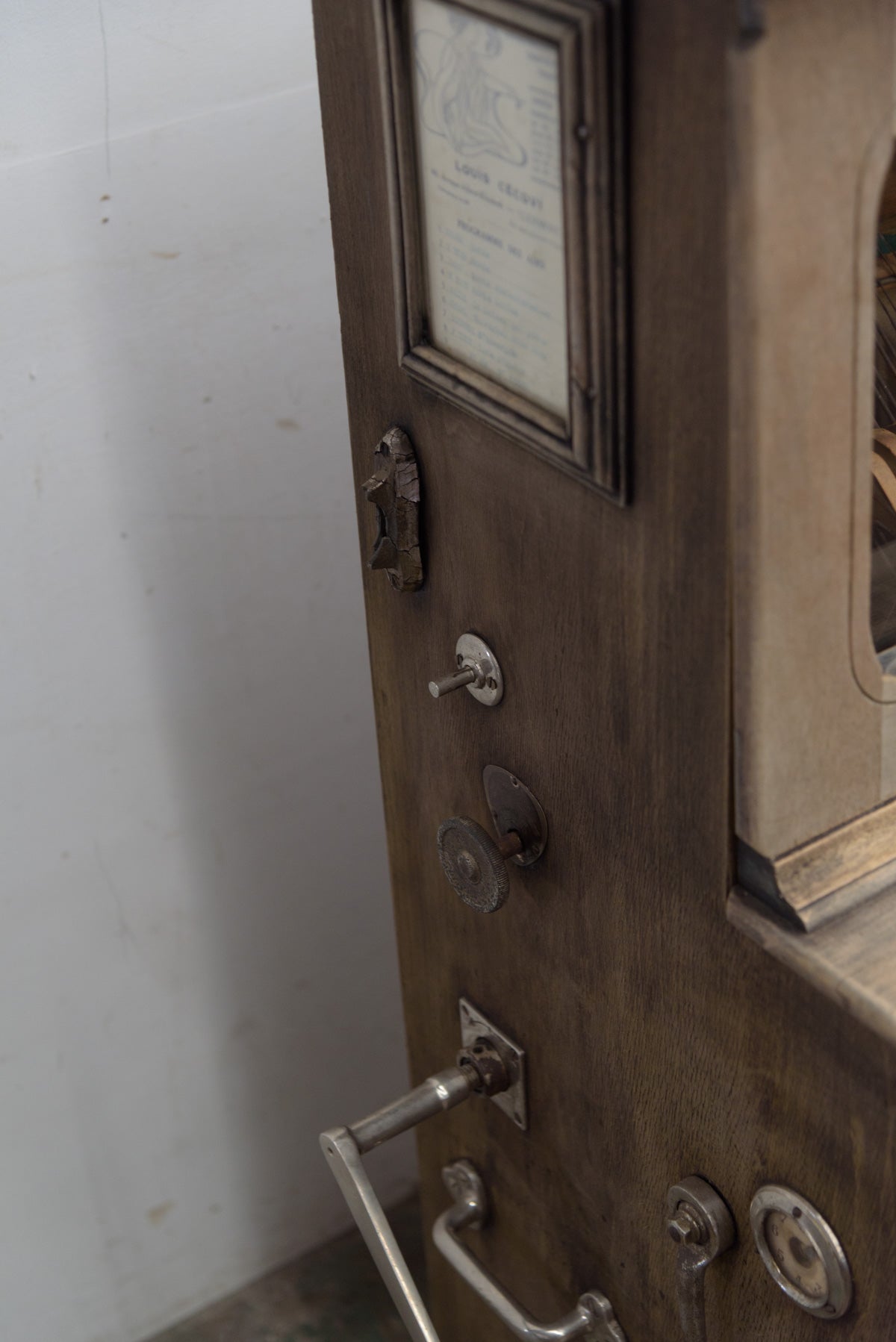 ゼンマイ式の自動演奏楽器として1800年代後半から1900年代の前半に、カフェ等で使用されていました。コインを入れると自動的に演奏が始まるジュークボックスの始まりのような音楽機械です。コインのサイズや重さが違うので現在は機能しませんが、ゼンマイを巻いてから裏板にある四角い穴から角材を差し込むとストッパーが外れて動き出します。バレルピアノの中では比較的サイズは小さい方ですが、中の仕掛けも見えるようになっていますのでオブジェとしても存在感があります。