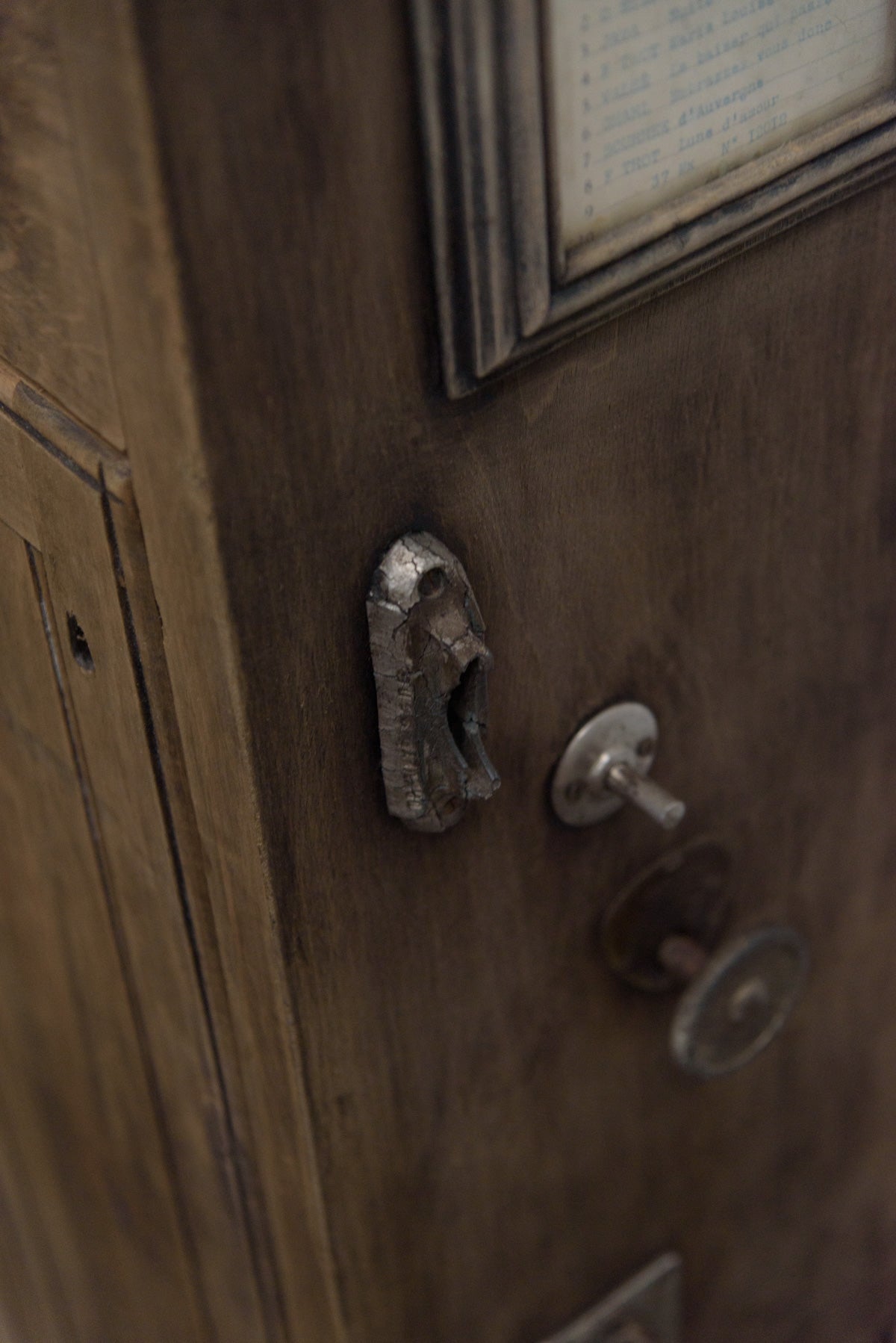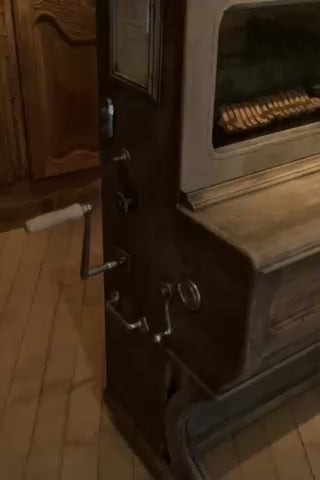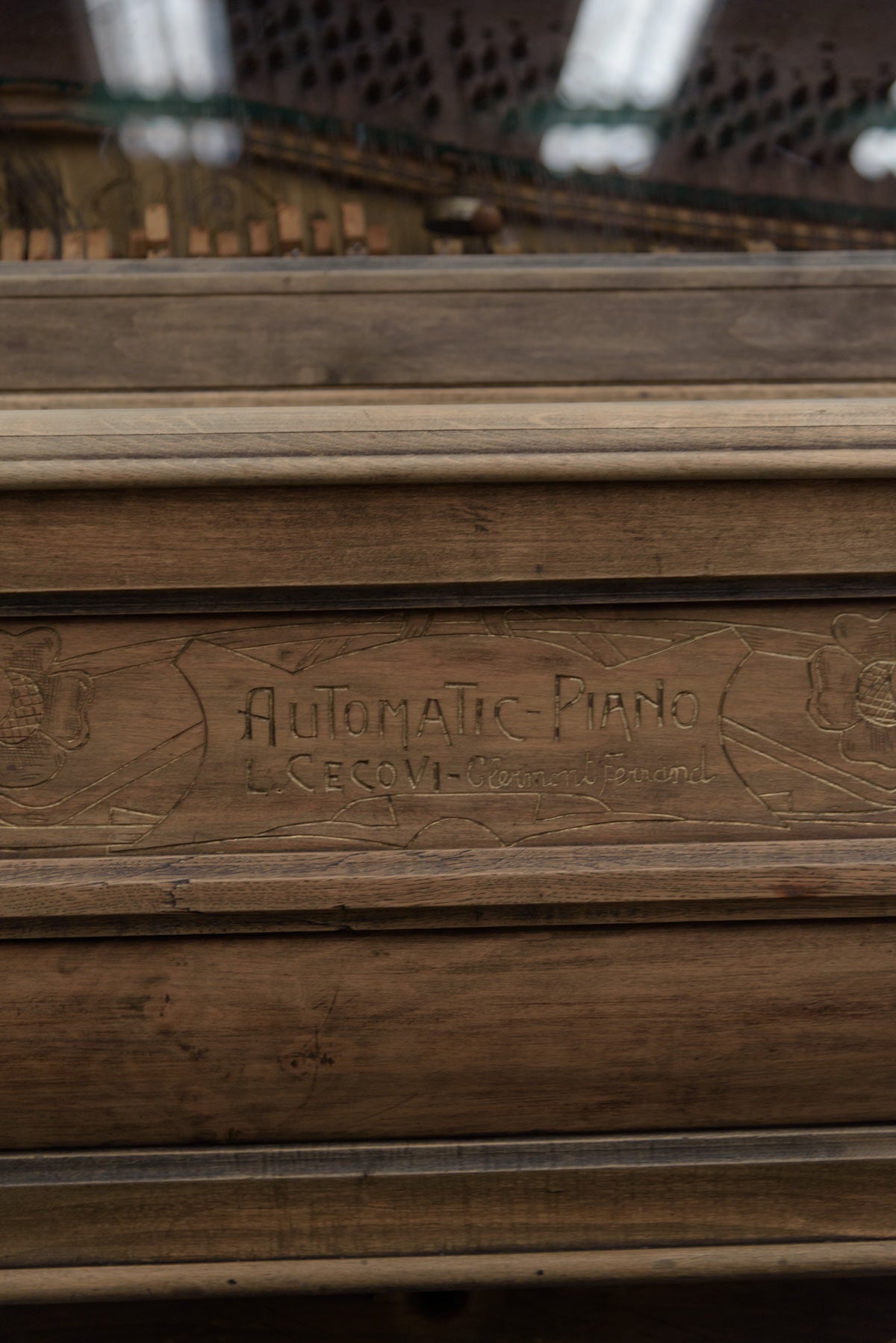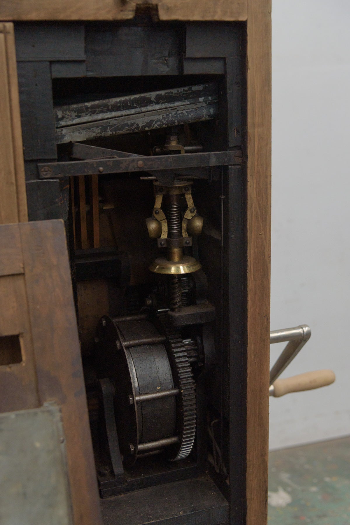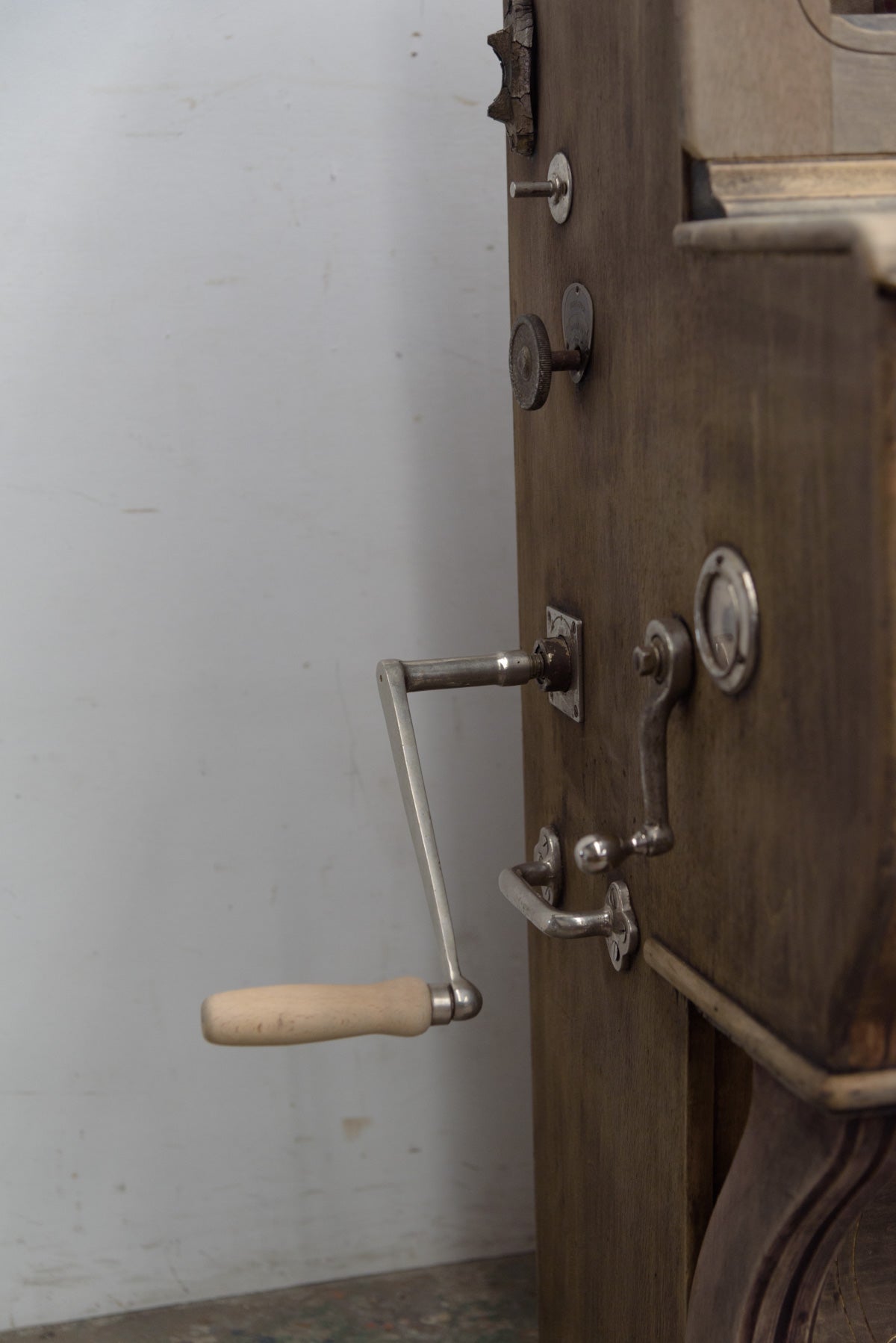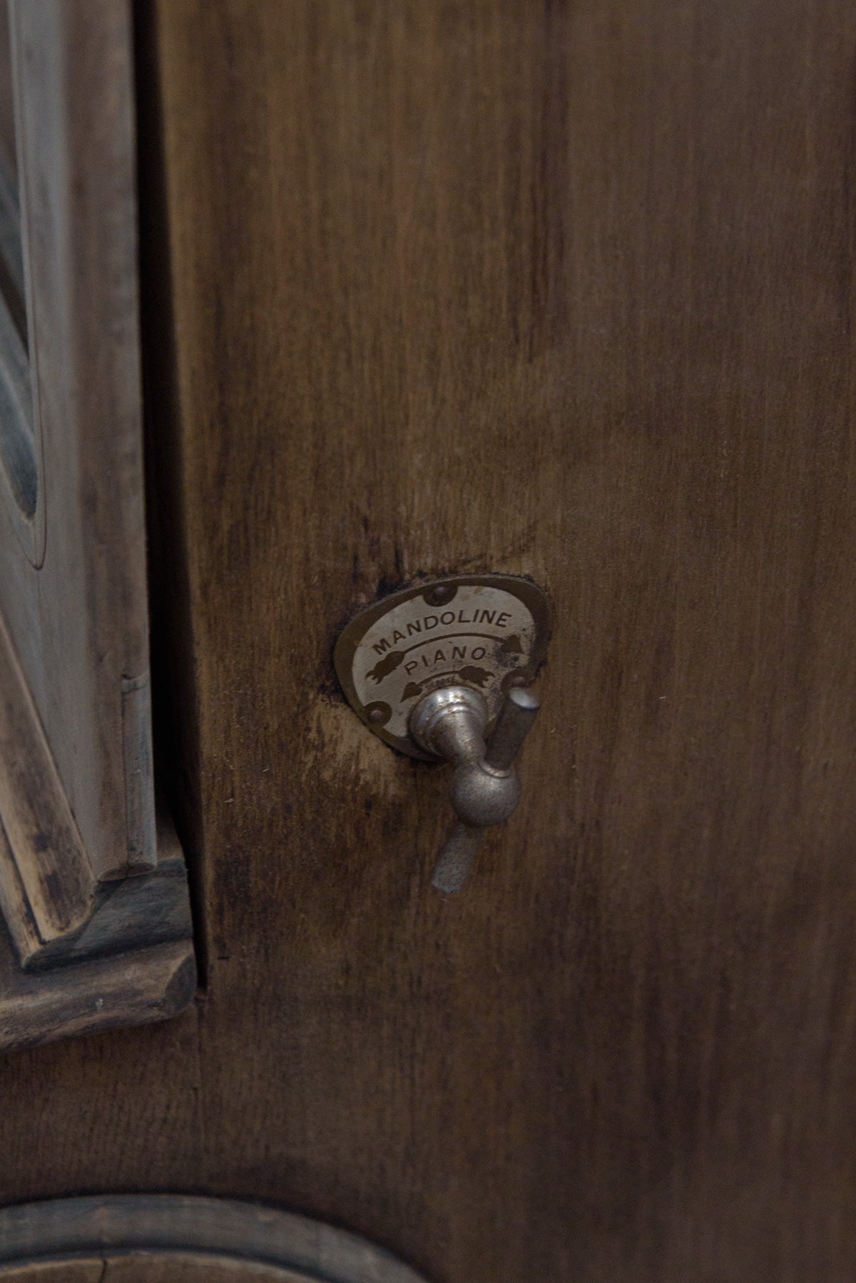ゼンマイ式の自動演奏楽器として1800年代後半から1900年代の前半に、カフェ等で使用されていました。コインを入れると自動的に演奏が始まるジュークボックスの始まりのような音楽機械です。コインのサイズや重さが違うので現在は機能しませんが、ゼンマイを巻いてから裏板にある四角い穴から角材を差し込むとストッパーが外れて動き出します。バレルピアノの中では比較的サイズは小さい方ですが、中の仕掛けも見えるようになっていますのでオブジェとしても存在感があります。