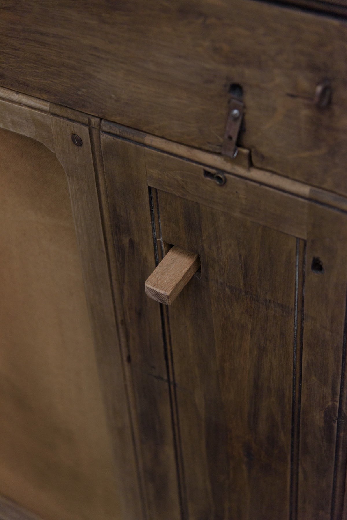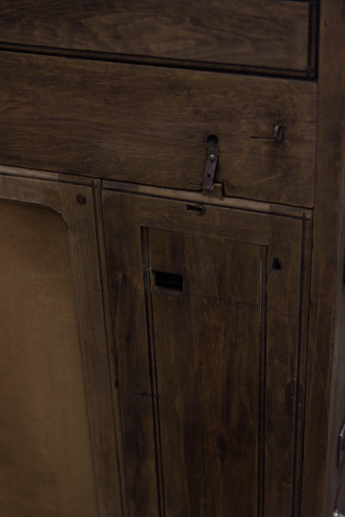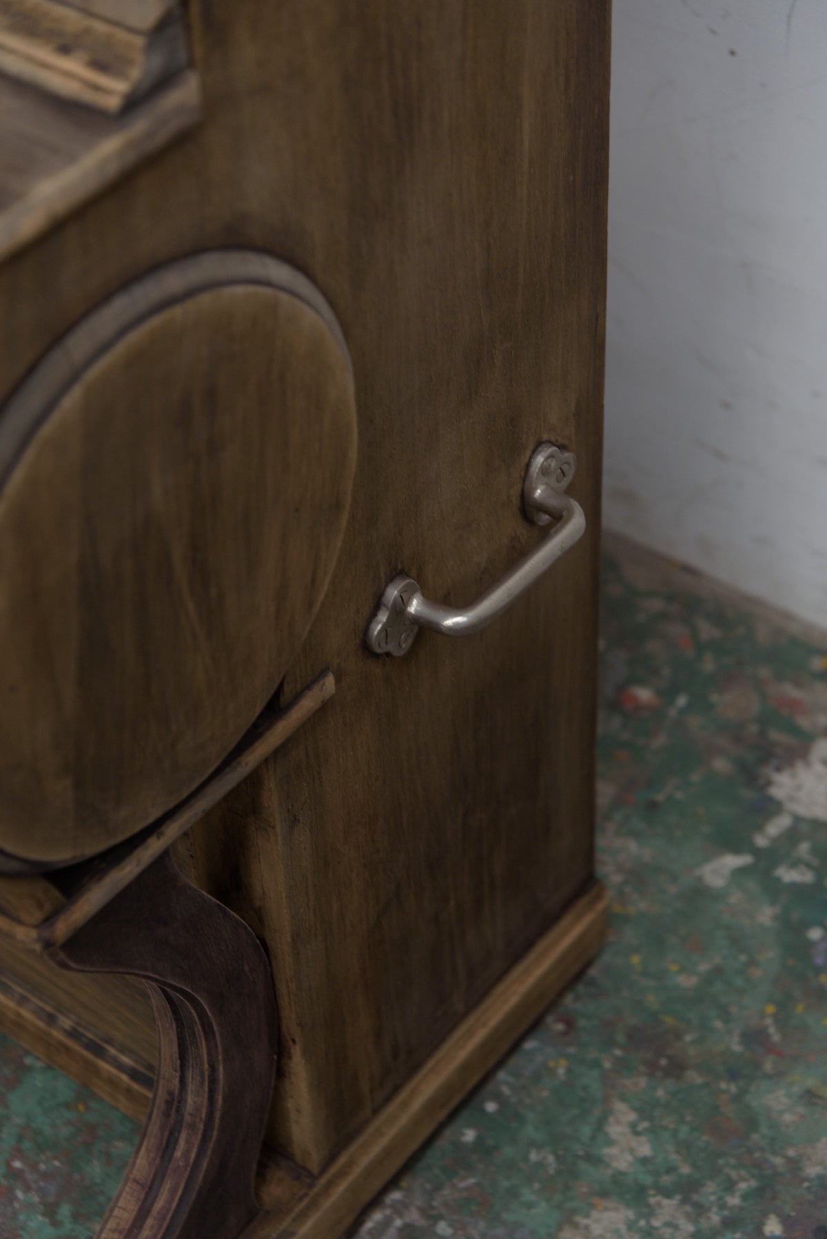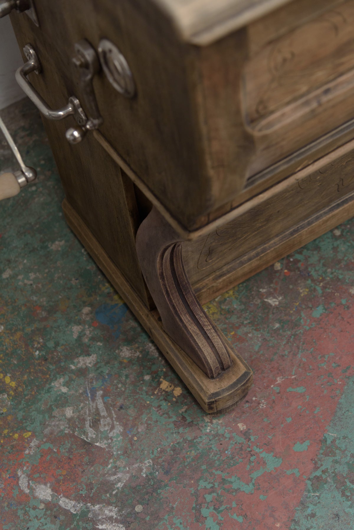 ゼンマイ式の自動演奏楽器として1800年代後半から1900年代の前半に、カフェ等で使用されていました。コインを入れると自動的に演奏が始まるジュークボックスの始まりのような音楽機械です。コインのサイズや重さが違うので現在は機能しませんが、ゼンマイを巻いてから裏板にある四角い穴から角材を差し込むとストッパーが外れて動き出します。バレルピアノの中では比較的サイズは小さい方ですが、中の仕掛けも見えるようになっていますのでオブジェとしても存在感があります。