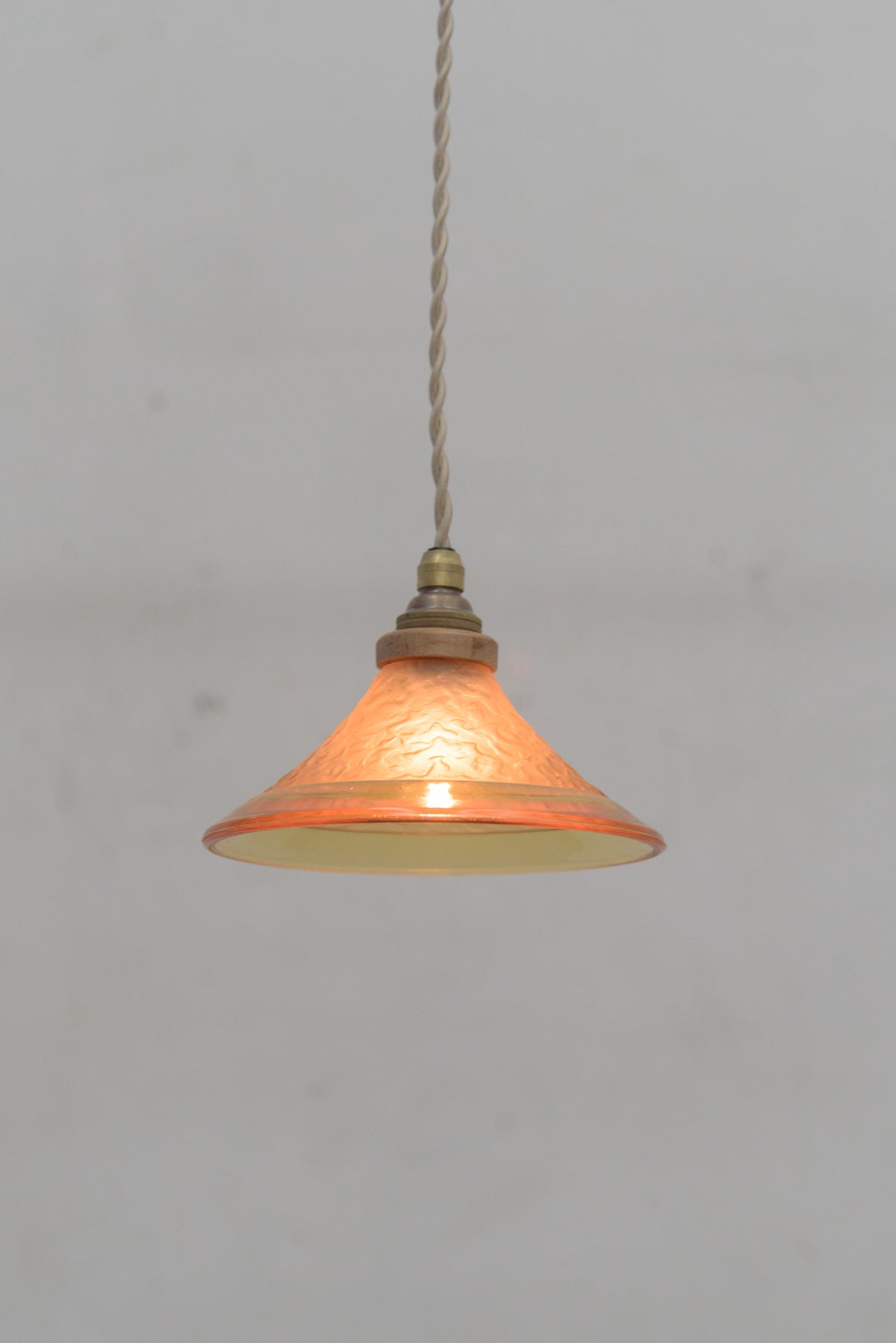 1920ー30年ごろの美しいシルエットのすりガラスは、明かりを点けるとオレンジ色に光ります。型押しされたガラスの凹凸模様が柔らかく光を散らすアンティークならではのランプです。電気部品は日本の新しいものに交換しています。口金はE17で引っ掛けシーリング仕様。コードの長さは約1mです。コードのカットは無料、延長は550円/50㎝で承りますので、ご希望の長さがありましたらお知らせください。