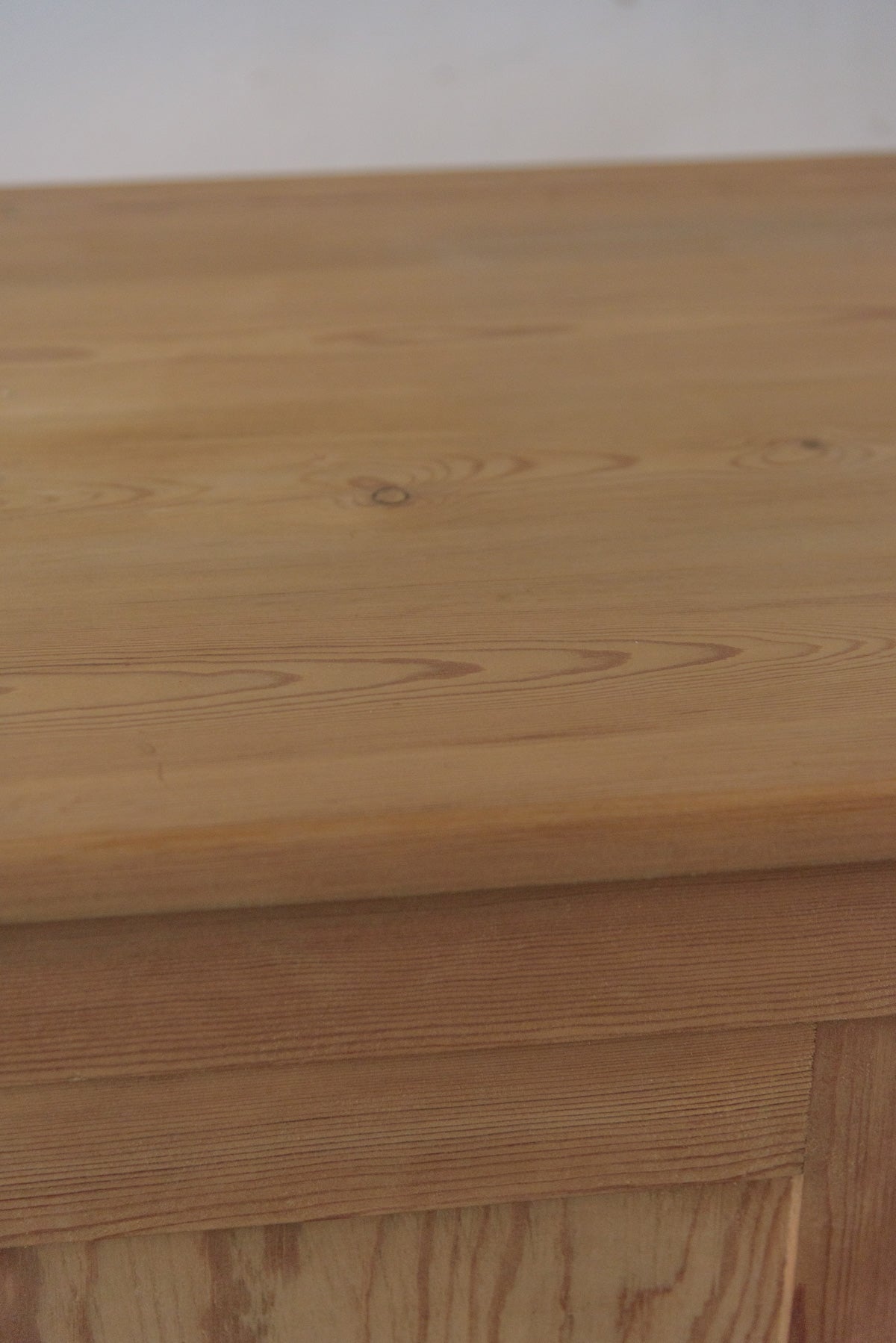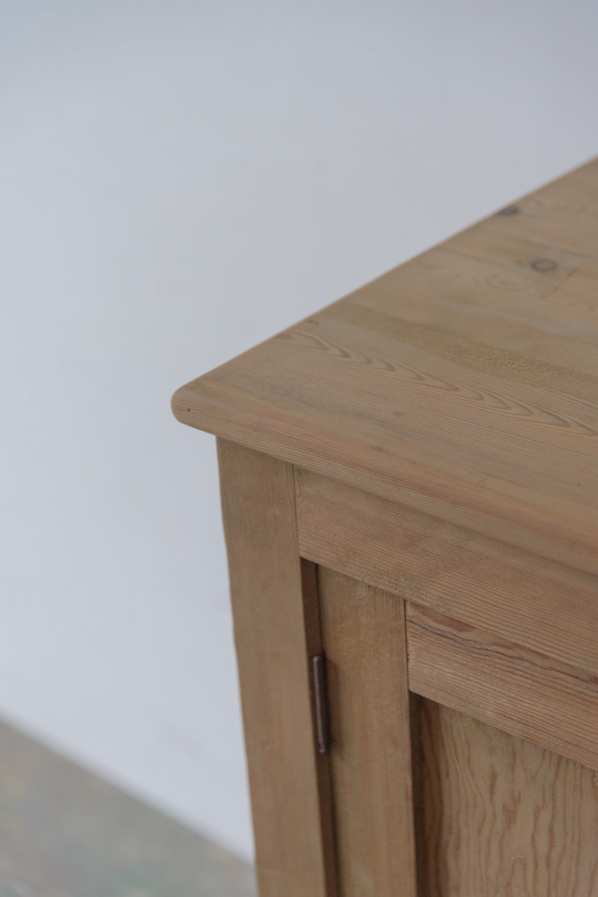 ベルギーの家具で、素材はパイン材。扉の動きも問題なく、中もきれいで棚板も取り外せるので、食器棚等としてもしっかり実用できる家具です。棚板の追加も有料にて承っておりますのでご相談ください。