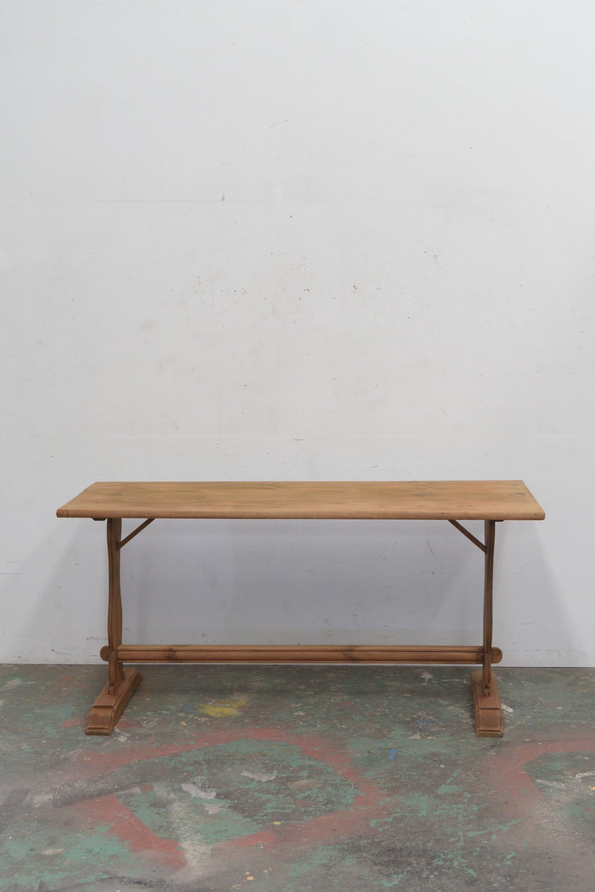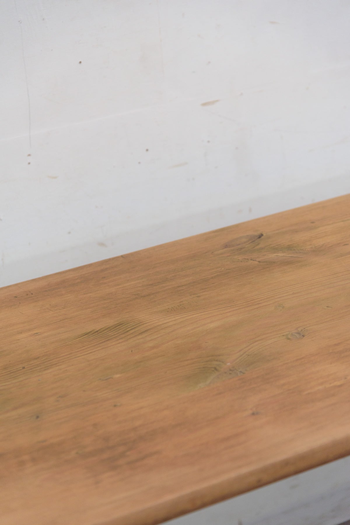 1900年代初頭の民芸的要素のあるフランスのカントリーテーブル。T字構造の脚で椅子も入れやすく、奥行きも小さめなので飲食店で使われていたものかもしれません。材質はパイン。