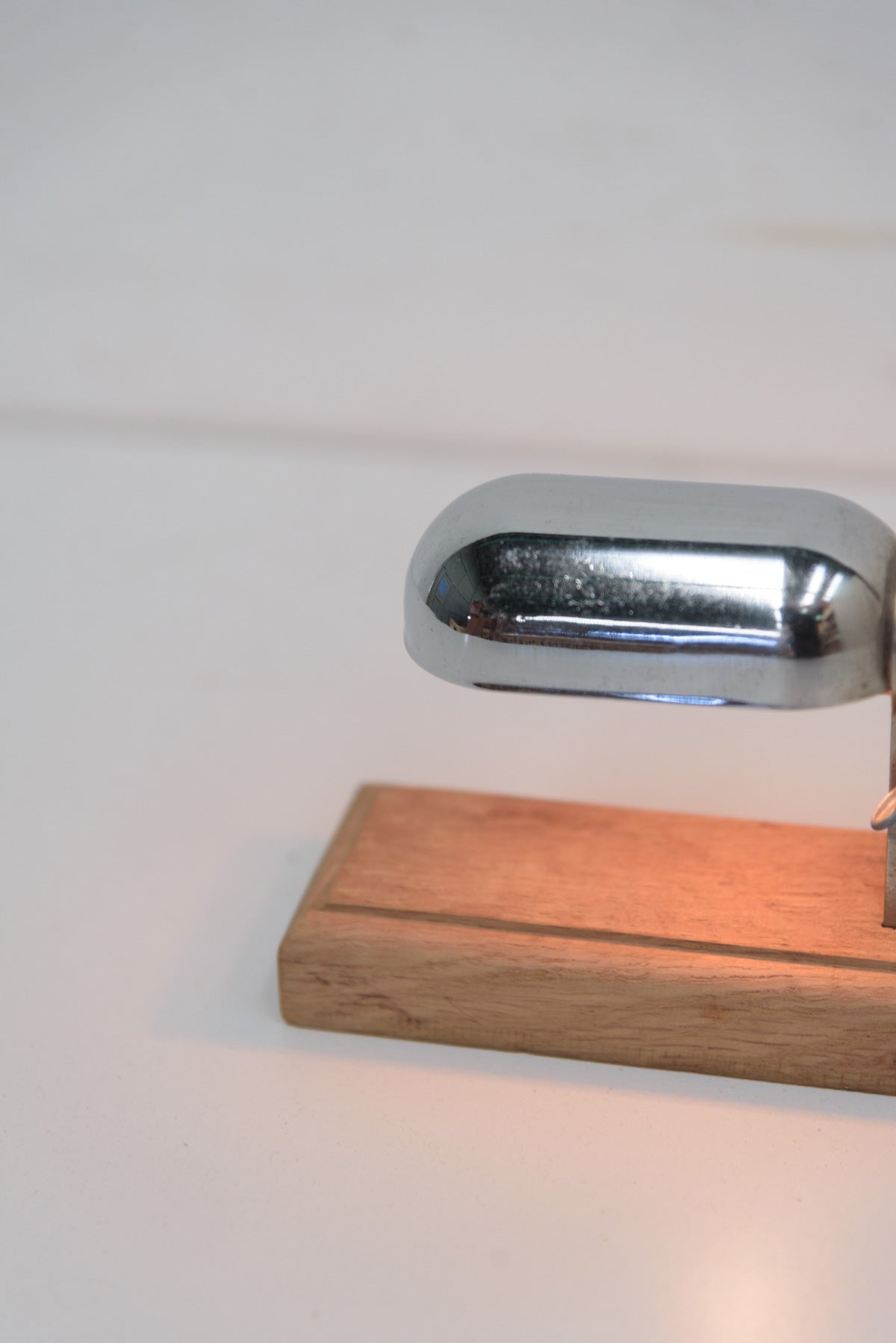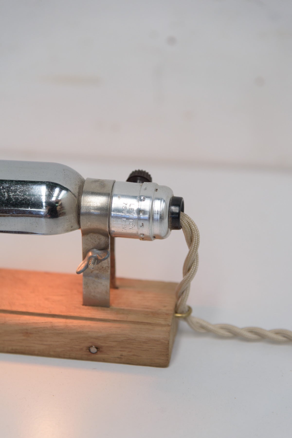 フランスの工業用ミシンに使われていたランプに、当方で木製のベースを取り付けています。口金は日本では珍しいB15 ですので明るさは20Wまでです。
