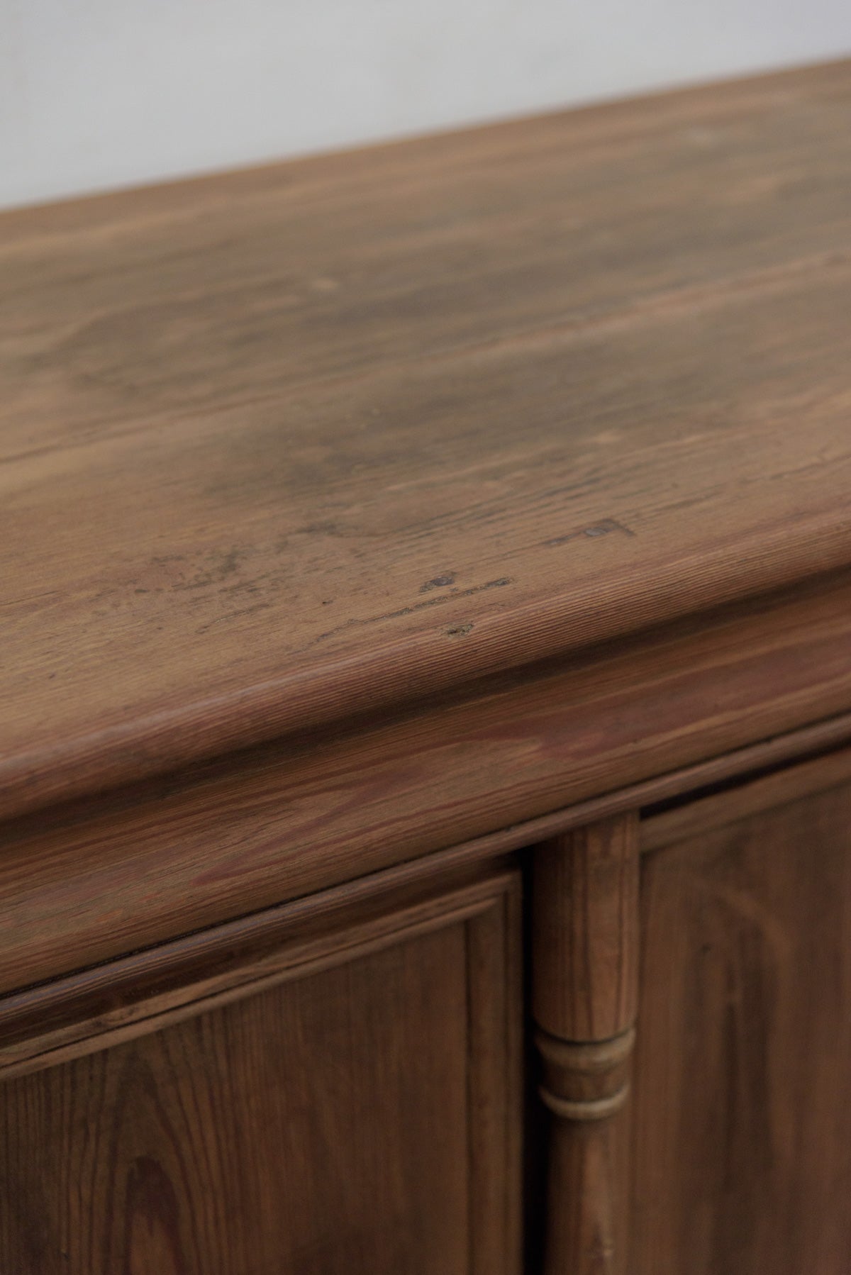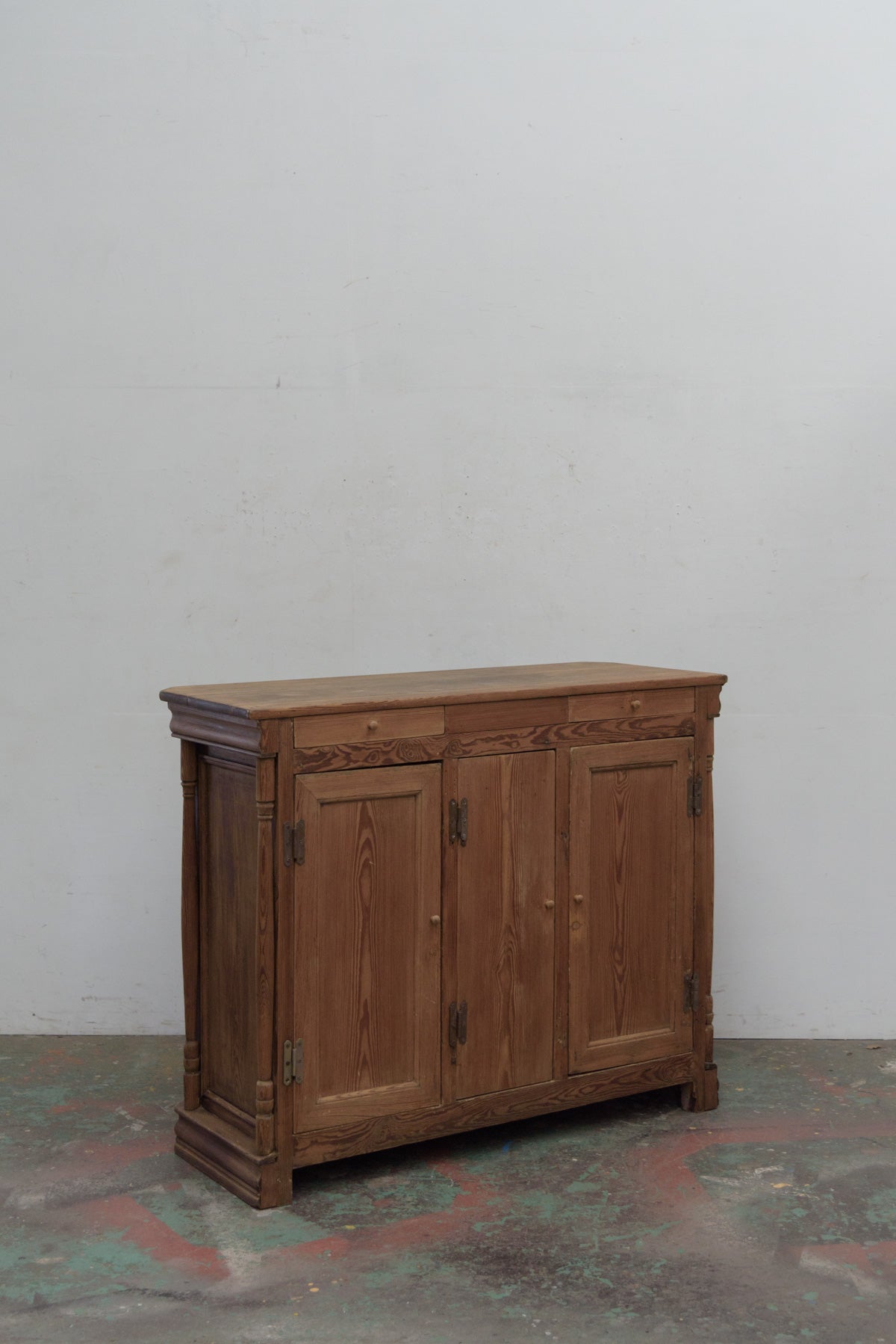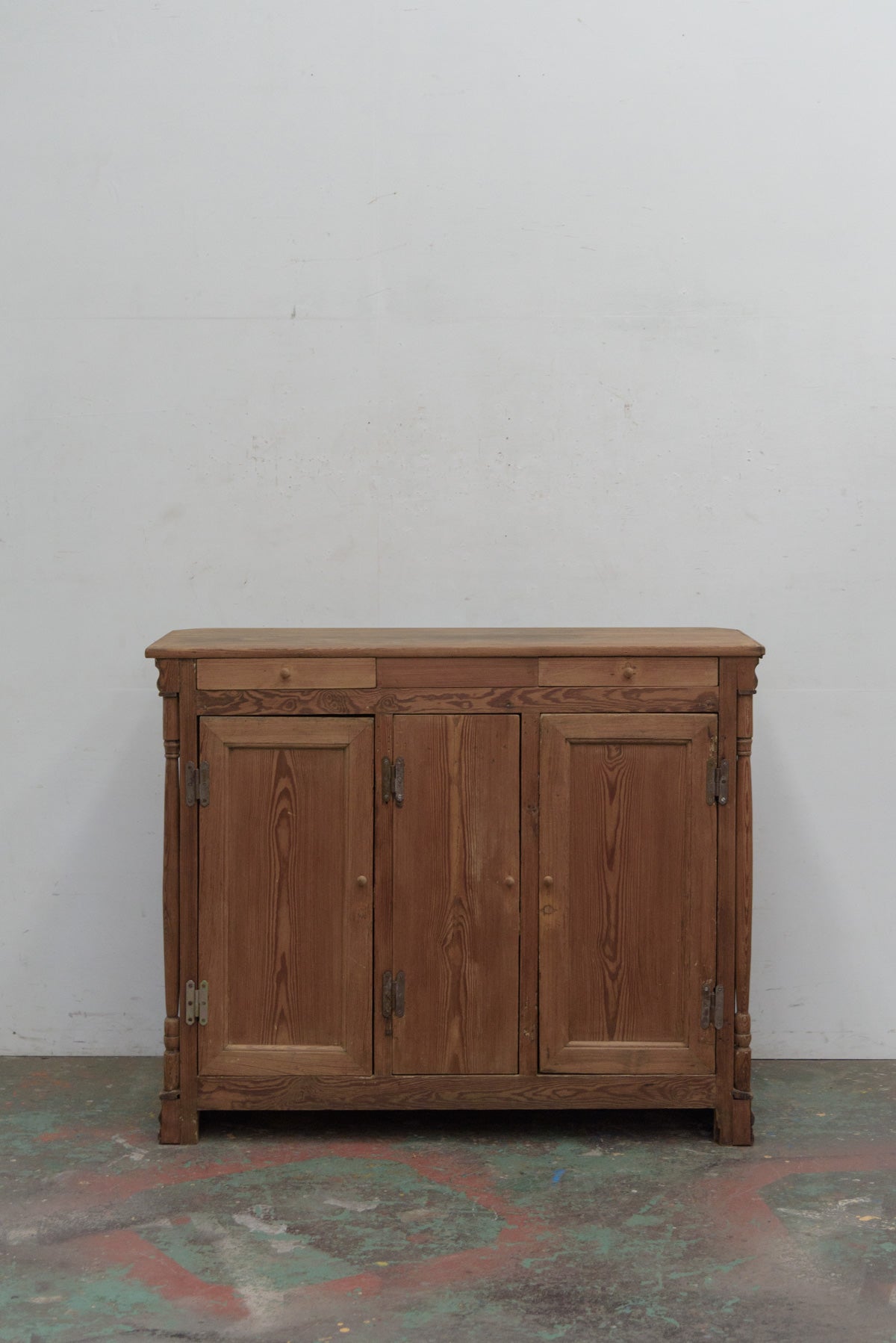 クラシックな装飾入りですが、すっきりとしたたたずまい。3枚扉に引き出しも付いていて、収納家具としてもしっかり実用できます。扉や引き出しの動きも問題なく、棚板はすべて取り外せます。