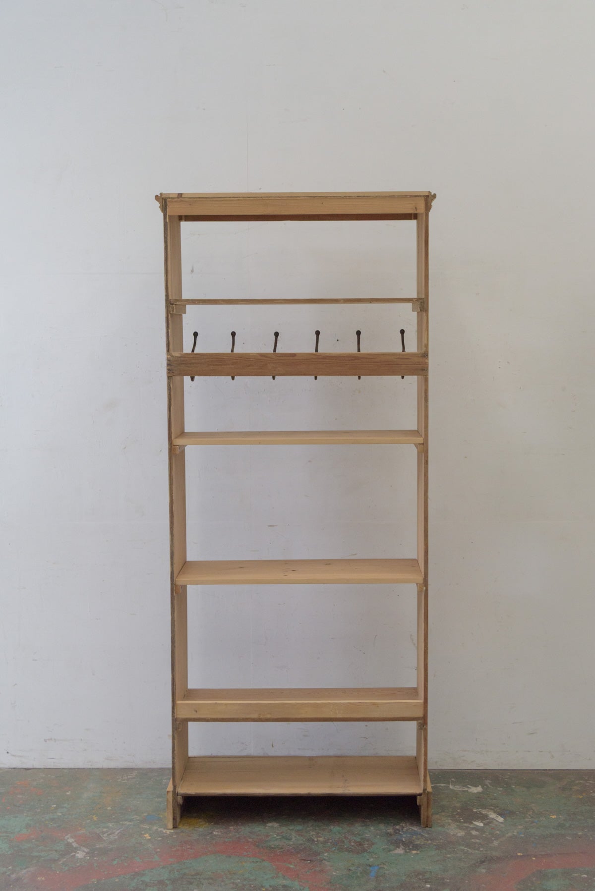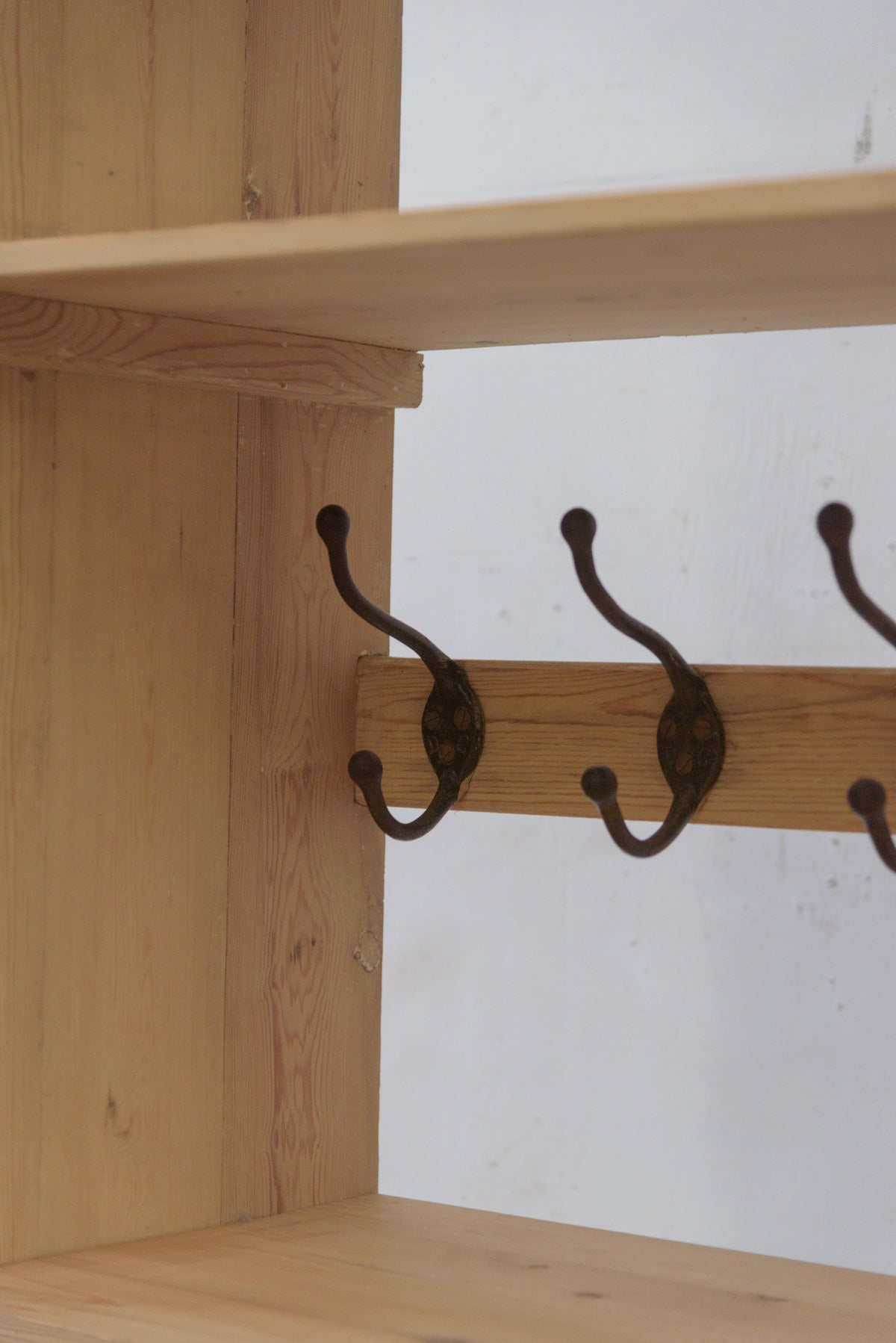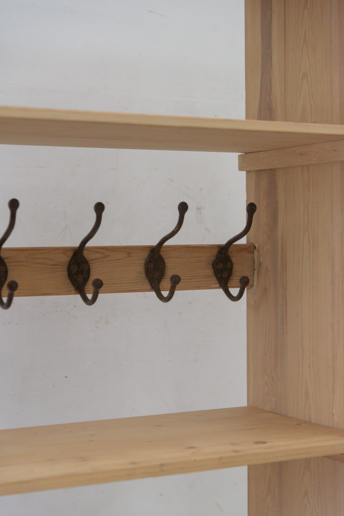 上から2,3段目の棚板は取り外せますので、コートハンガーとしてもお使いいただけます。材質はパイン、フックは鉄製です。